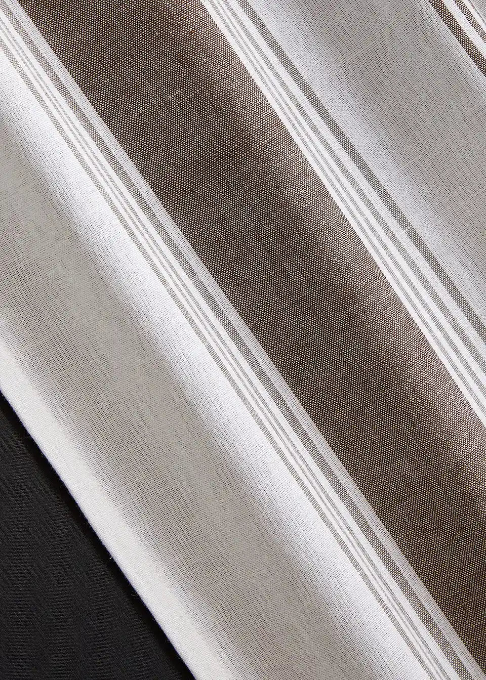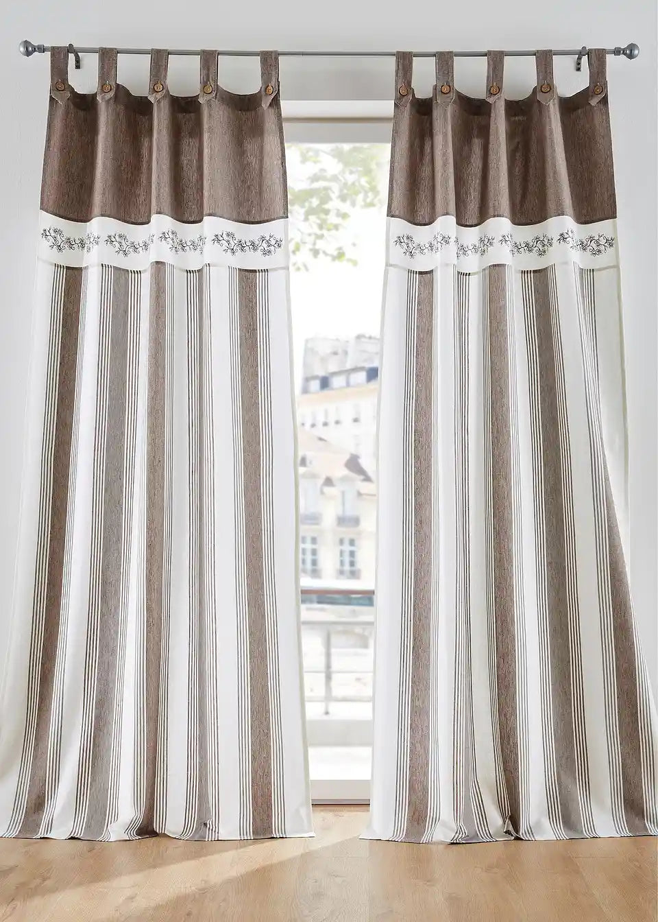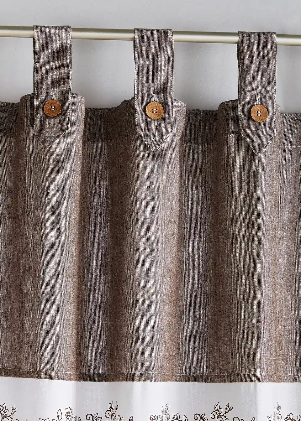 Zavesa iz organskega bombaža v rustikalnem slogu, z natisnjeno obrobo in tkanimi črtami.