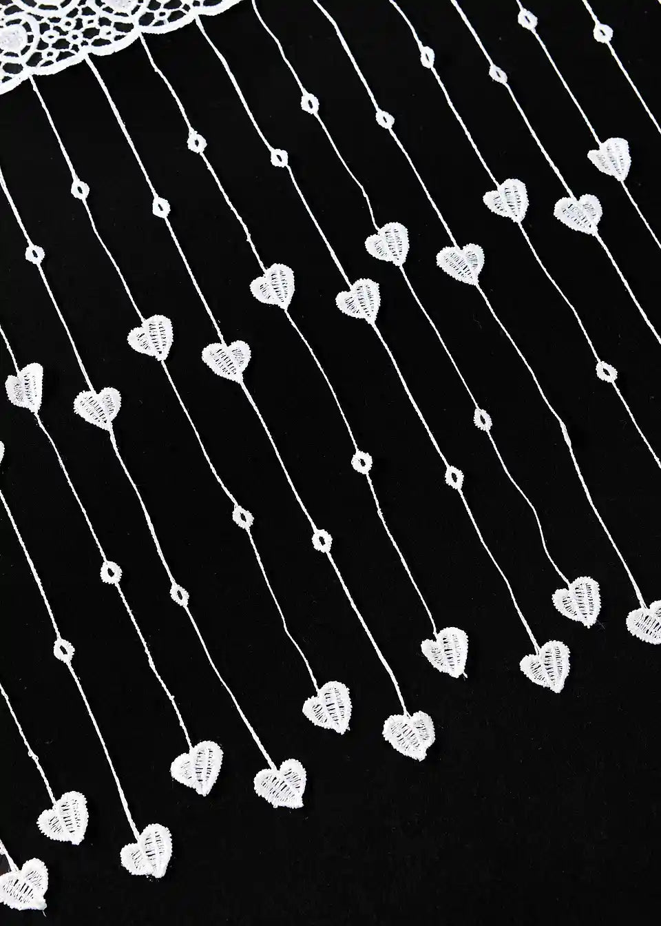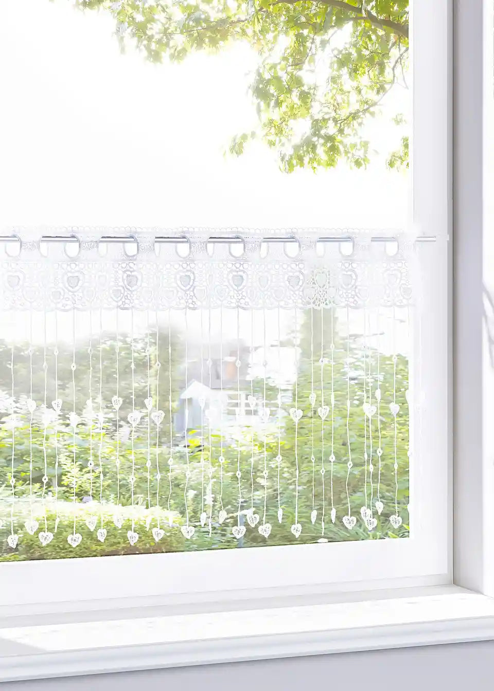 Privlačna prozorna zavesa z vezene niti z motivom src in lepim kvačkanim robom. Primerna za palice s premerom do 3 cm.