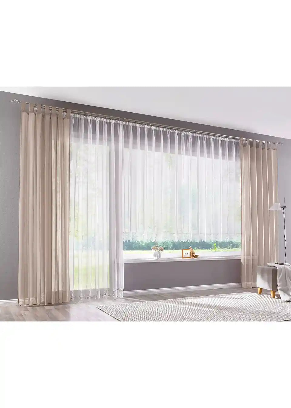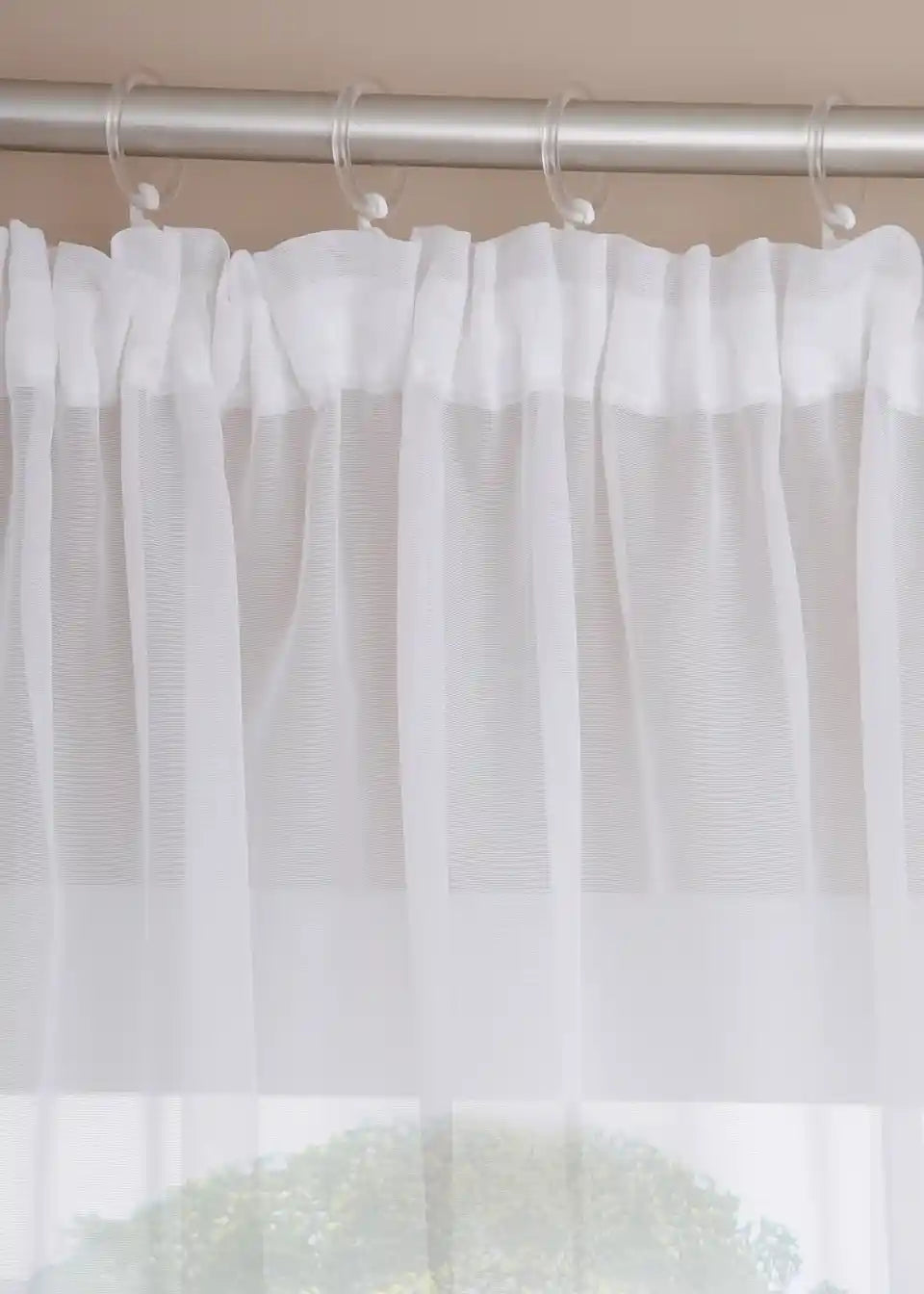 Zavesa izstopa s svojo preprosto eleganco. Izdelana je iz bele, prosojne voile kakovosti in ima za glavni poudarek elegantno, visokokakovostno čipkasto obrobo. Z zaveso imaš veliko možnosti kombiniranja z obstoječimi zavesami, da svojim oknom dodaš nov okvir. Navedene mere so mere tkanine. Priporočamo naročilo 3-kratne širine okna, da bi se zavesa optimalno dekorirala z nabiranjem.