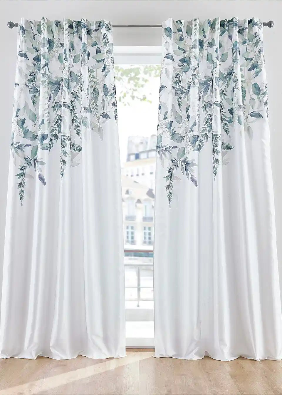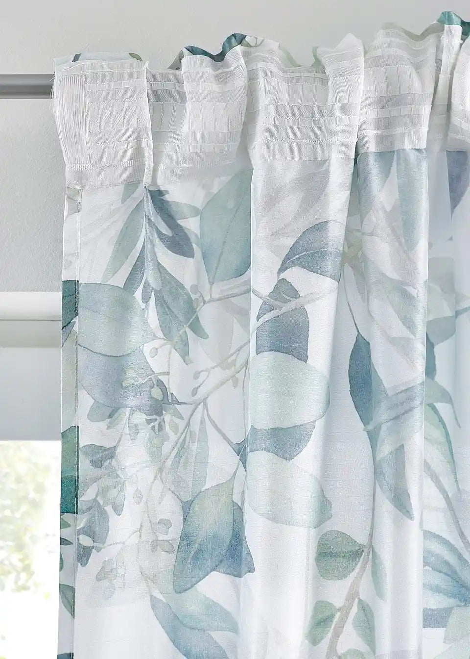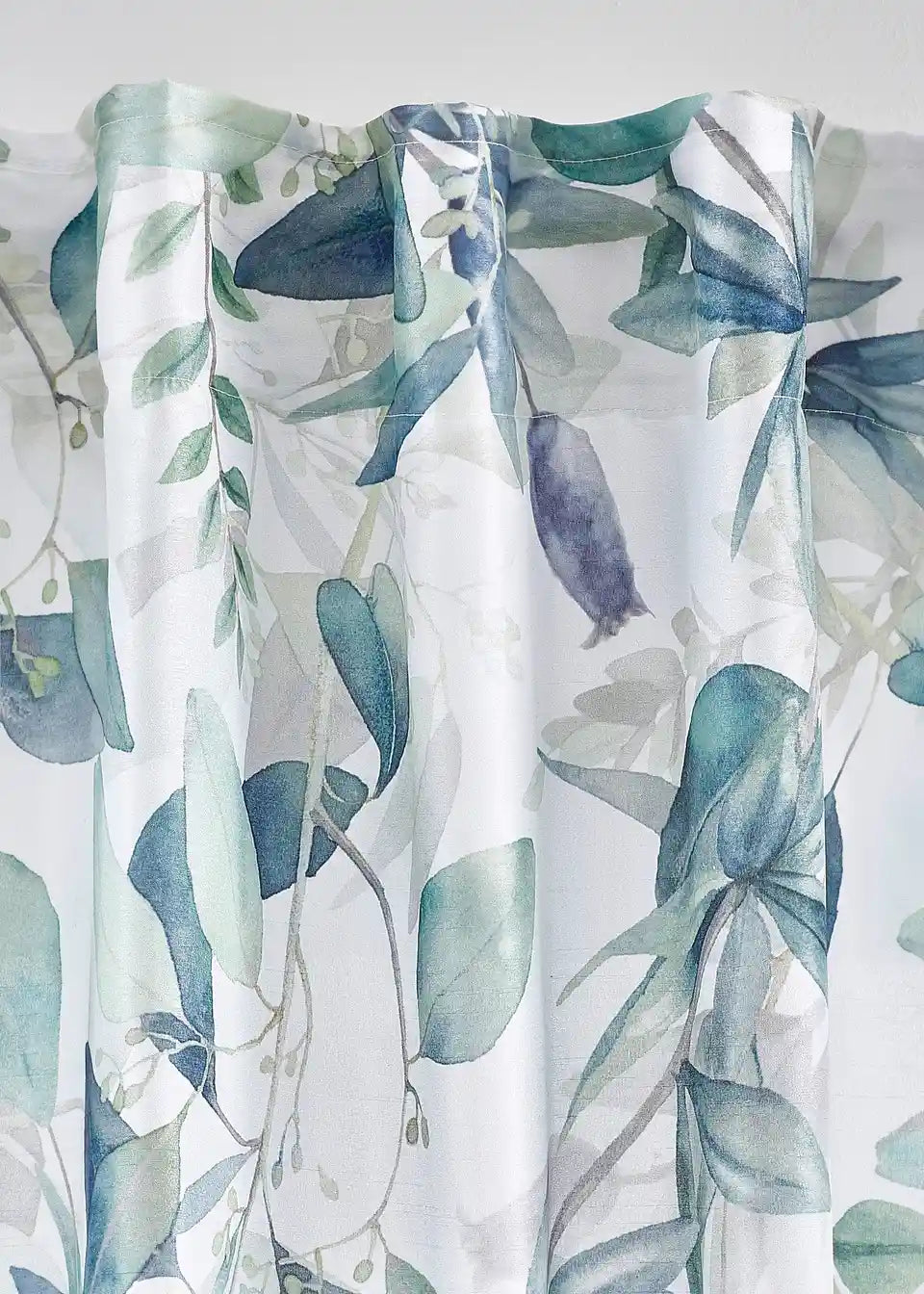 Elegantna zavesa z naravnim videzom in čudovitim listnim potiskom, ki poteka od zgoraj navzdol. To daje prefinjen videz, zahvaljujoč kakovostnemu materialu v svilenem videzu. Zavesa ima zaradi tega rahel sijaj in popestri tvoje okno.