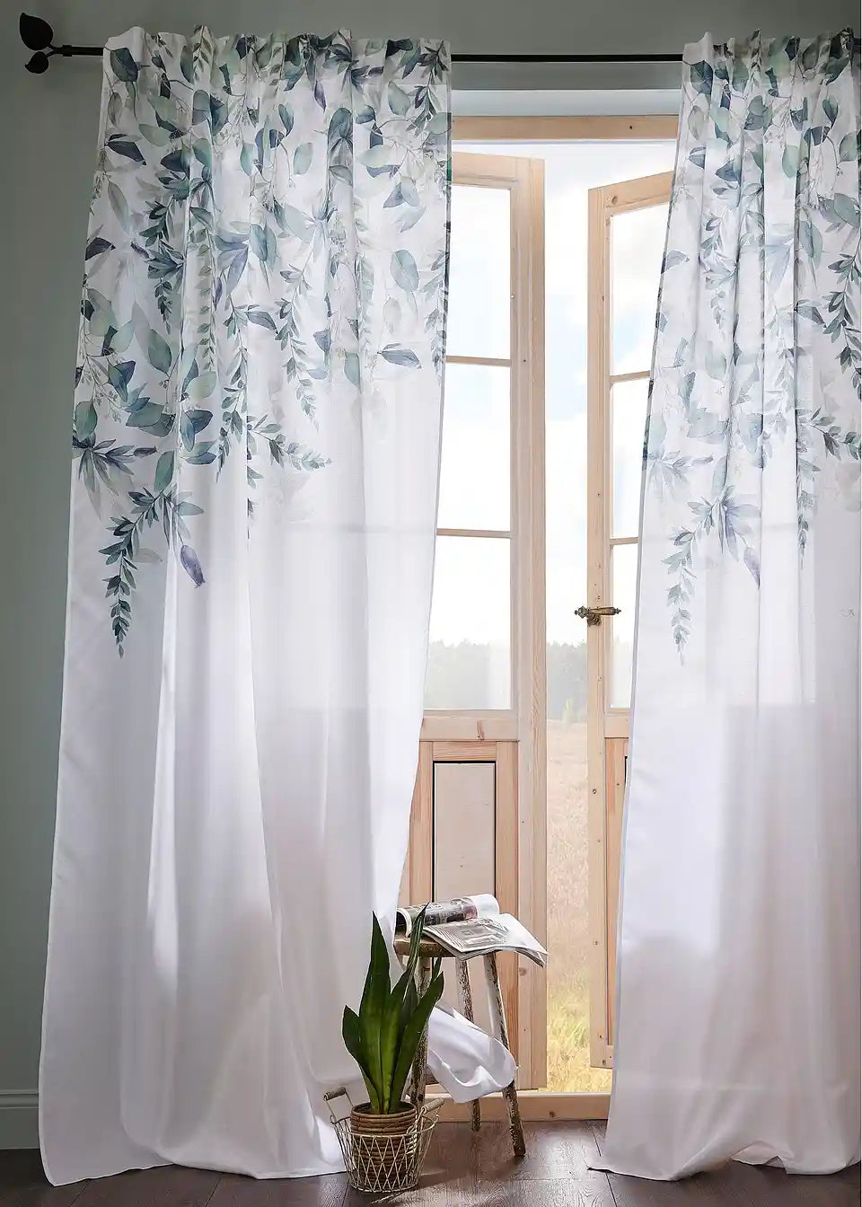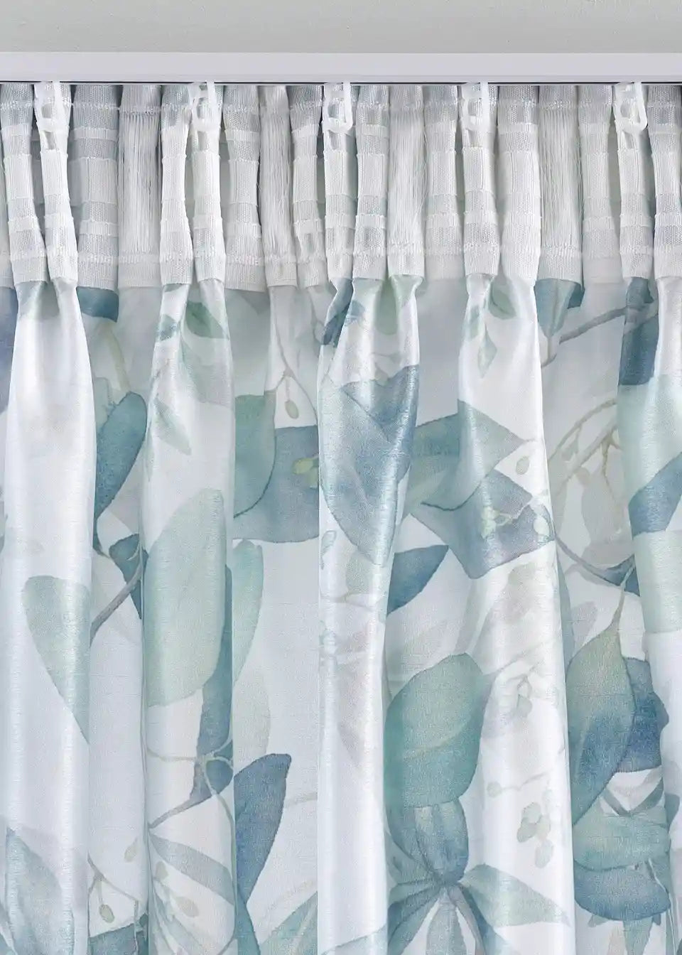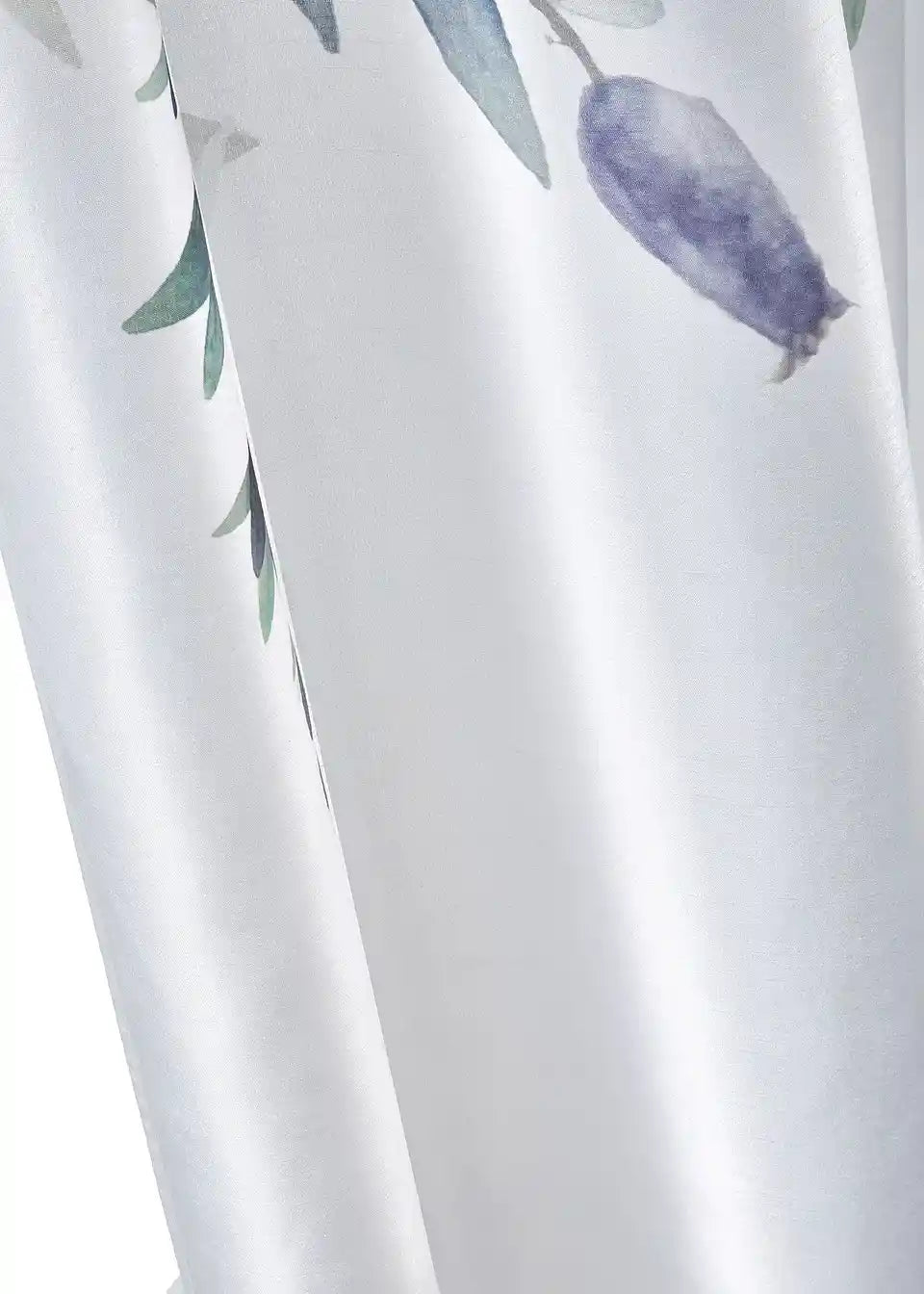 Elegantna zavesa z naravnim videzom in čudovitim listnim potiskom, ki poteka od zgoraj navzdol. To daje prefinjen videz, zahvaljujoč kakovostnemu materialu v svilenem videzu. Zavesa ima zaradi tega rahel sijaj in popestri tvoje okno.