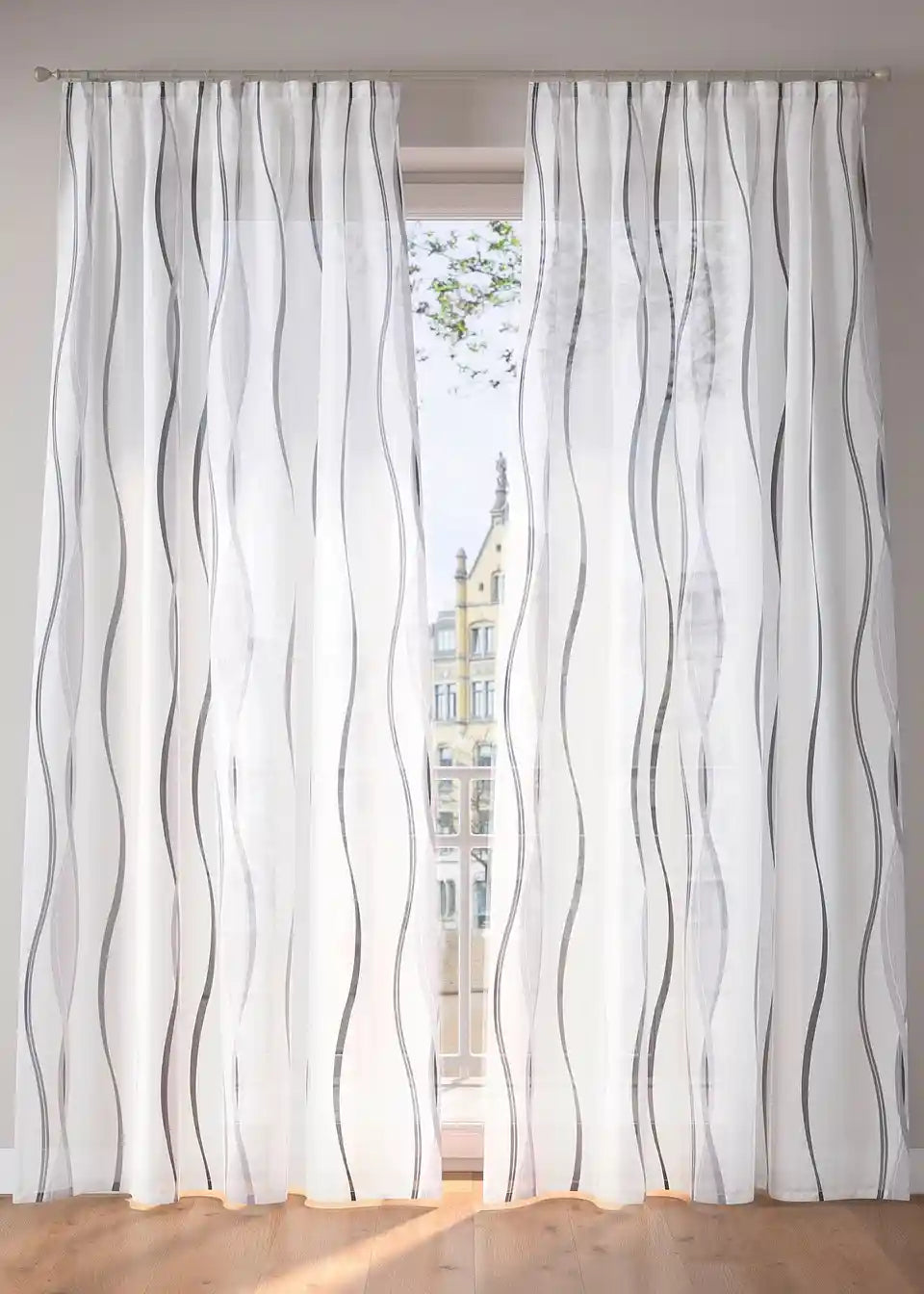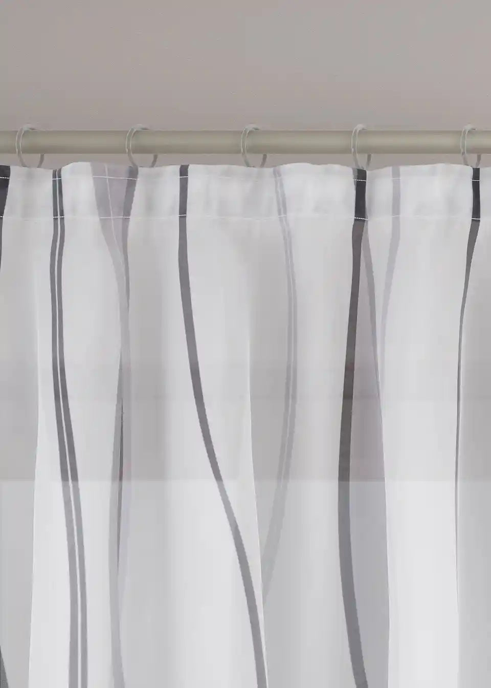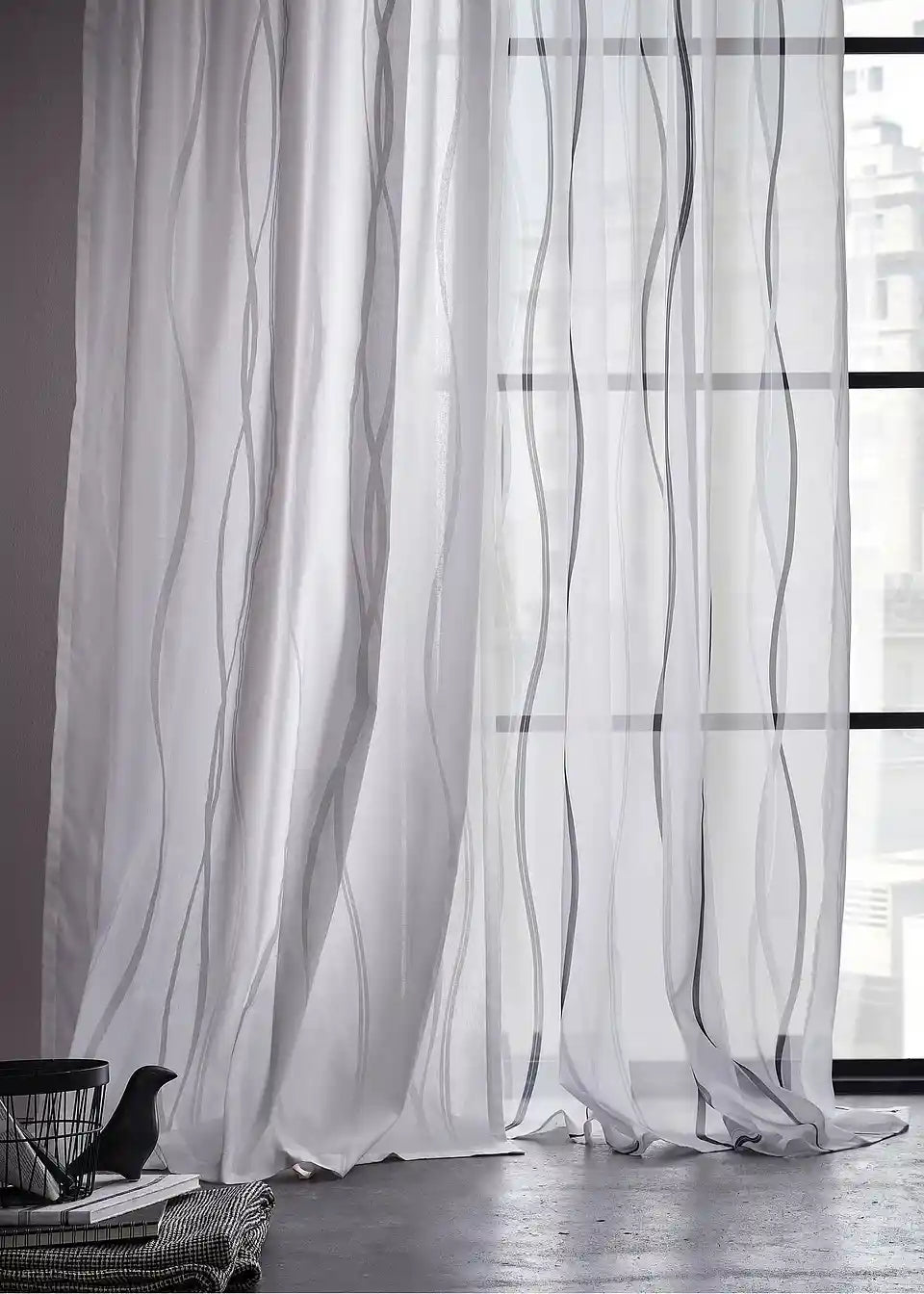 Polprosojna zavesa v kremno-/beli osnovi z barvnimi poudarki, na voljo v privlačnih barvnih različicah, iz lahkotne tkanine voile. Odlična za kombiniranje! Zavesa je vsestranska, saj se prilega številnim notranjim opremam in ima brezčasen dizajn.
