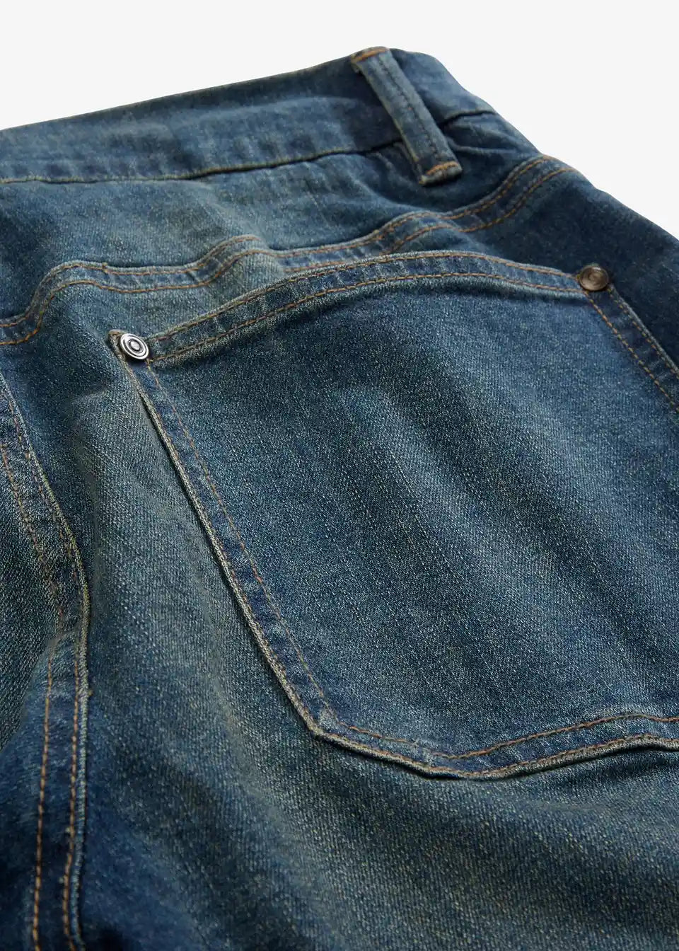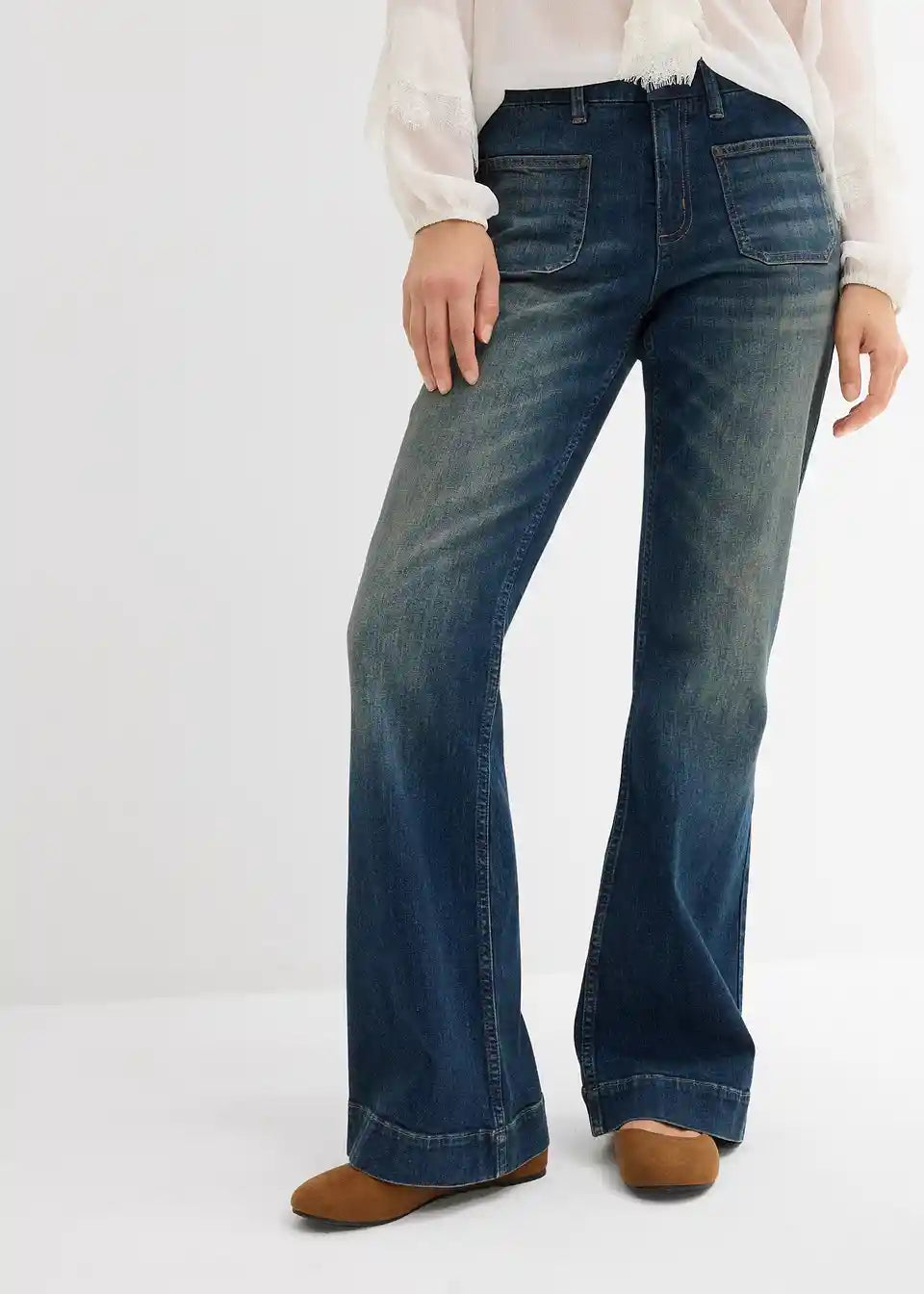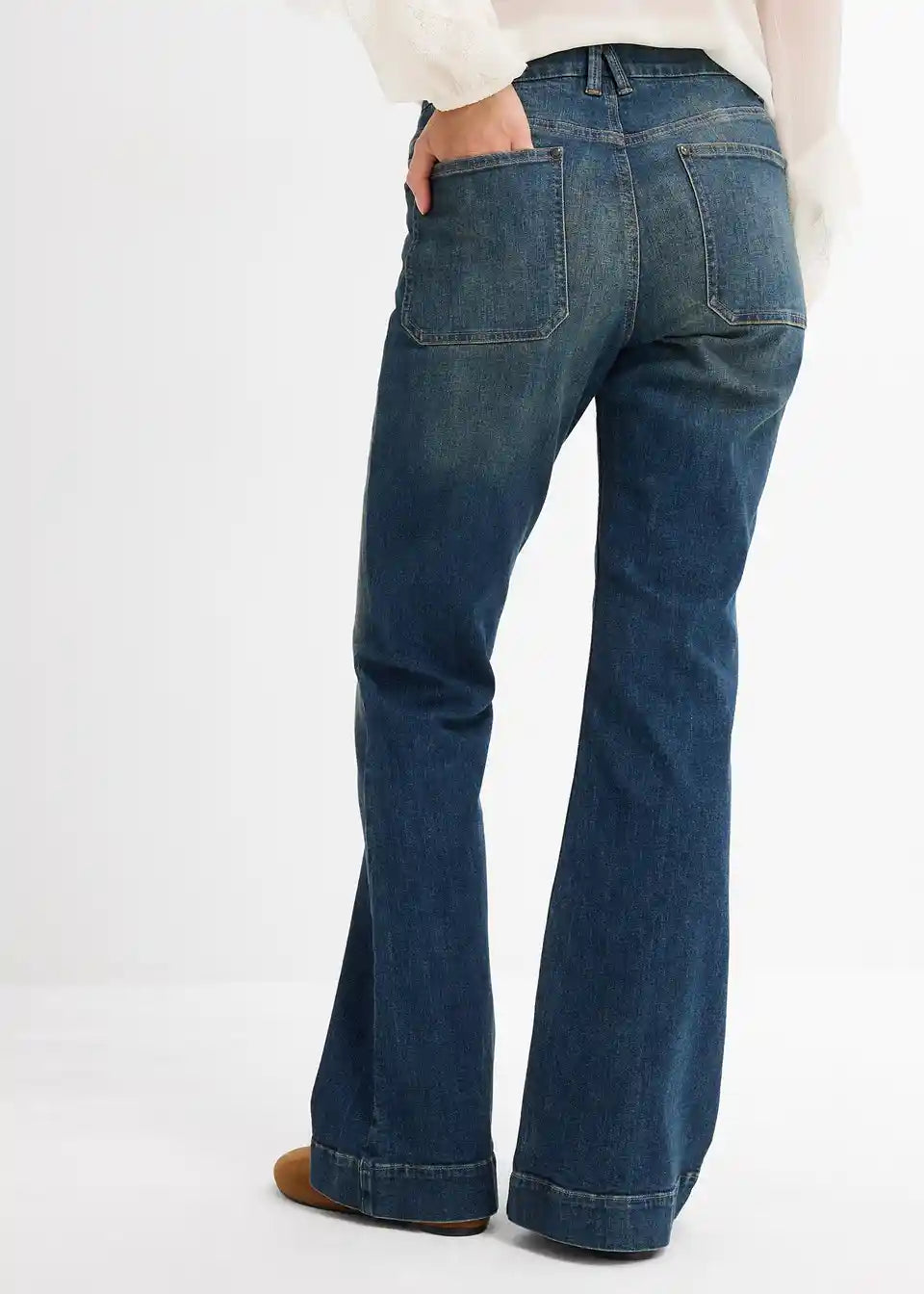Kavbojke na zvonec s 5 žepi iz čvrstega bombažnega denima, ki je na začetku nekoliko tog, z nošenjem pa postane mehkejši in bolj sproščen. Visok pas z zadrgo in gumbom. Dolga dolžina, ki na stopalu ustvari rahel nabran učinek. Te jeans hlače imajo zaradi spranega videza moderen ponošen učinek. Rahlo razbarvanje med nošenjem in pranjem je značilno za te kavbojke. Dolžina v koraku pri velikosti 42 ca. 80,5 cm. Strojno pranje.