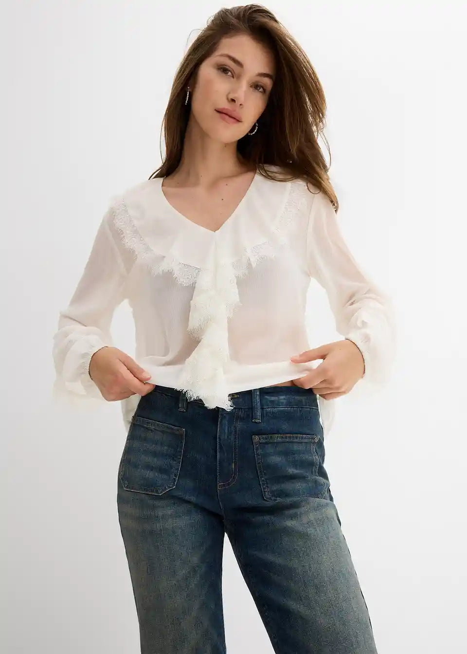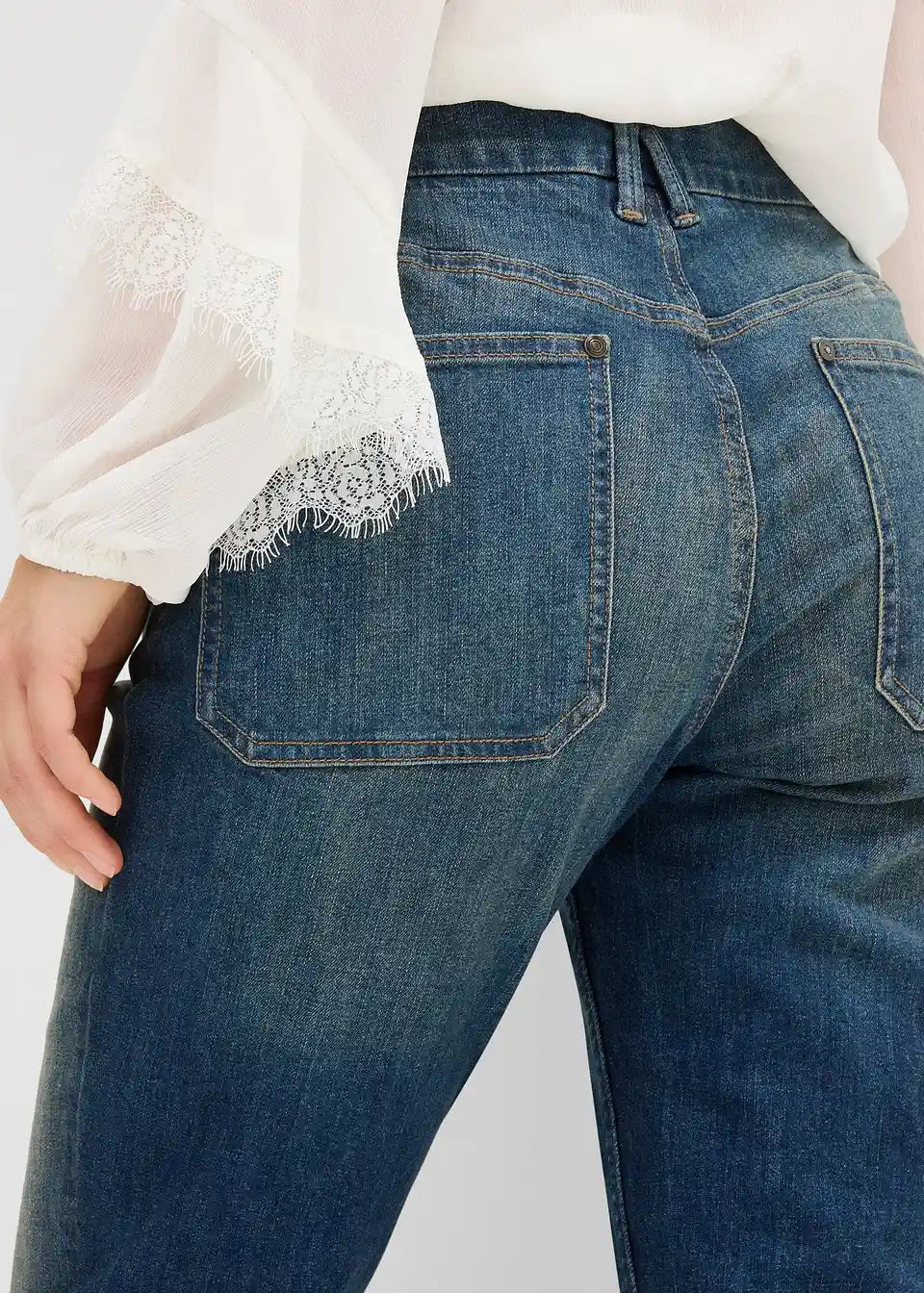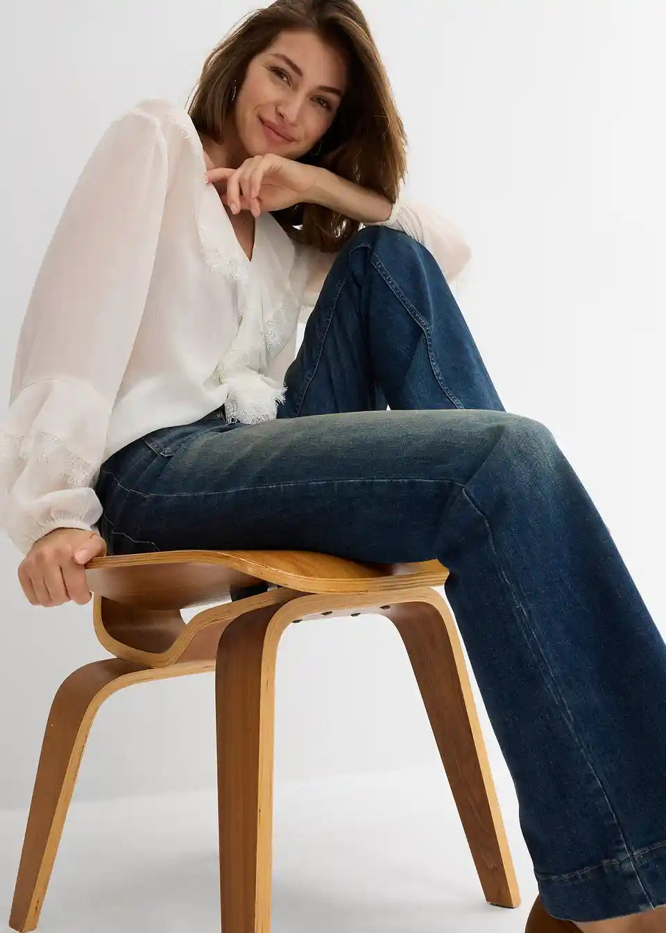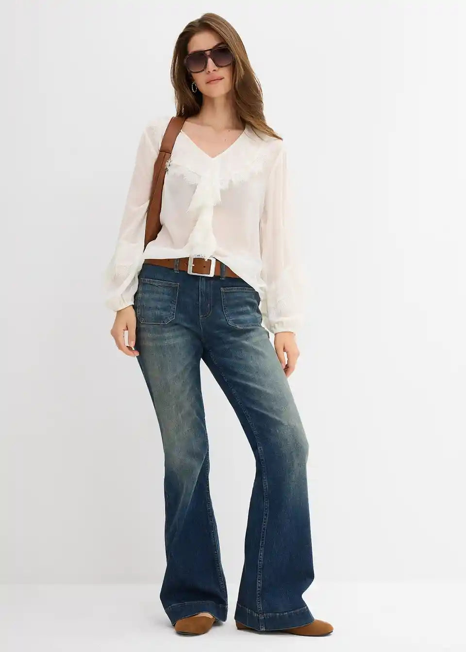 Kavbojke na zvonec s 5 žepi iz čvrstega bombažnega denima, ki je na začetku nekoliko tog, z nošenjem pa postane mehkejši in bolj sproščen. Visok pas z zadrgo in gumbom. Dolga dolžina, ki na stopalu ustvari rahel nabran učinek. Te jeans hlače imajo zaradi spranega videza moderen ponošen učinek. Rahlo razbarvanje med nošenjem in pranjem je značilno za te kavbojke. Dolžina v koraku pri velikosti 42 ca. 80,5 cm. Strojno pranje.