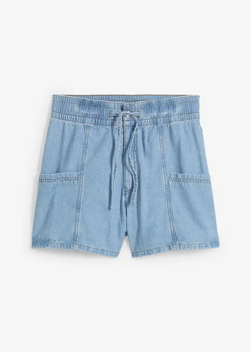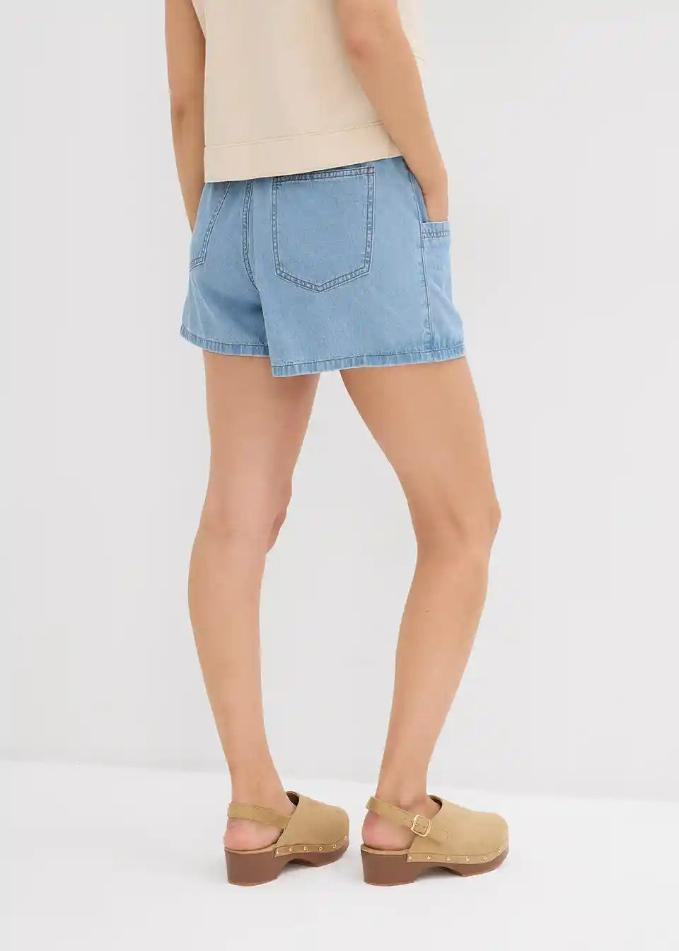 Ohlapne 5-žepne kratke hlače z elastičnim udobnim pasom iz čvrstega bombažnega denima, ki je na začetku nekoliko tog, vendar z nošenjem postane mehkejši in bolj sproščen. Visok pas. Dolžina notranjega šiva v vel. 42 cca 10,5 cm, pralno v pralnem stroju.