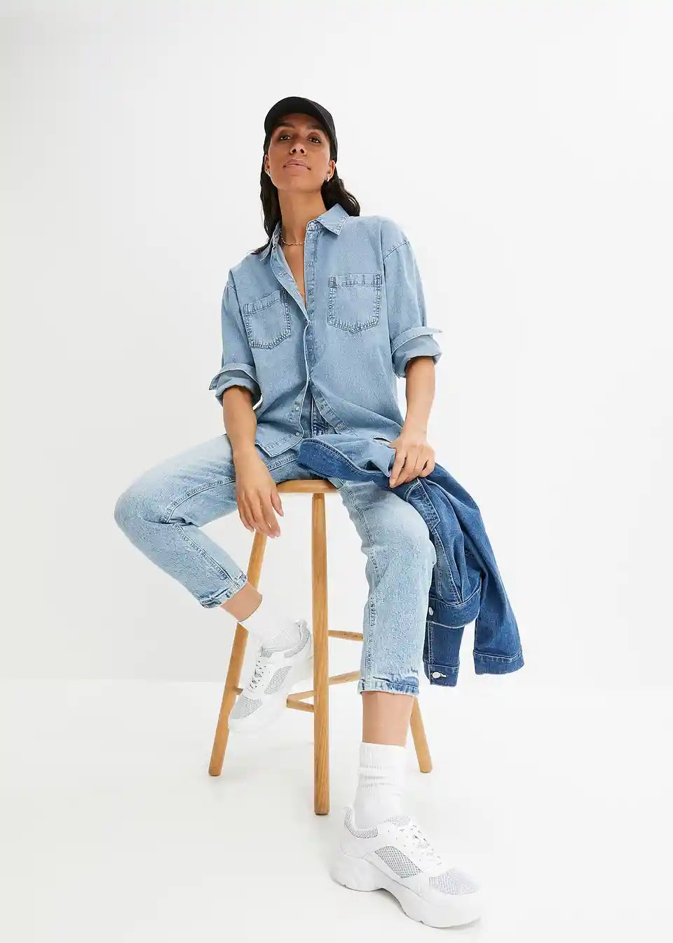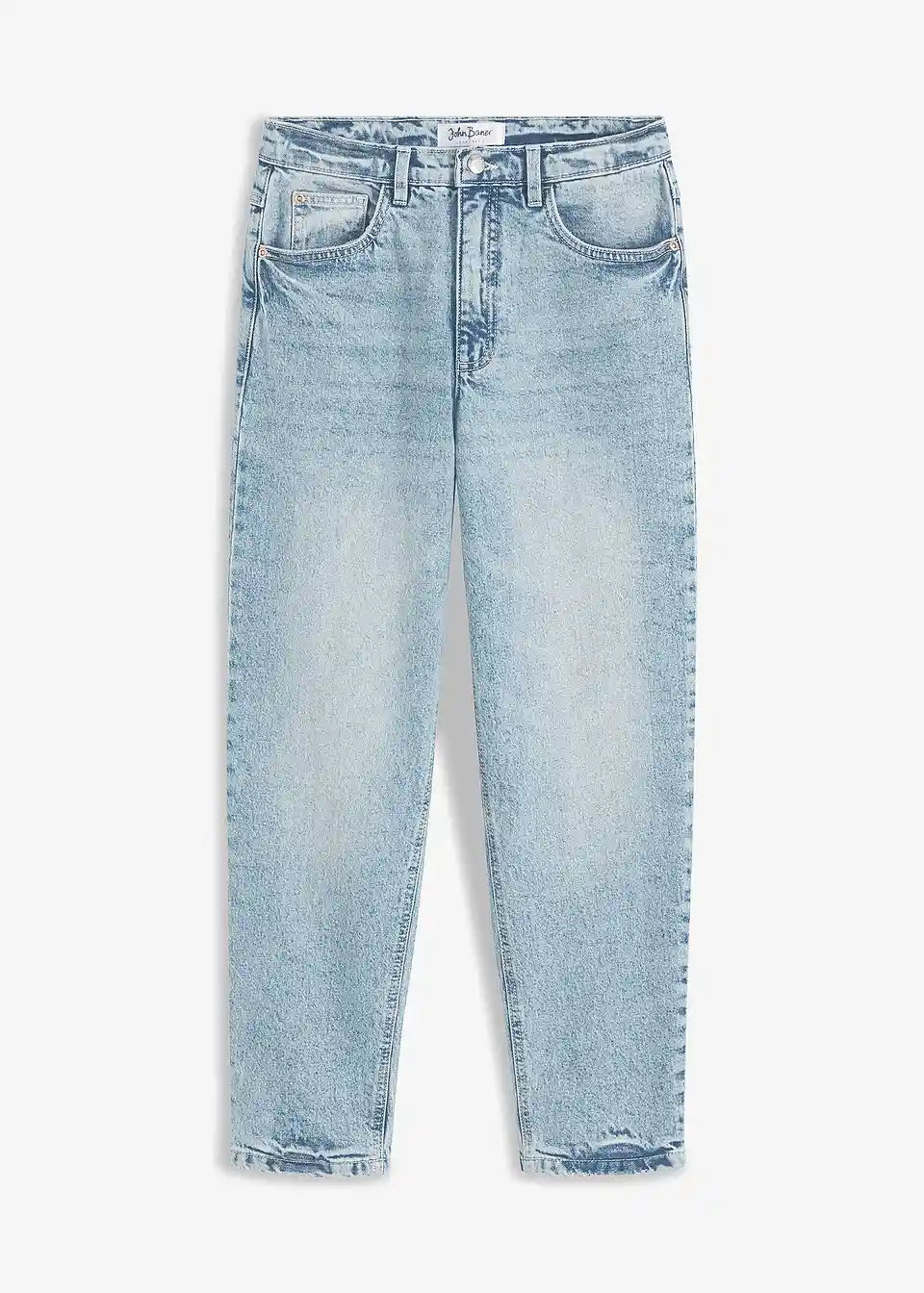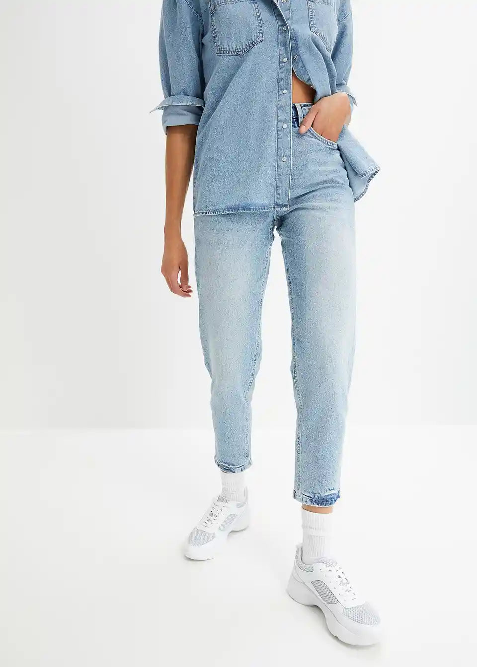Mom kavbojke z visokim pasom iz trpežnega bombažnega denima, ki je sprva nekoliko tog in z rednim nošenjem postaja mehkejši in bolj sproščen.