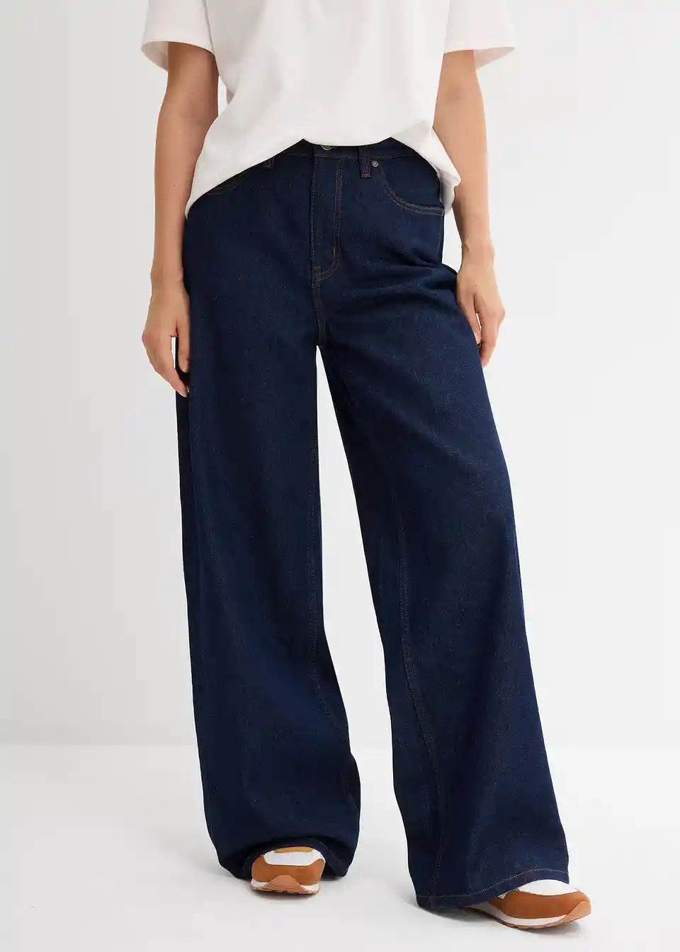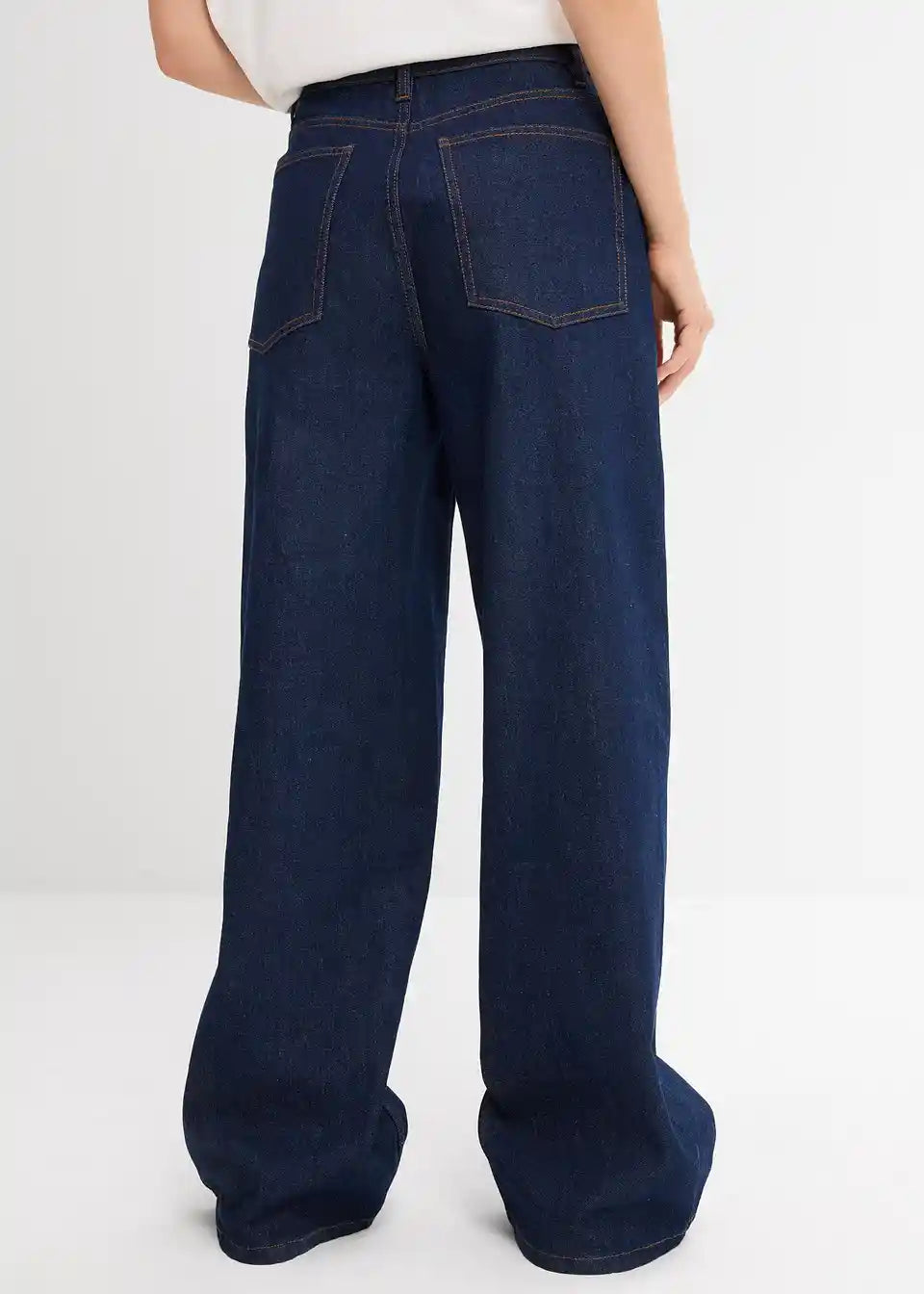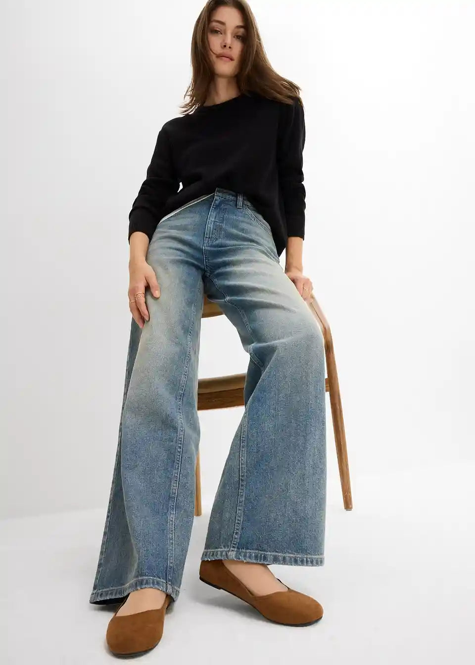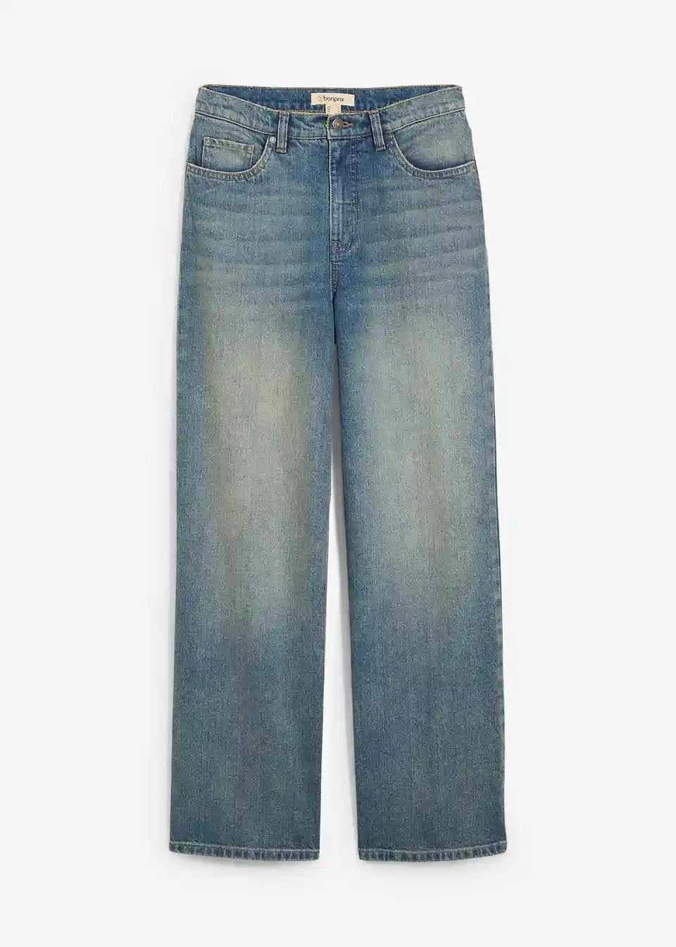 Široke 5-žepne kavbojke iz trpežnega bombažnega denima, ki je sprva nekoliko tog in z nošenjem postane mehkejši in bolj udoben. Visok pas z zadrgo in gumbom. Dolga dolžina, ki pri stopalu ustvari rahel stacking učinek. Zaradi spranega videza imajo te kavbojke modni used efekt. Rahlo puščanje barve pri nošenju in pranju je značilno za te kavbojke. Notranja dolžina hlačnice v št. 42 cca 78,5 cm, primerno za pranje v pralnem stroju.