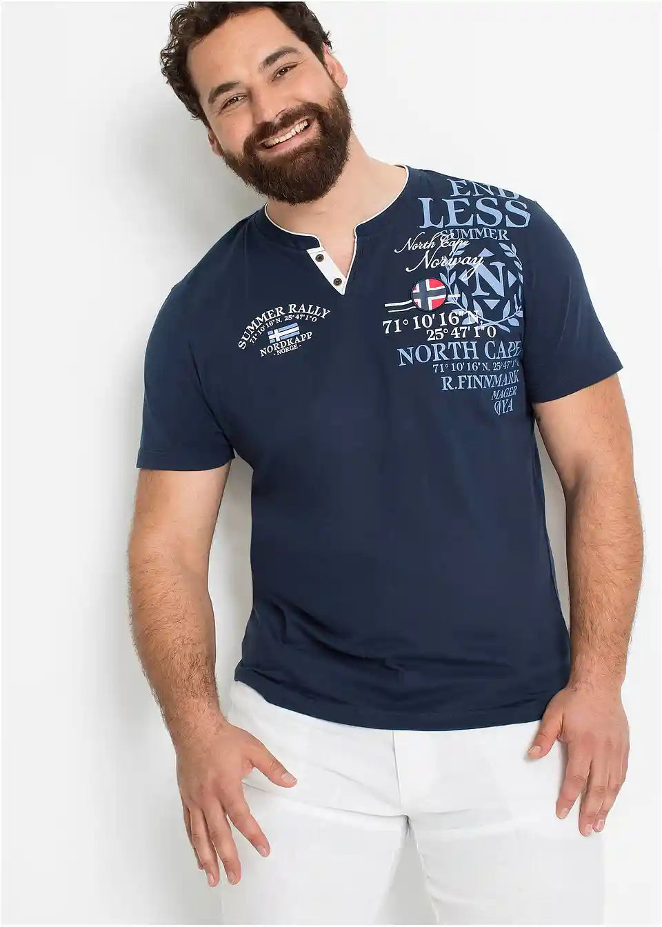 Elegantna spremljevalka za številne priložnosti je ta moška majica v kroju Regular Fit znamke bpc selection. Dekorativni napisi in našitki v pomorskem videzu dajejo modelu dovršen videz. Zelo lepi detajli so pritiskači na kontrastno podloženem V-izrezu. Privlačna majica Regular Fit se lahko kombinira s kratkimi hlačami za zračne kombinacije. Z jeans hlačami ali chinos hlačami pa nastane urejena vsakodnevna garderoba, ki se odlično dopolnjuje s športnimi tekstilnimi supergami ali čolnarji.