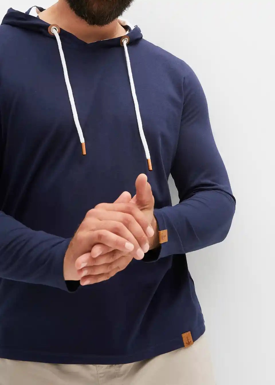 Čudovita majica z dolgimi rokavi, črtasto podlogo v kapuci ter lepimi detajli iz umetnega usnja. Strojno pranje
