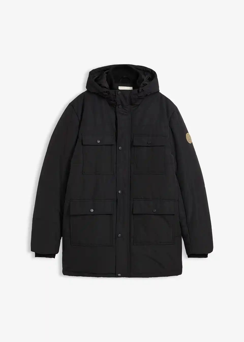 Lepa funkcijska parka z več žepi in etiketo na rokavih