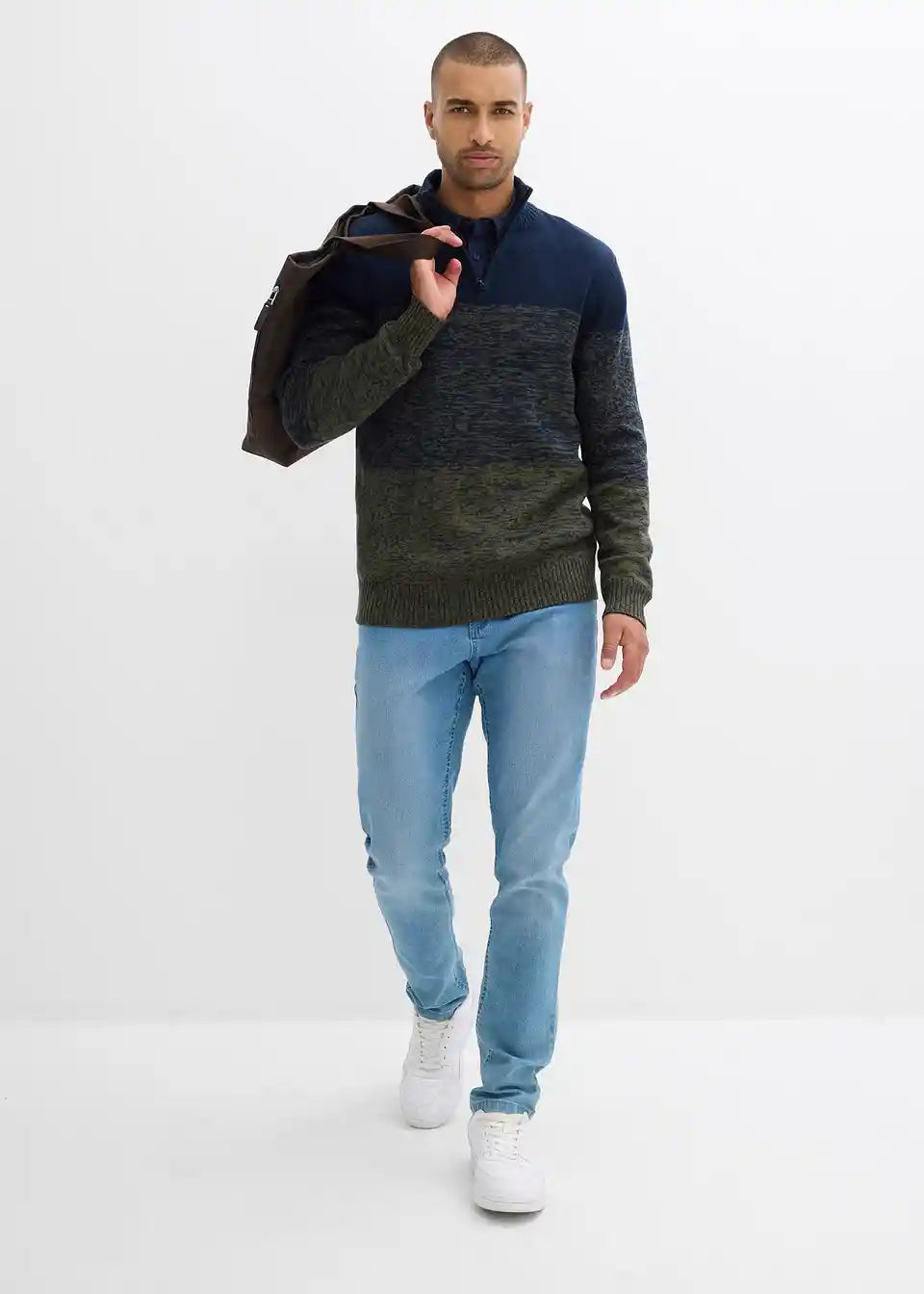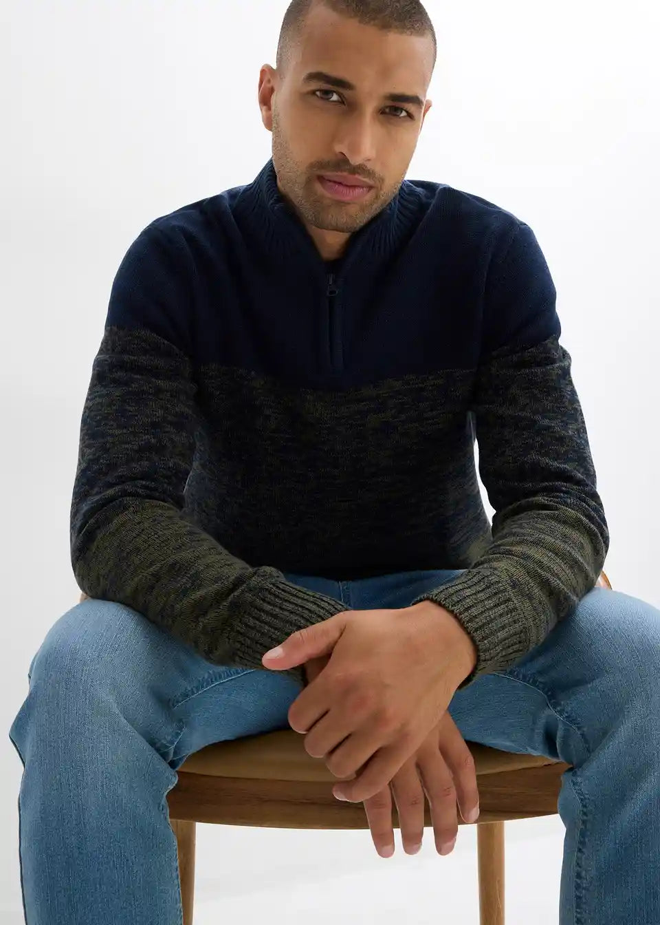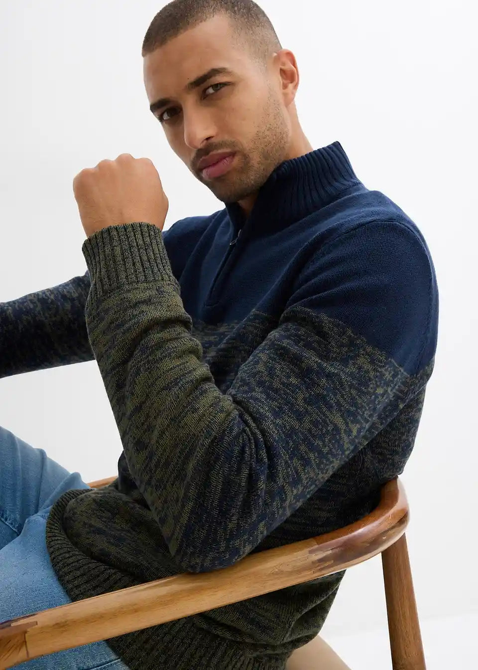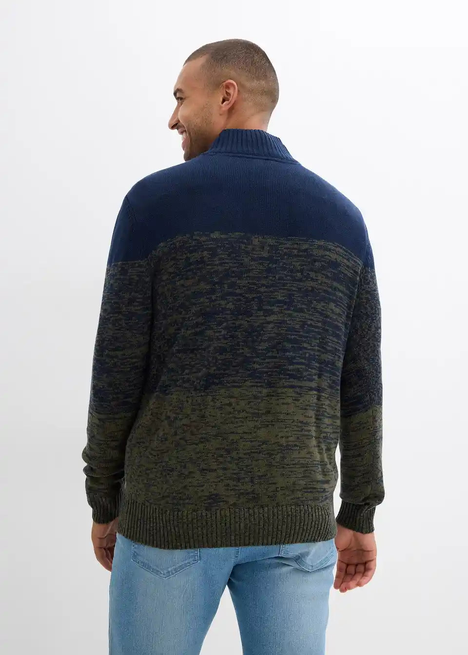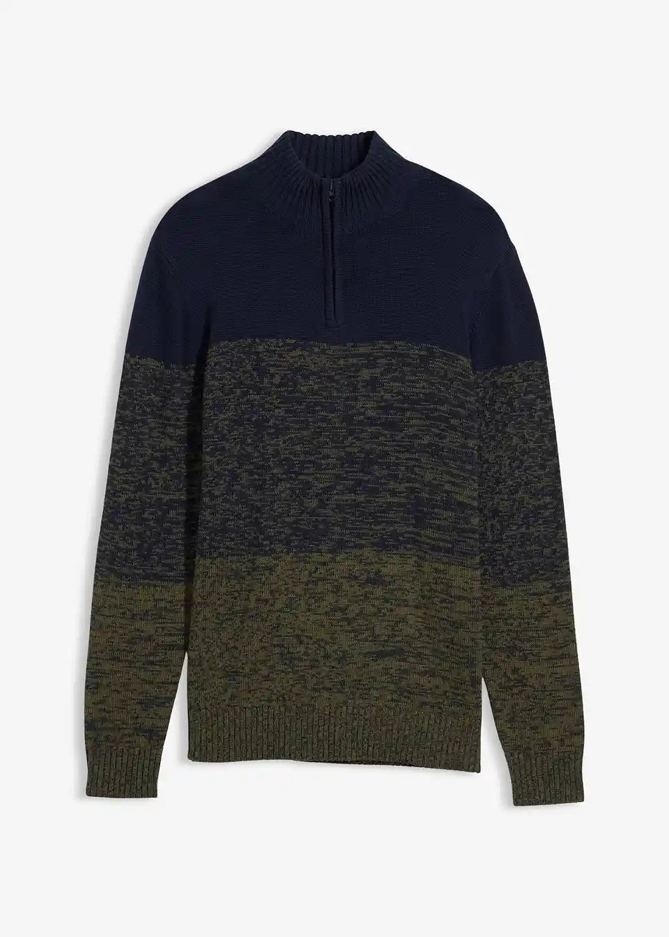 Zapovedan pulover s trojanskim ovratnikom z zadrgo in rebrastimi patentnimi obrobami na rokavih in na spodnjem robu