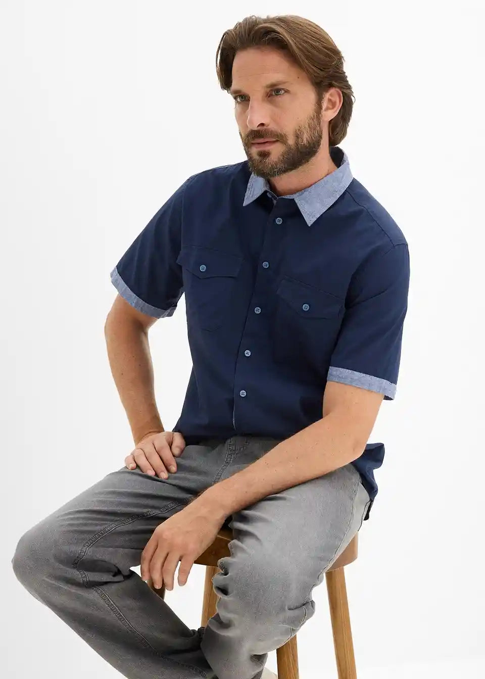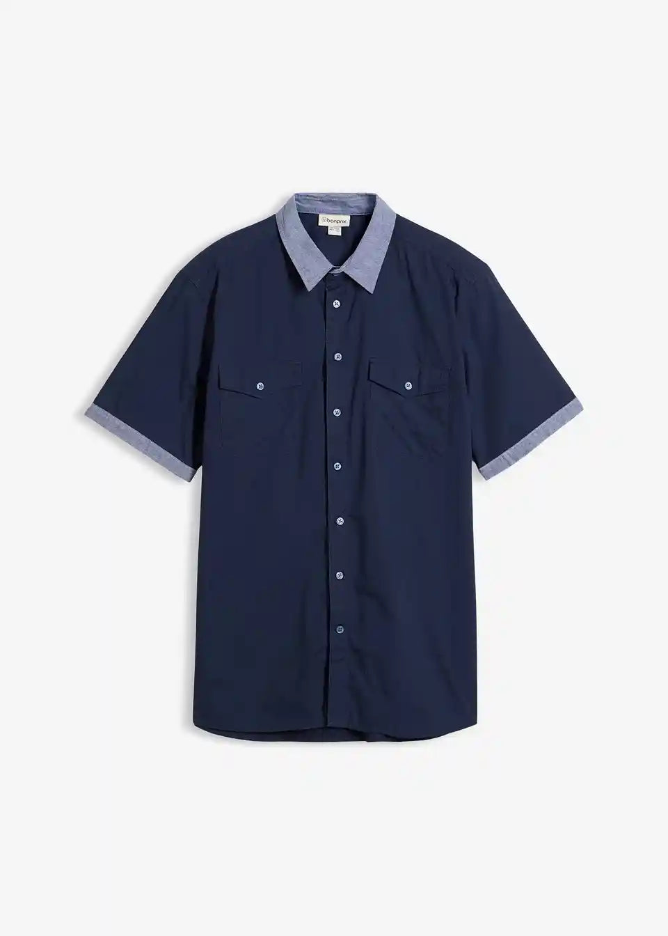 Moderna srajca s kratkimi rokavi v klasičnem kroju z barvno kontrastnimi gumbi in dvema naprsnima žepoma