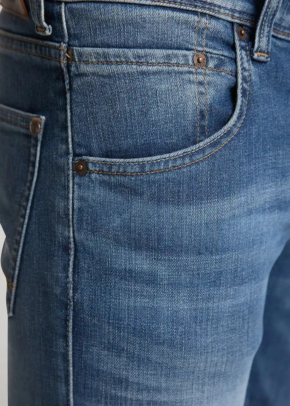 Izjemno Mustang kavbojke s ponošenimi spranimi predeli in nakazanimi ponošenimi gubami