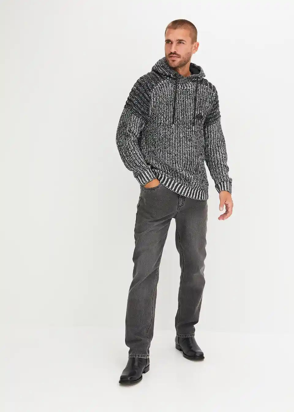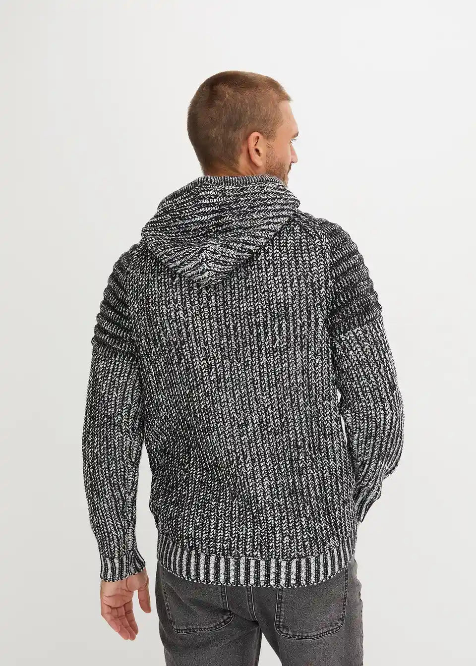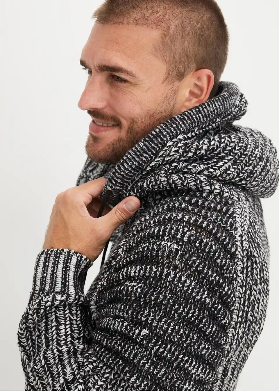 Grobo pleten pulover s kapuco in motorističnimi detajli