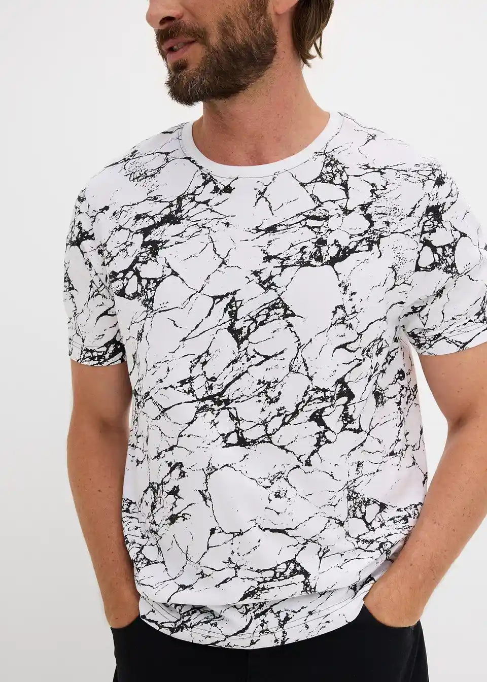 Modna T-Shirt majica v klasičnem kroju s frajerskim potiskom po celem za trenden, opazen videz