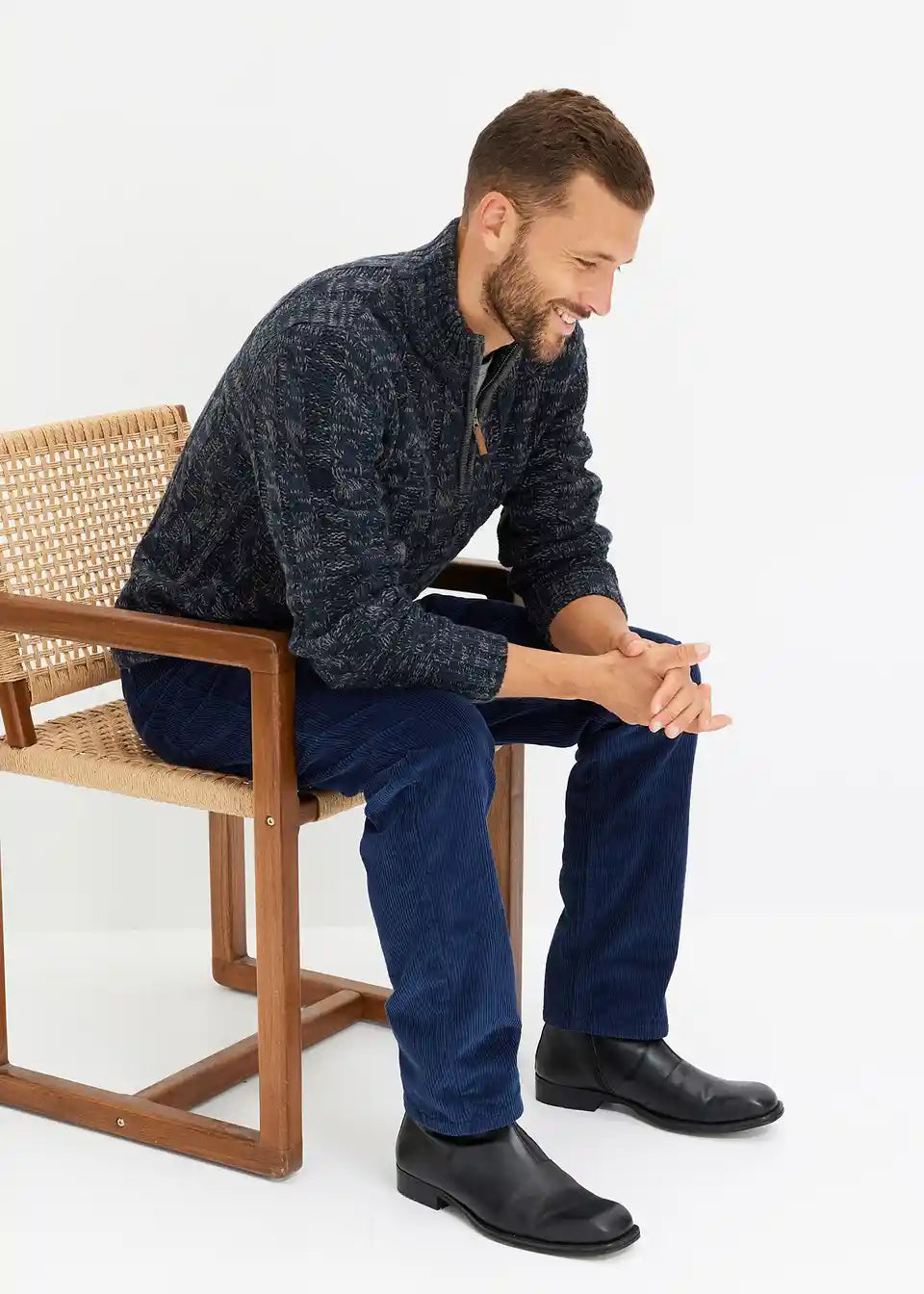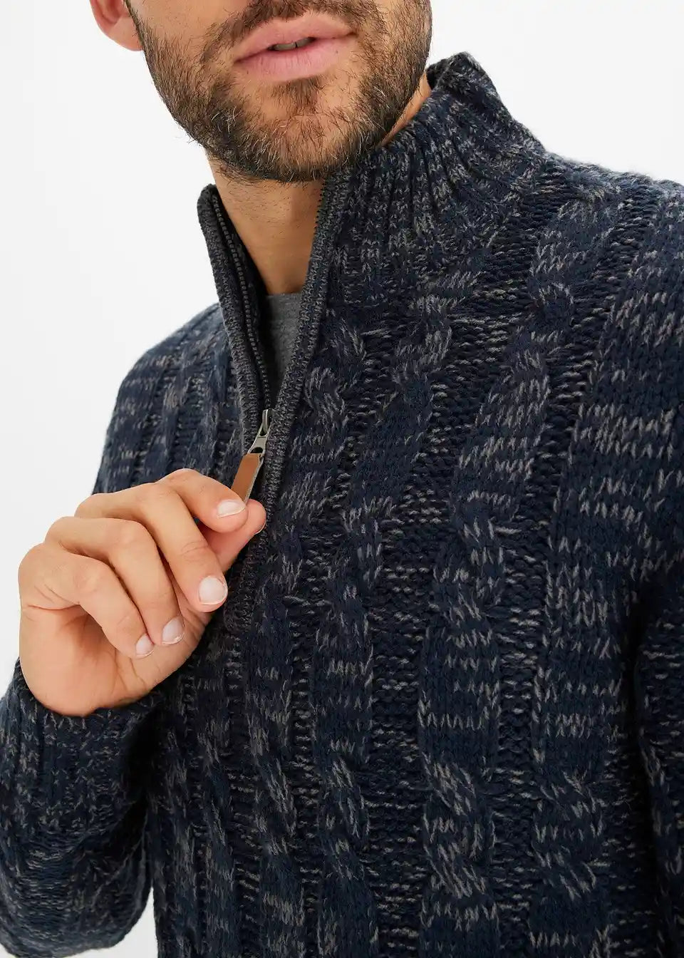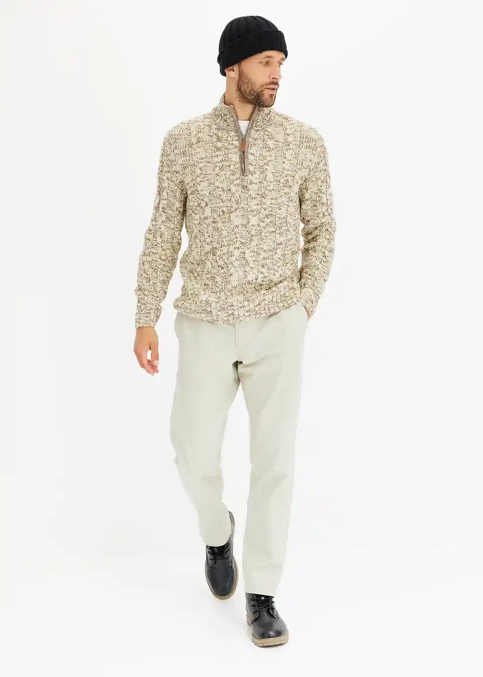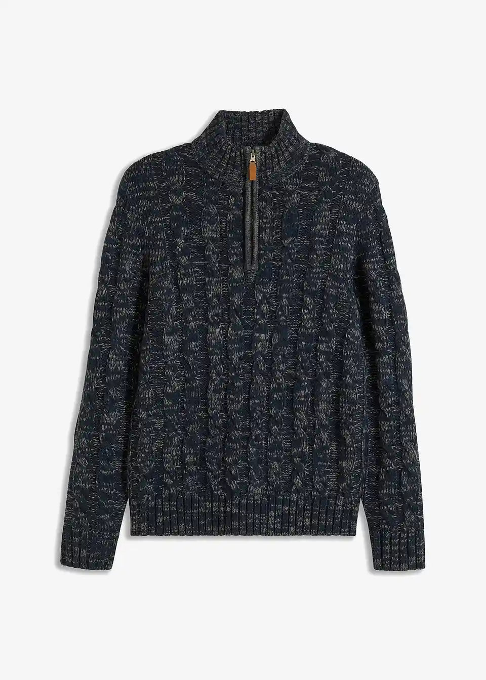 Topel pulover za hladne dni - to je ta moški Troyer iz kolekcije John Baner. Športni pulover iz pletenine navdušuje s privlačnim pletenim vzorcem in majhnim stoječim ovratnikom. Le-tega je mogoče zapreti z zadrgo do vratu. Sproščen pulover se dobro ujema z jeans hlačami.