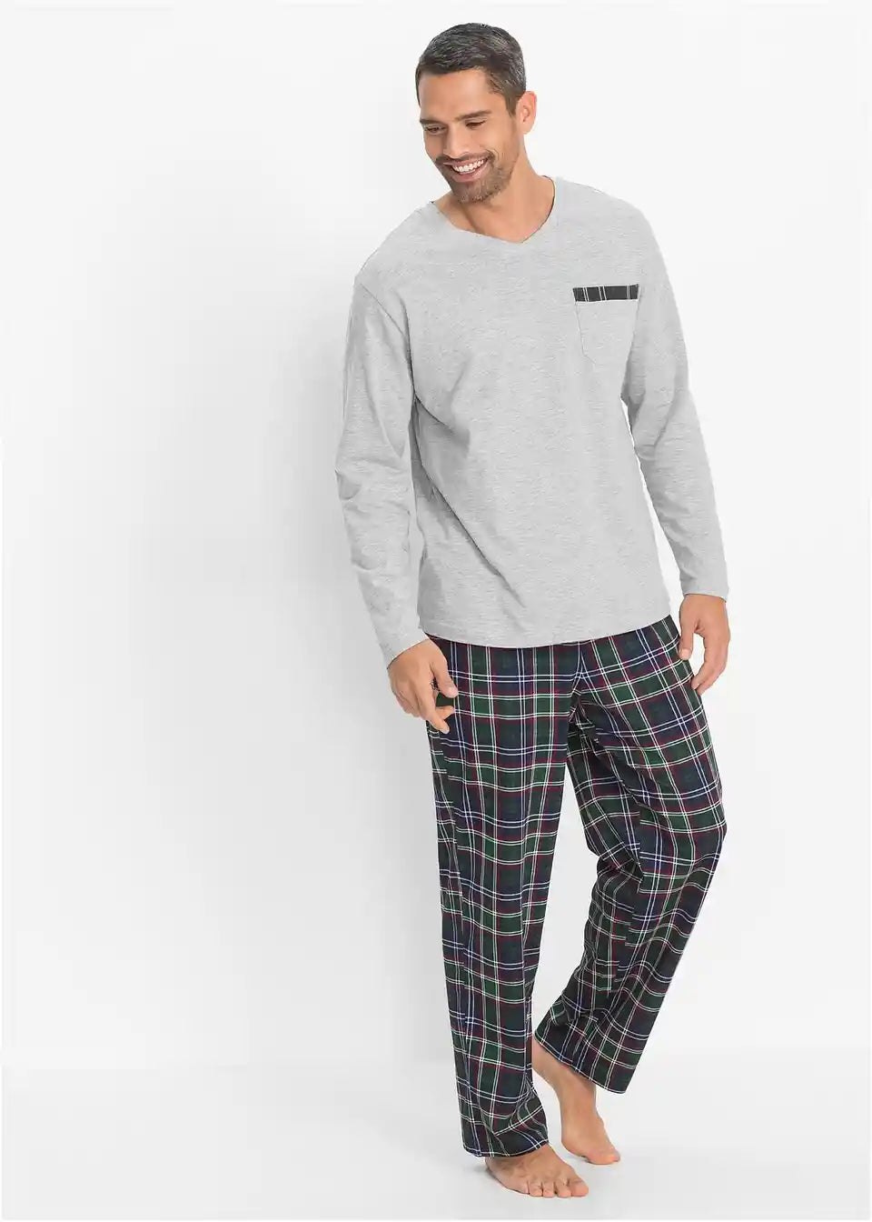 Moška pižama z dolgimi rokavi iz kolekcije bpc je ohlapno krojena in navdušuje s prijaznim mehkim materialom. Enobarvna majica z V-izrezom je opremljena z žepom na prsih. Dolge hlače prepričajo z vzorcem po celotni površini in elastičnim udobnim pasom. Žep na prsih povzema vzorec hlač in tako ustvarja privlačen poudarek.