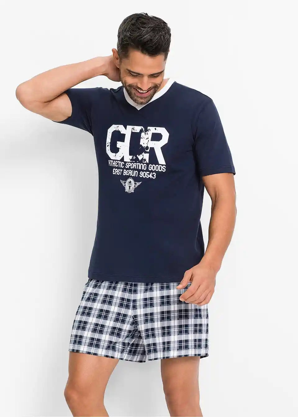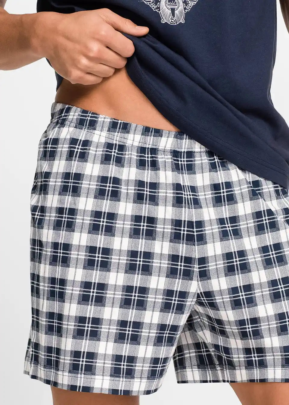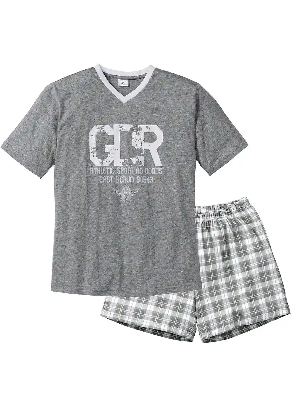 Vpadljiv bel potisk v modnem videzu "Used-Look" krasi atraktivno kratko majico s kratkimi rokavi te moške pižame Shorty. Bel obrobljen V-izrez poudarja športni videz. Kratke hlače v modnem karo vzorcu imajo udoben elastičen pas za optimalno udobje pri nošenju. Izdelan iz čistega bombaža je prekrasen Shorty znamke bpc popolna izbira za tople noči.