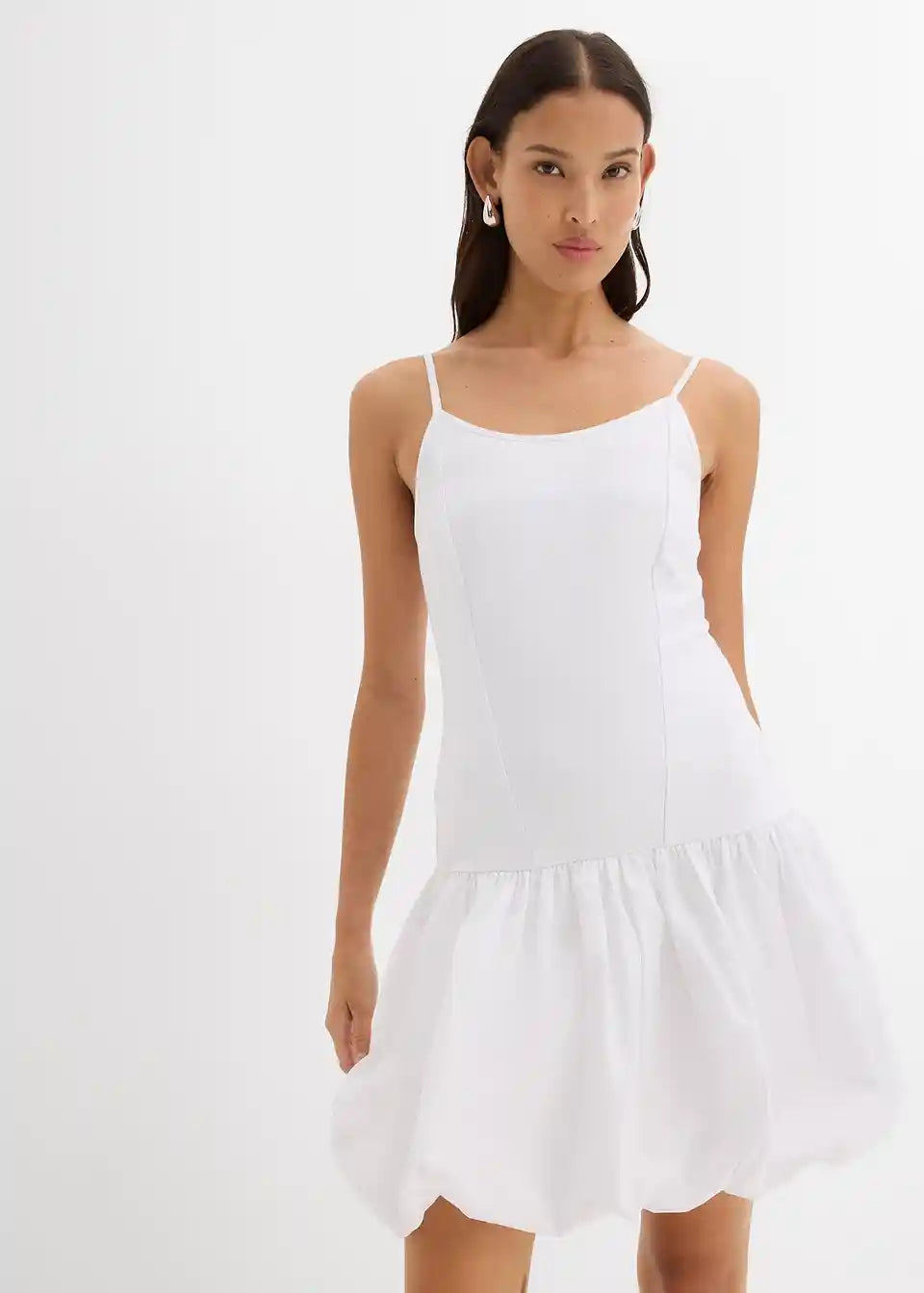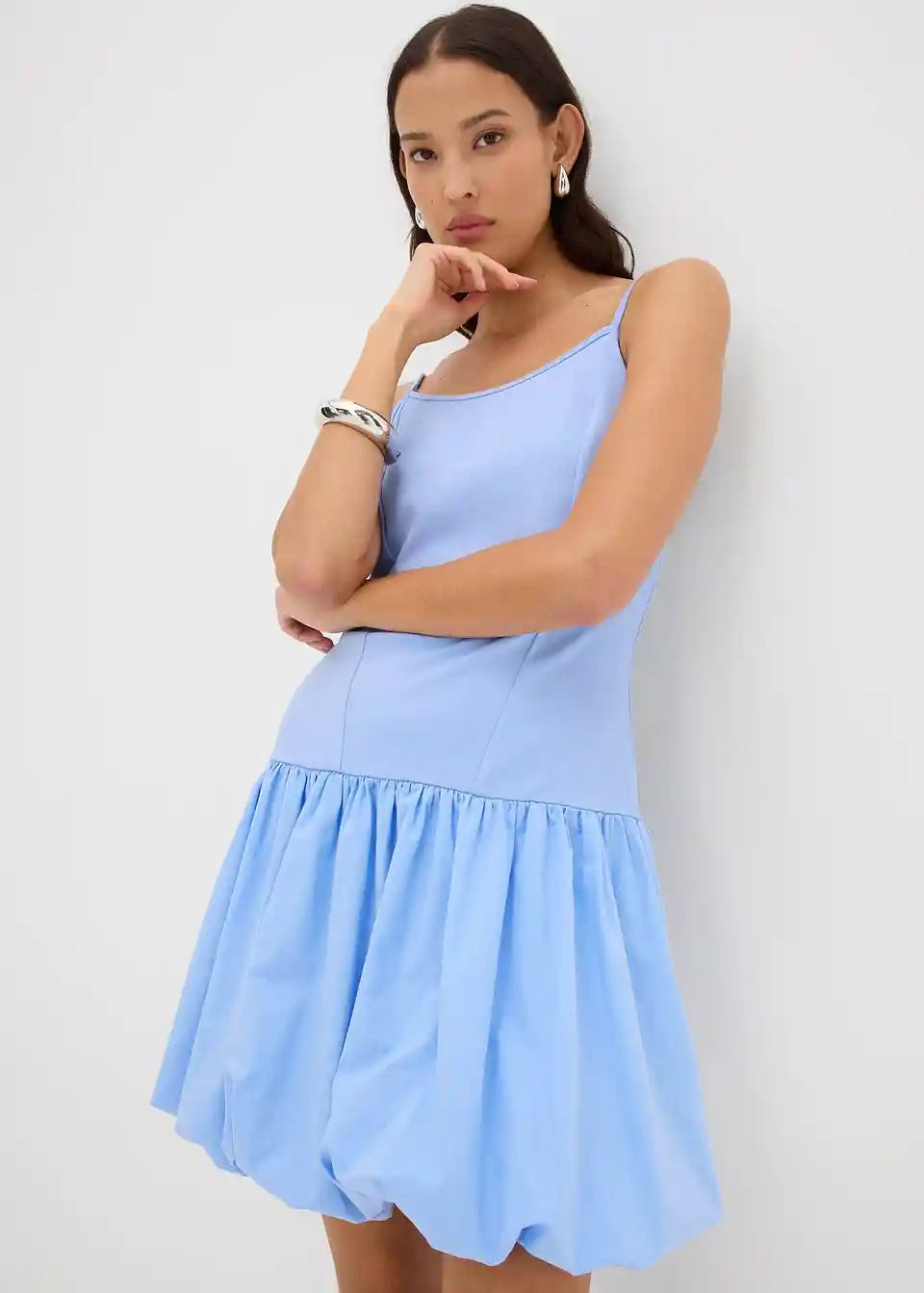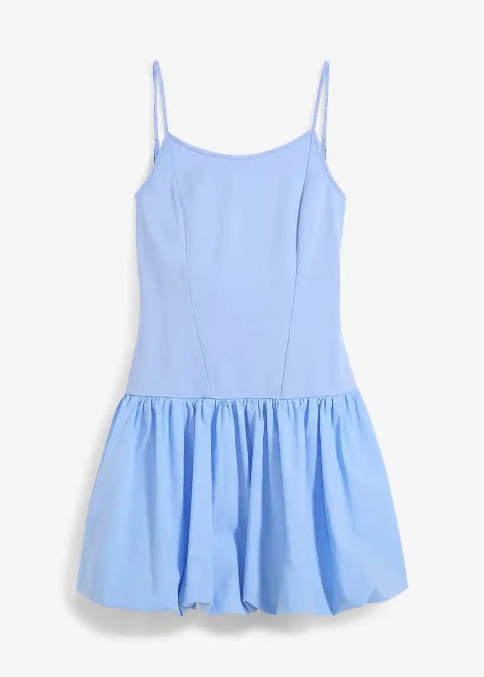 Trendovska mini obleka z balonastim krilom in špageti naramnicami