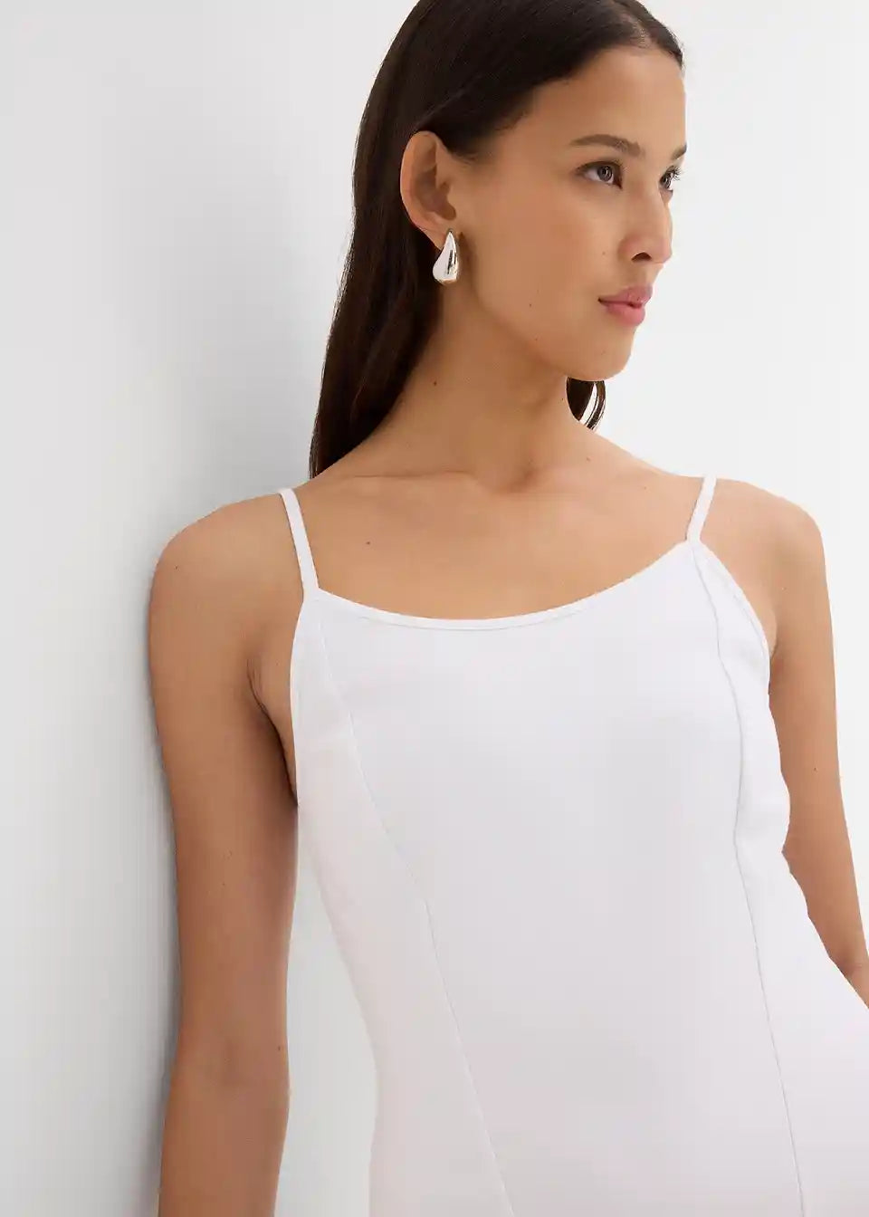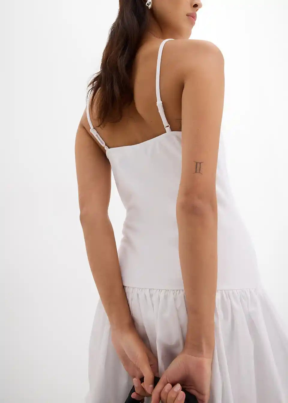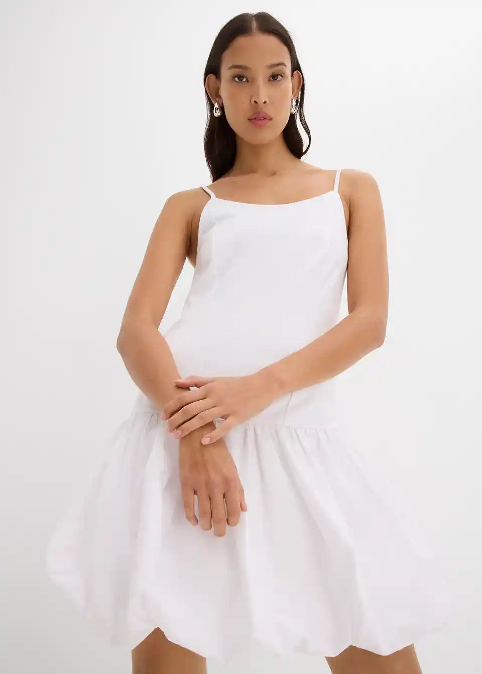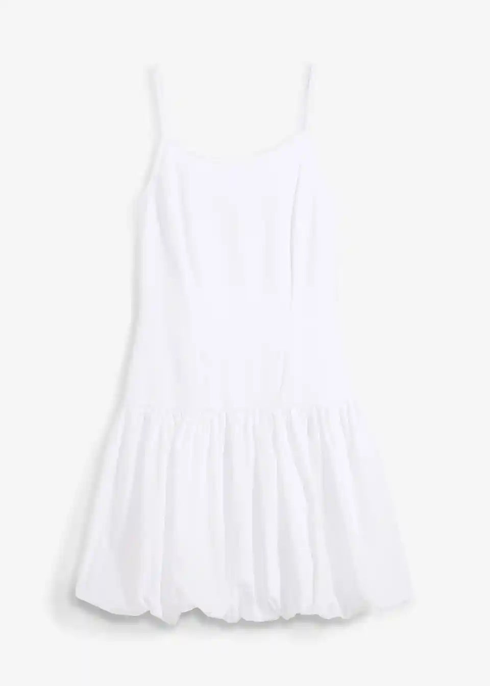 Trendovska mini obleka z balonastim krilom in špageti naramnicami
