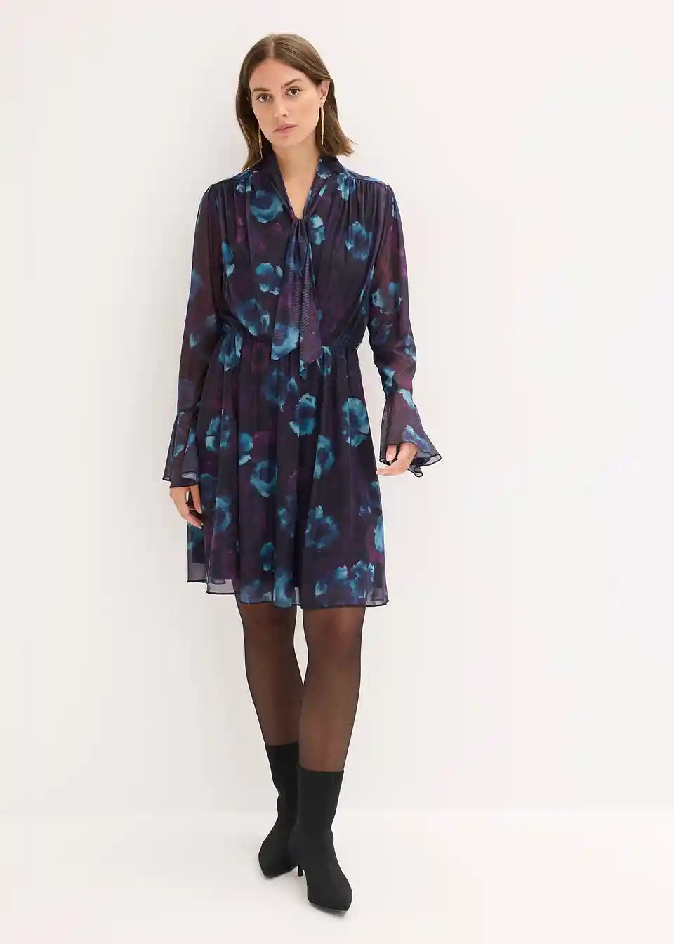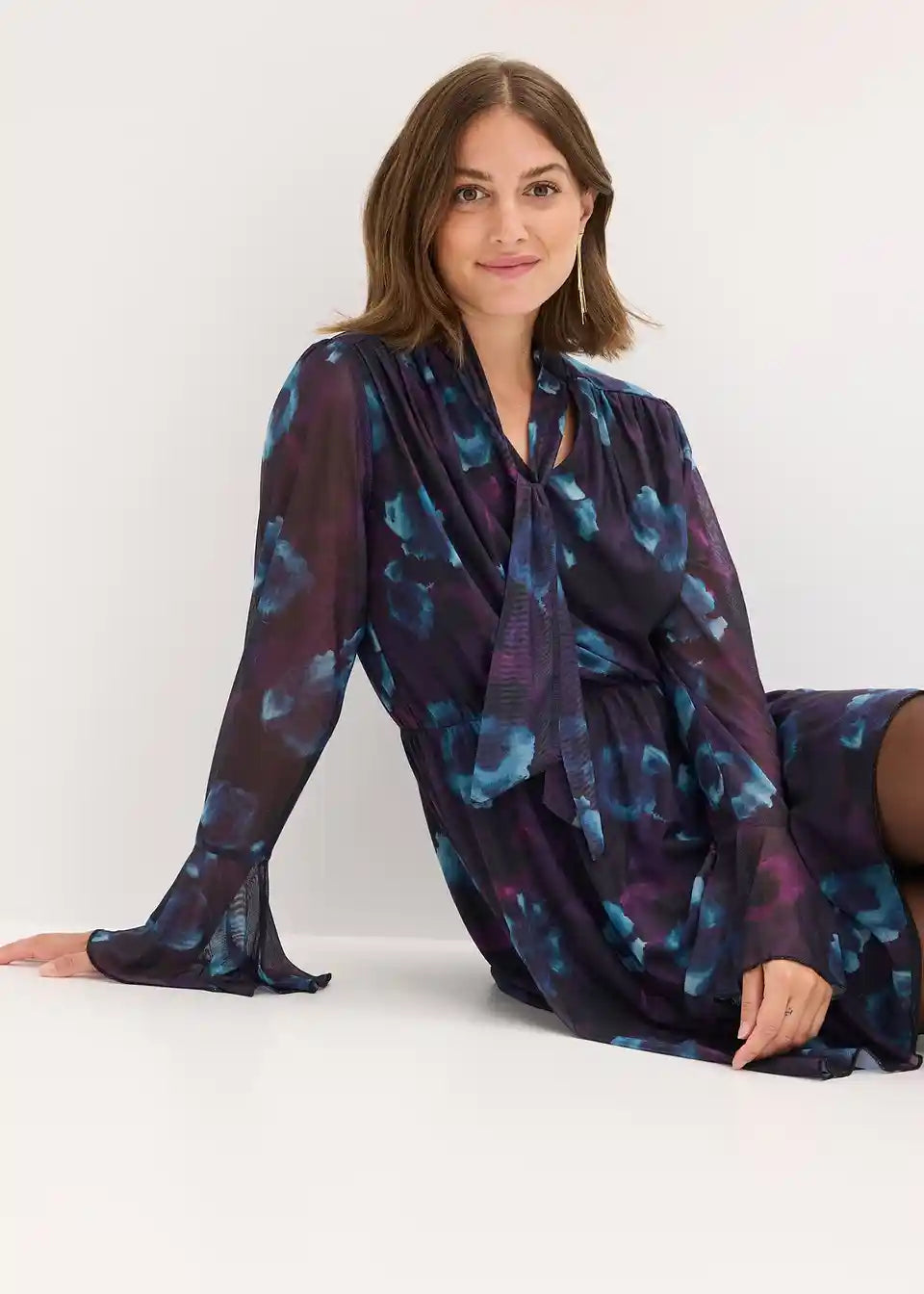Potiskana obleka iz mehke mreže s pentljo na izrezu spredaj in volani na robu rokavov