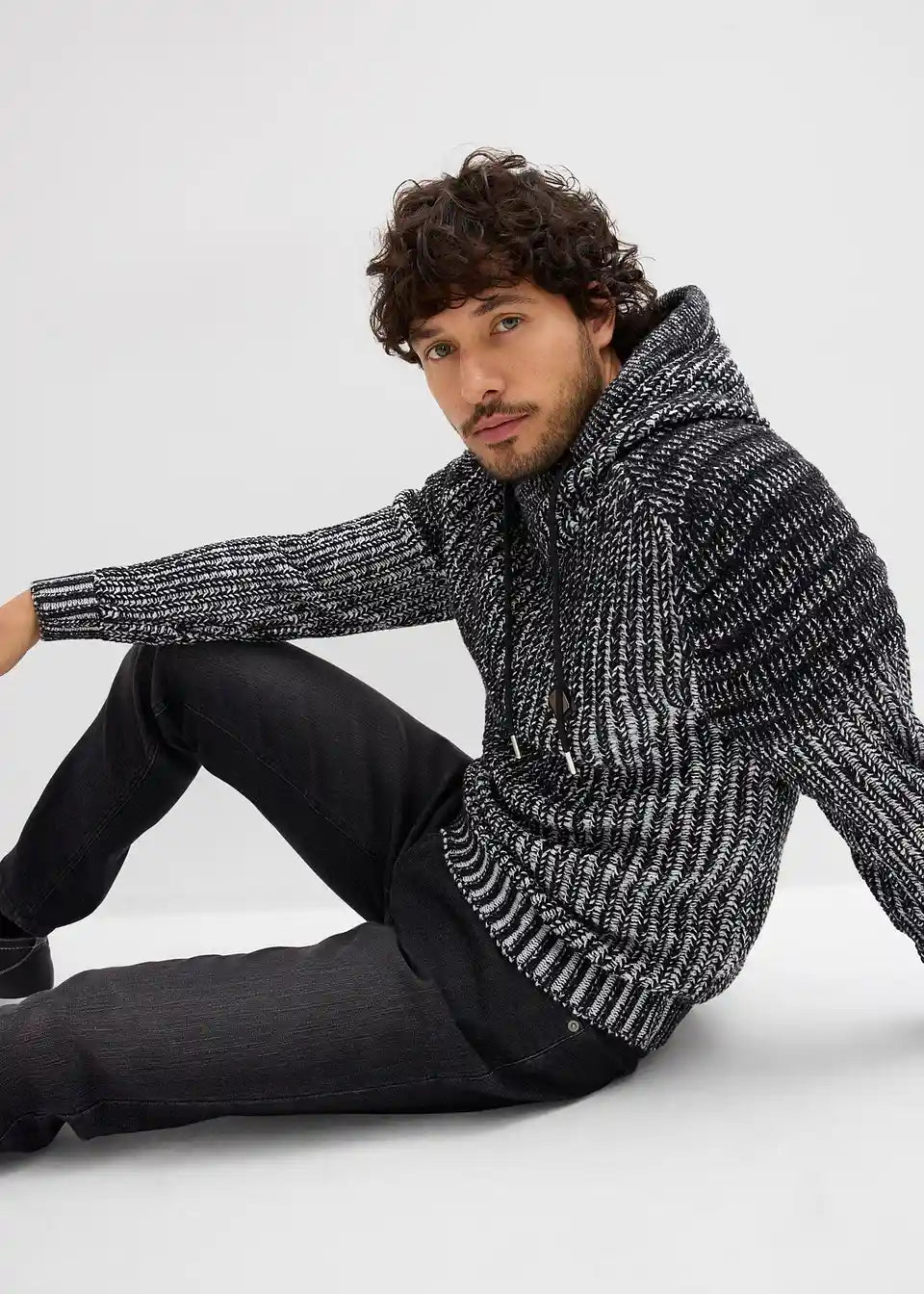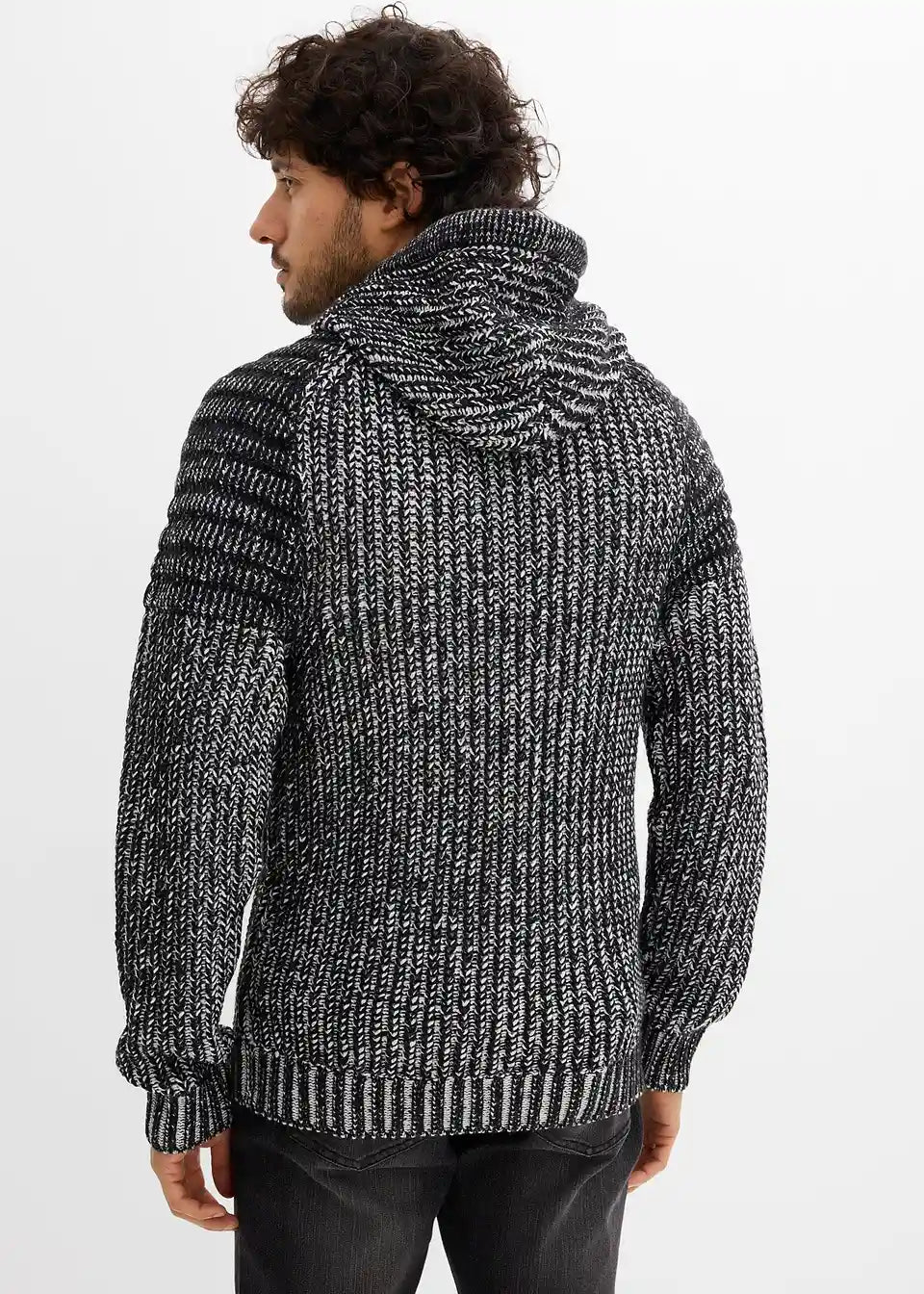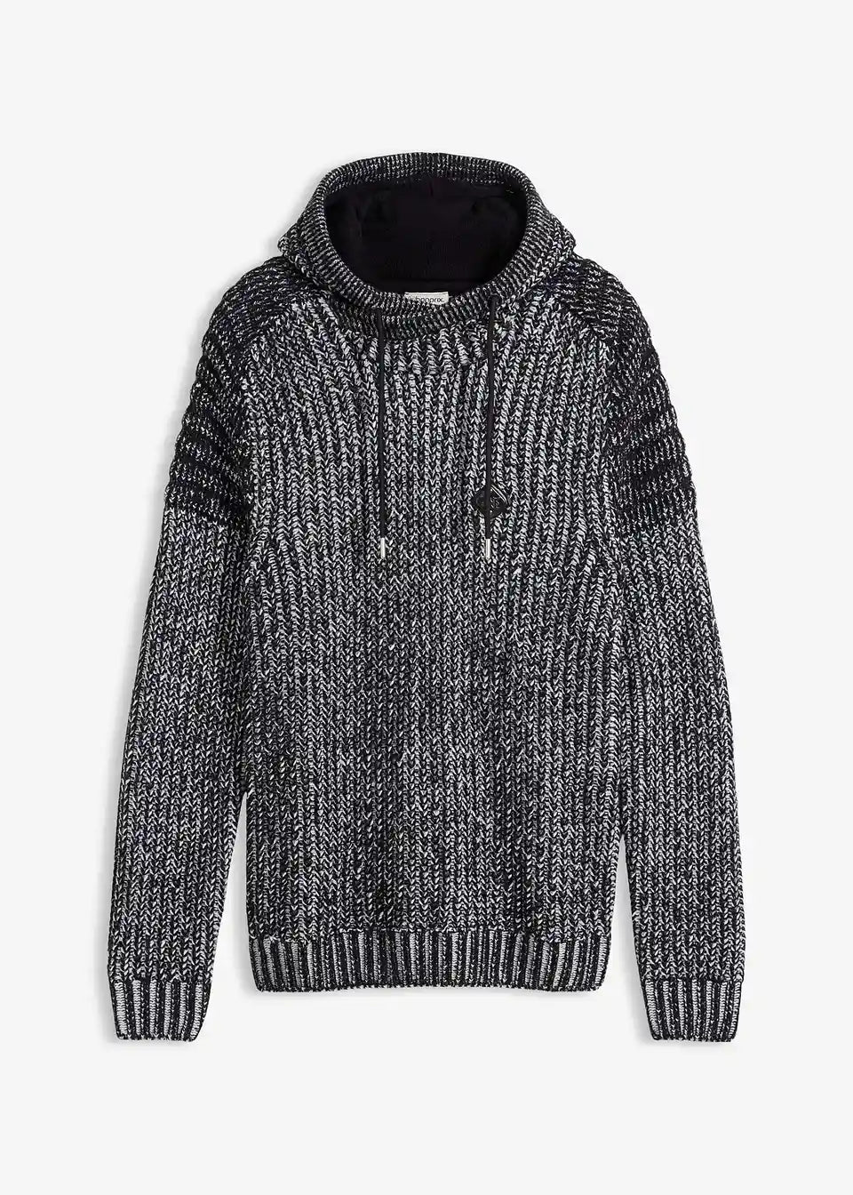 Grobo pleten pulover s kapuco in motorističnimi detajli