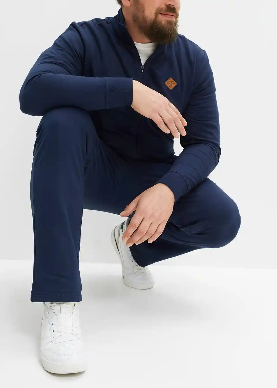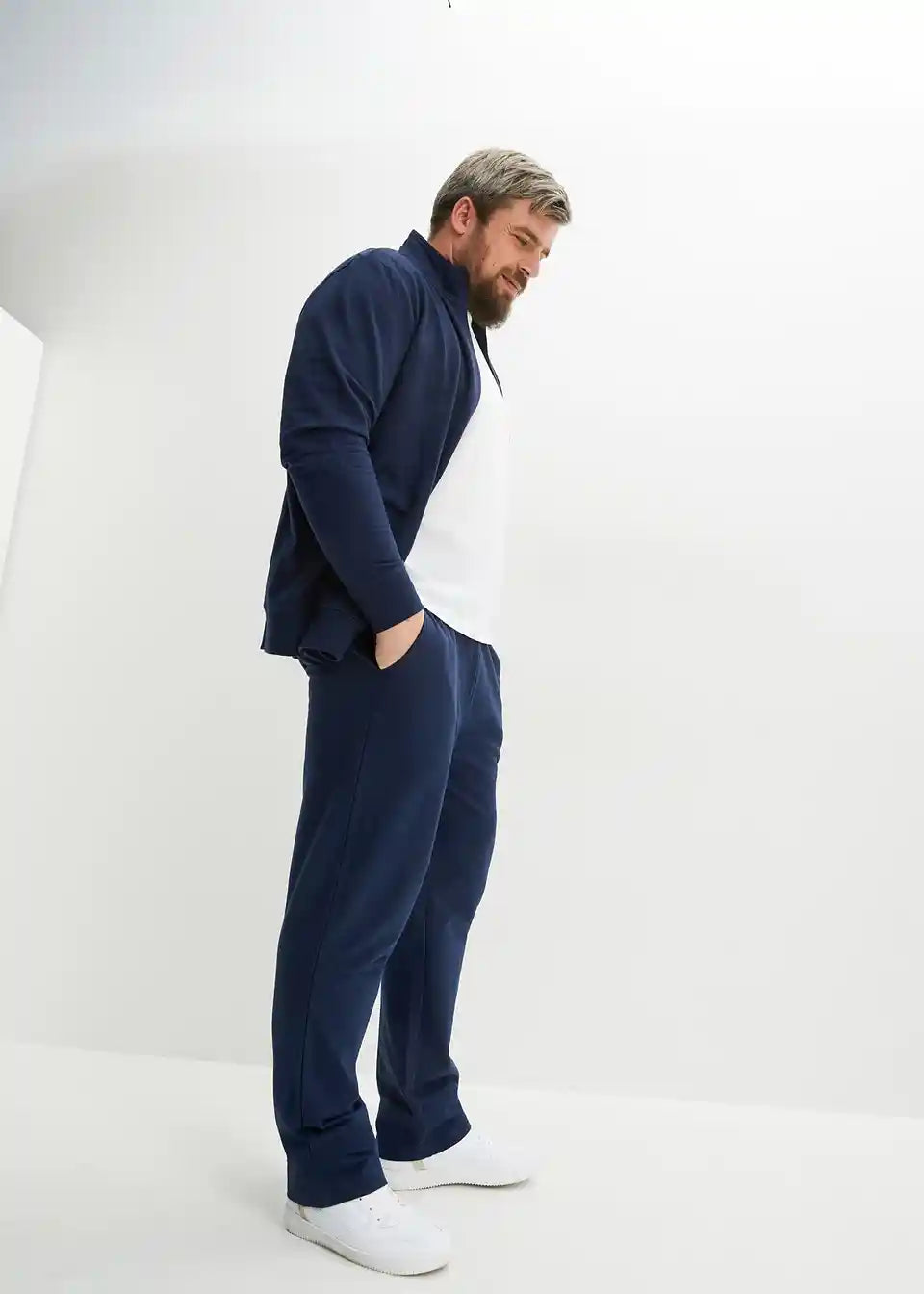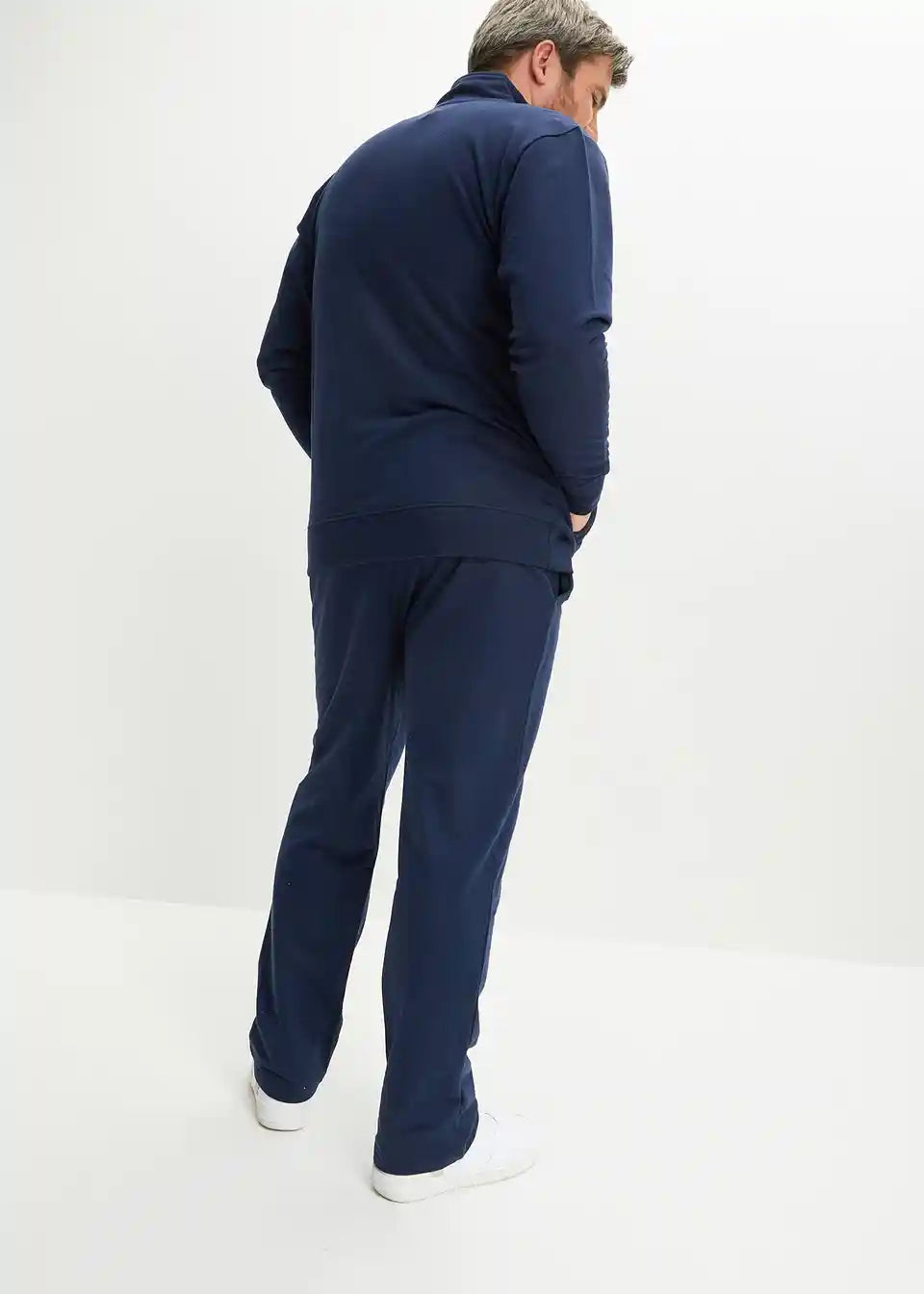 Trenirka iz ekološkega bombaža. Z zgornjim delom s pokončnim ovratnikom in všitimi žepi in ravno krojenimi hlačami z žepi