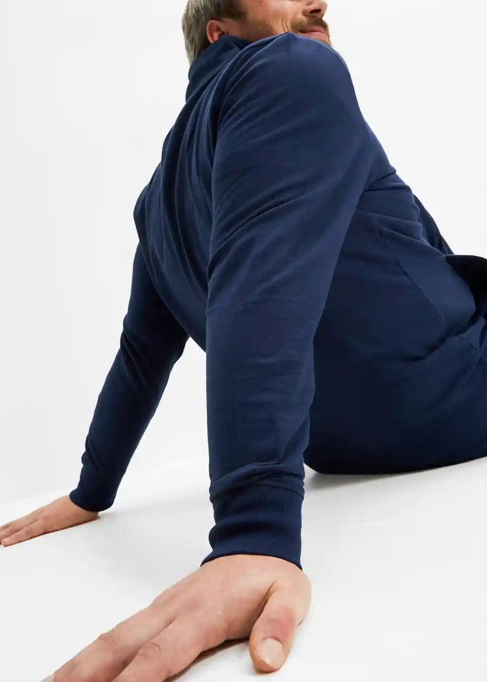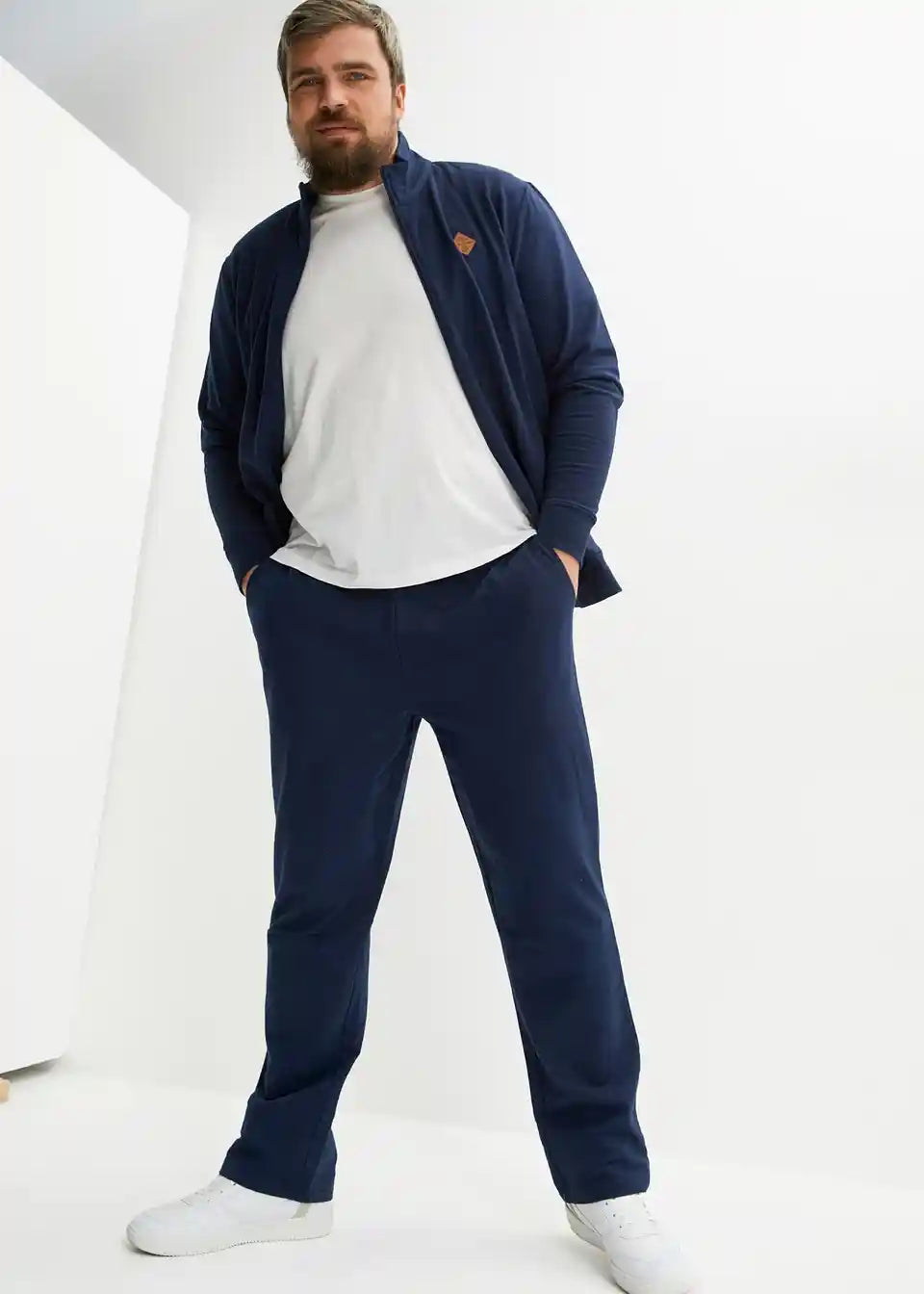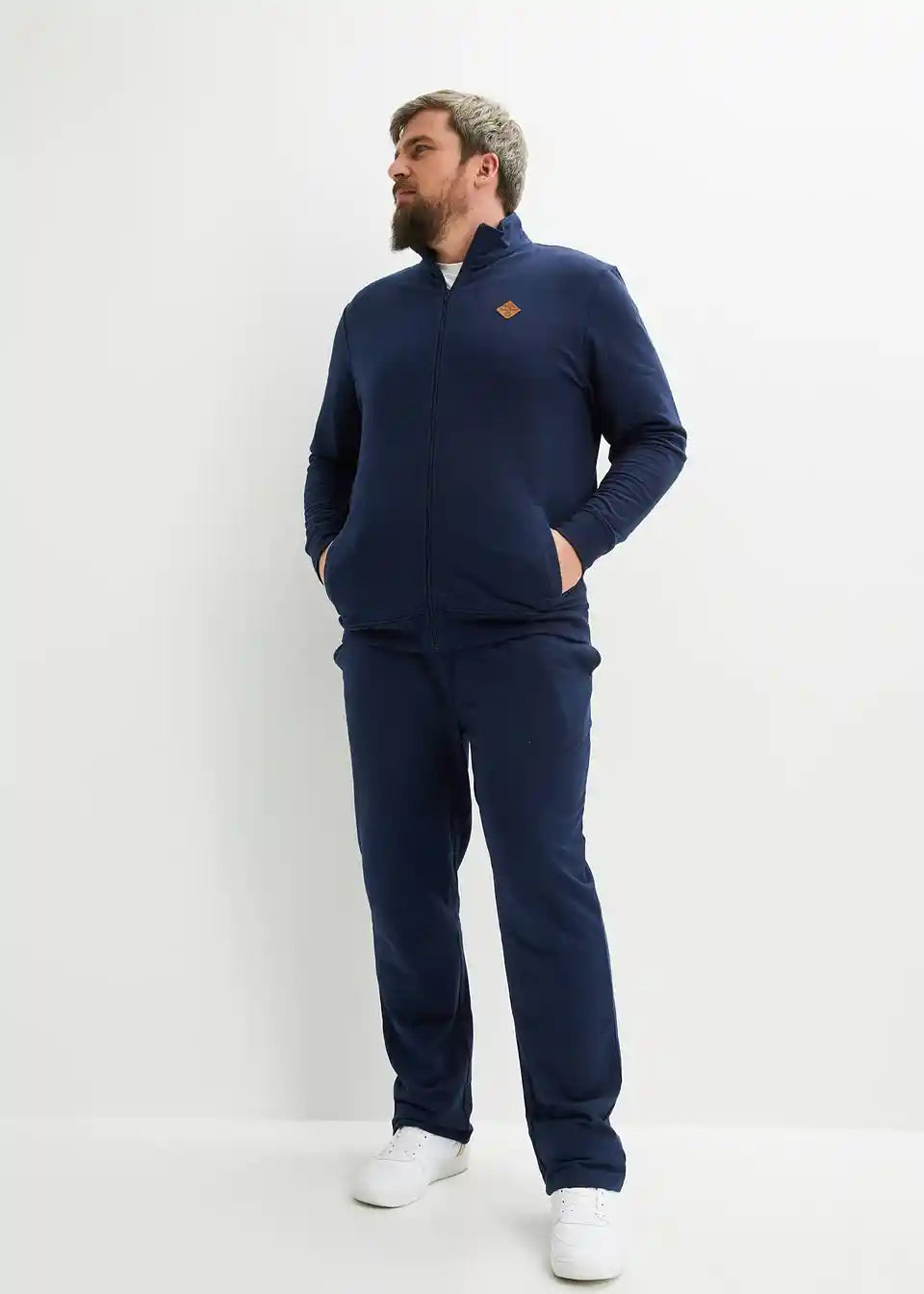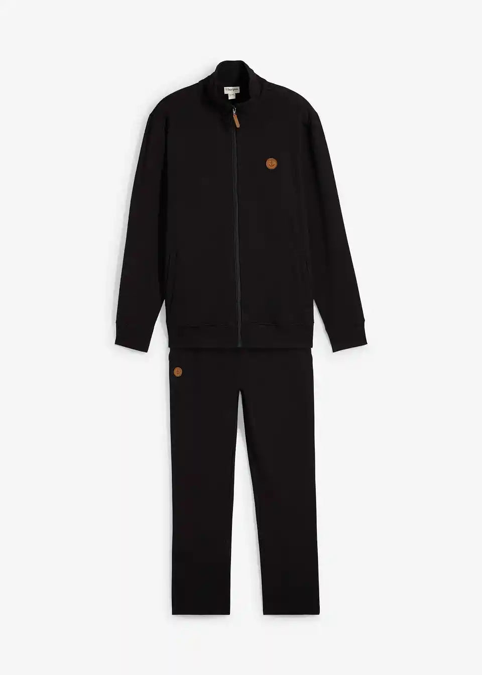 Trenirka iz ekološkega bombaža. Z zgornjim delom s pokončnim ovratnikom in všitimi žepi in ravno krojenimi hlačami z žepi