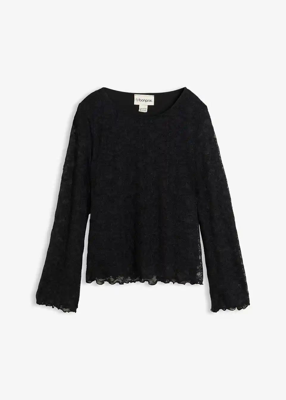 Ta očarljiva majica z dolgimi rokavi iz elastične cvetlične čipke združuje stil in udobje! Z širokim okroglim izrezom in dolgimi rokavi na zvon, okrašenimi z igrivim naborkom, ponuja ženstven videz. Majica ima običajen kroj in rahlo razširjeno silhueto, ki se konča nad boki. Raven rob je skrbno obrobljen, zgornji del je v celoti podložen, rokavi pa so brez podloge. Idealna za praznične priložnosti ali posebne stajlinge – samo obleči in zasijati!