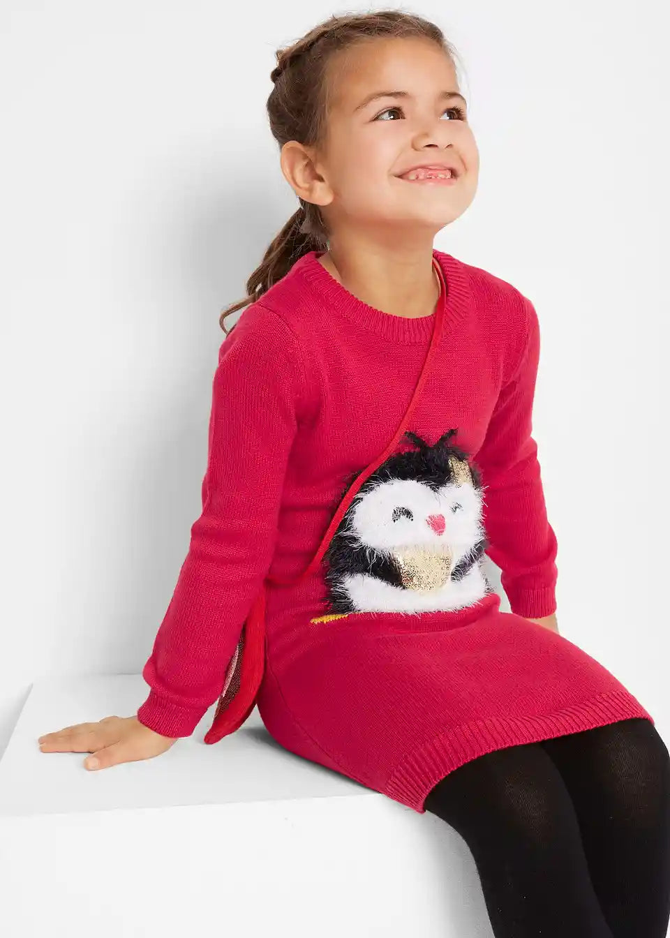 Božična pletena obleka z ljubkim mehkim dodatkom v obliki pingvina in majhno torbico