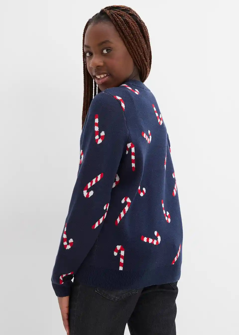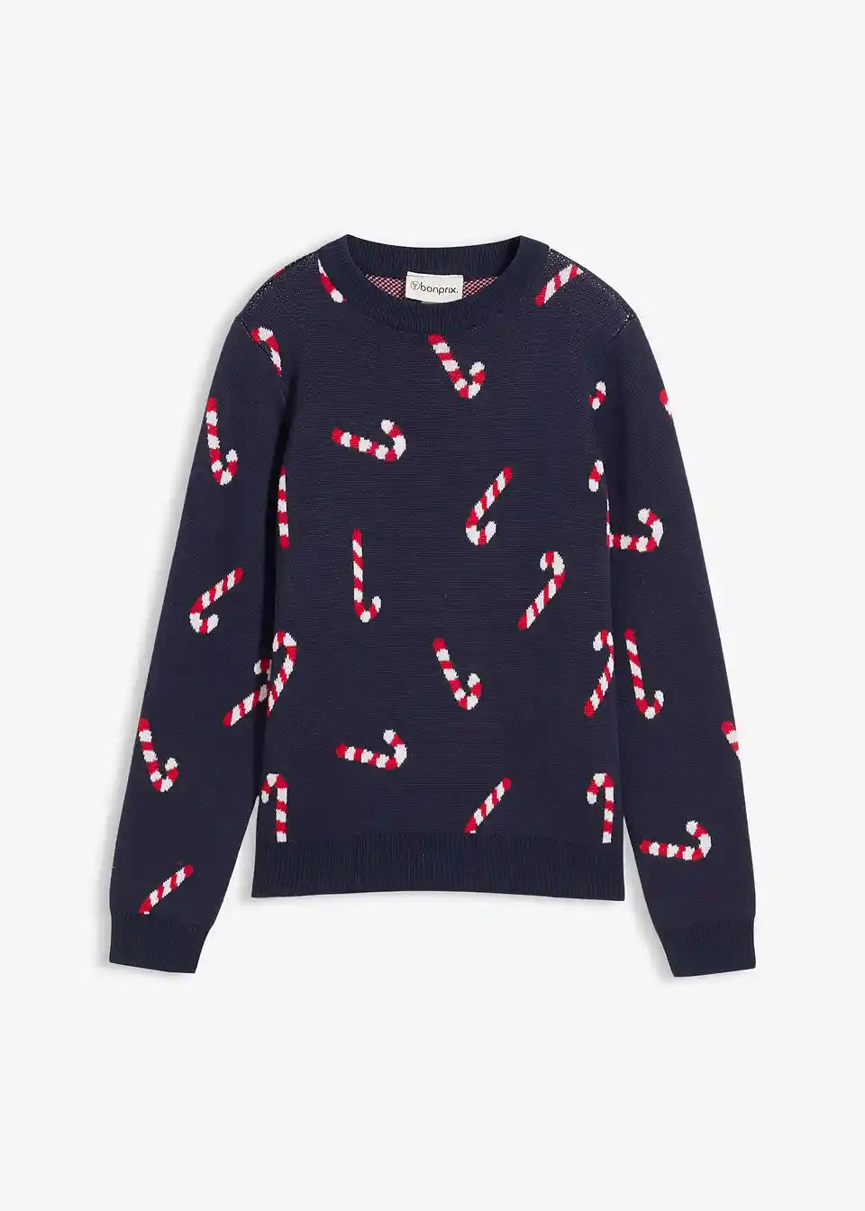 Ta očarljiv božični pulover prinaša praznično vzdušje v hladnejše dni! Z visokim okroglim vratnim izrezom in dolgimi, všitimi rokavi zagotavlja udobno prileganje do bokov. Pulover je okrašen z žakarskim vzorcem po celotni površini, ki prikazuje vesele sladkorne palčke, zato je pravi privlačen kos. Rebrasti zaključki na rokavih in spodnjem robu lepo dopolnijo dizajn. Idealen za božične zabave ali prijetne praznične dni – preprosto oblecite in uživajte!