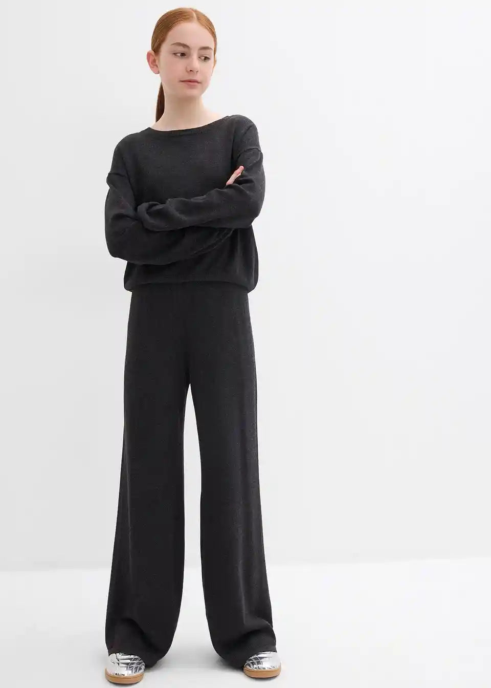Ta modni komplet iz finega puloverja in pletenih hlač je popoln za modna dekleta! Pulover ima okrogel izrez, dolge rokave in klasičen kroj, ki ni oprijet in sega do bokov. Nežna viskozna mešanica poskrbi za prijeten občutek na koži. Priložene pletene hlače v Marlene slogu nudijo udobno prileganje, široke hlačnice in elastičen pas s ponarejeno vrvico. Raven zaključek in širok kroj naredita ta komplet idealen za sproščena in udobna oblačila. Odličen za vsak dan ali prijetne trenutke doma!