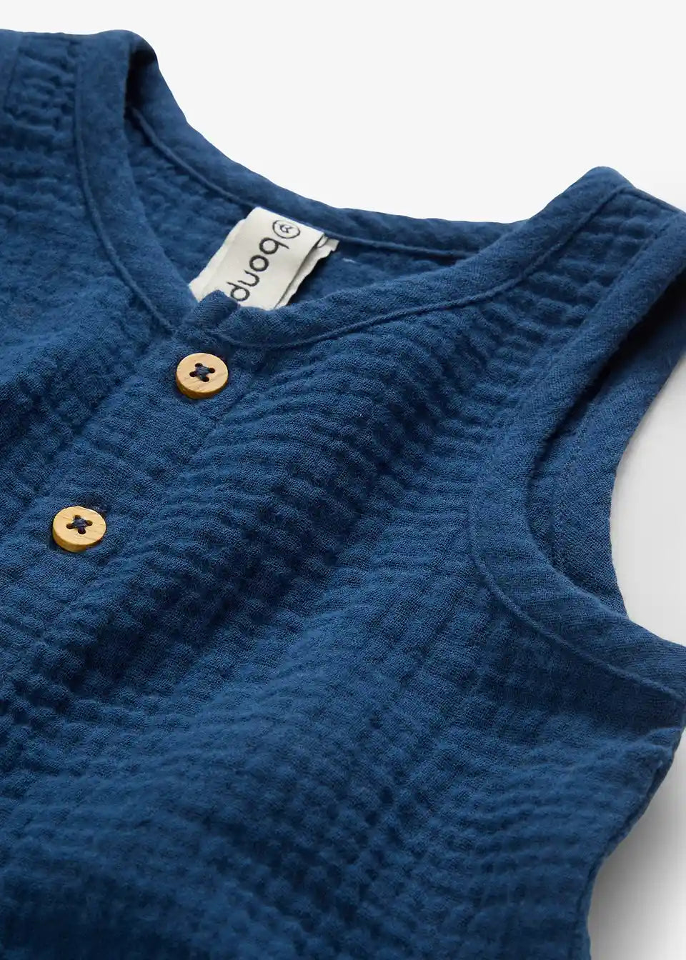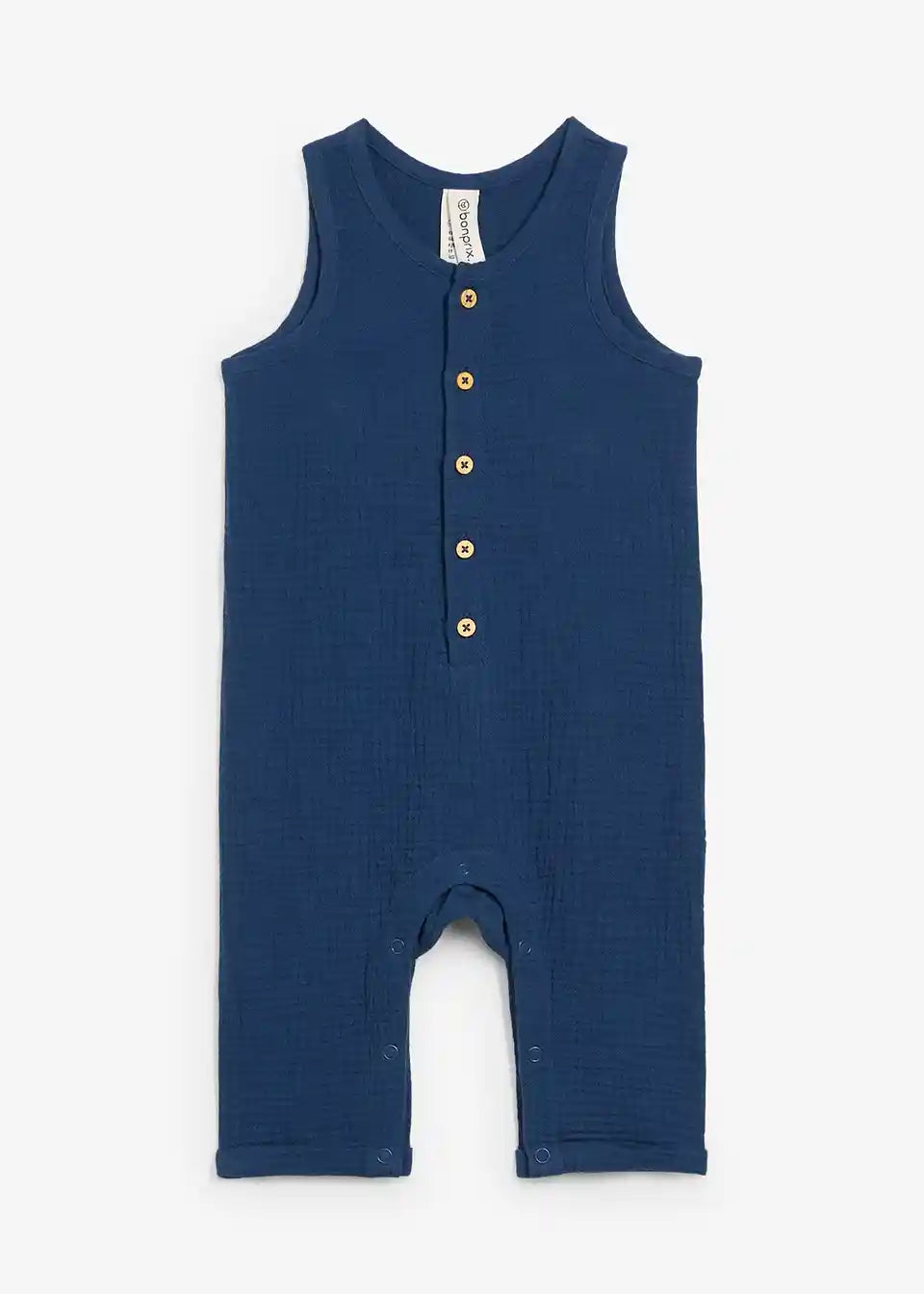Brezrokavni enodelni kos iz mehkega bombažnega muslina. Spredaj z leseno obrobljeno vrstico gumbov, odprtimi zaključki na rokavih in hlačnicah ter ohlapnim krojem za udobno svobodo gibanja. Lahek in zračen – idealen za tople poletne dni.