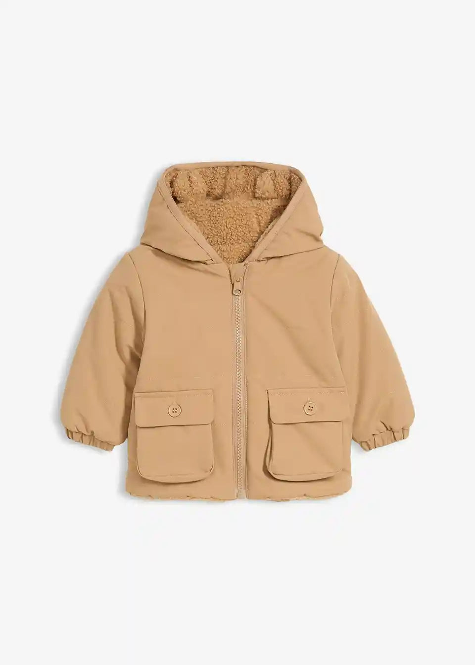 Ta jakna je popolna spremljevalka za hladne dni! Obojestransko nosljiva: ena stran klasična z gumbi in žepi, druga prijetno mehka z ljubkimi kenguru žepi. Kapuca ne samo da ščiti pred vetrom in mrazom, ampak navdušuje z igrivimi ušeski. Kakovostni materiali zagotavljajo, da je vaš dojenček toplo, udobno in naravnost čudovito zavit.