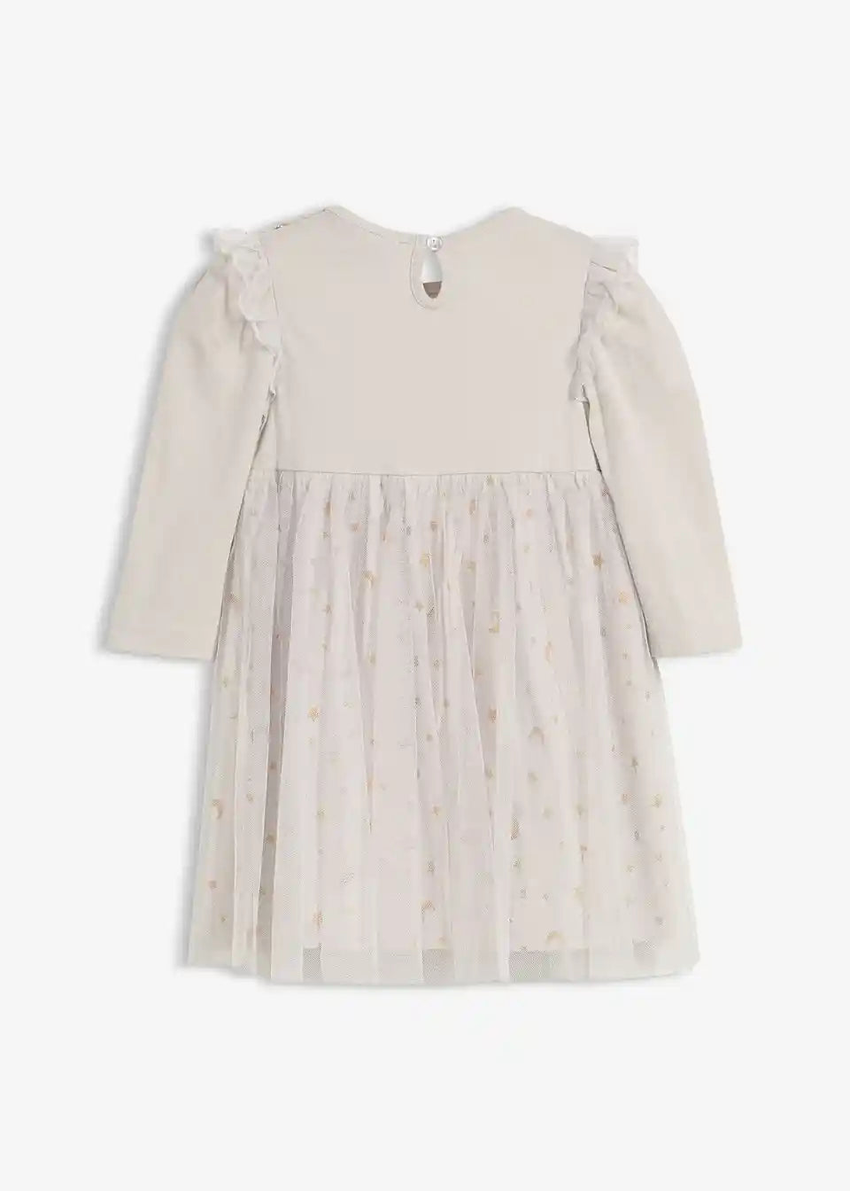Praktična bodi obleka s tilastim krilom in bleščečimi zvezdami. Vgrajen bodi ima pritiskače v mednožju, kar olajša oblačenje, slačenje in previjanje. Lahko tilasto krilo z naborki obleki doda prazničen značaj – idealno za posebne priložnosti.