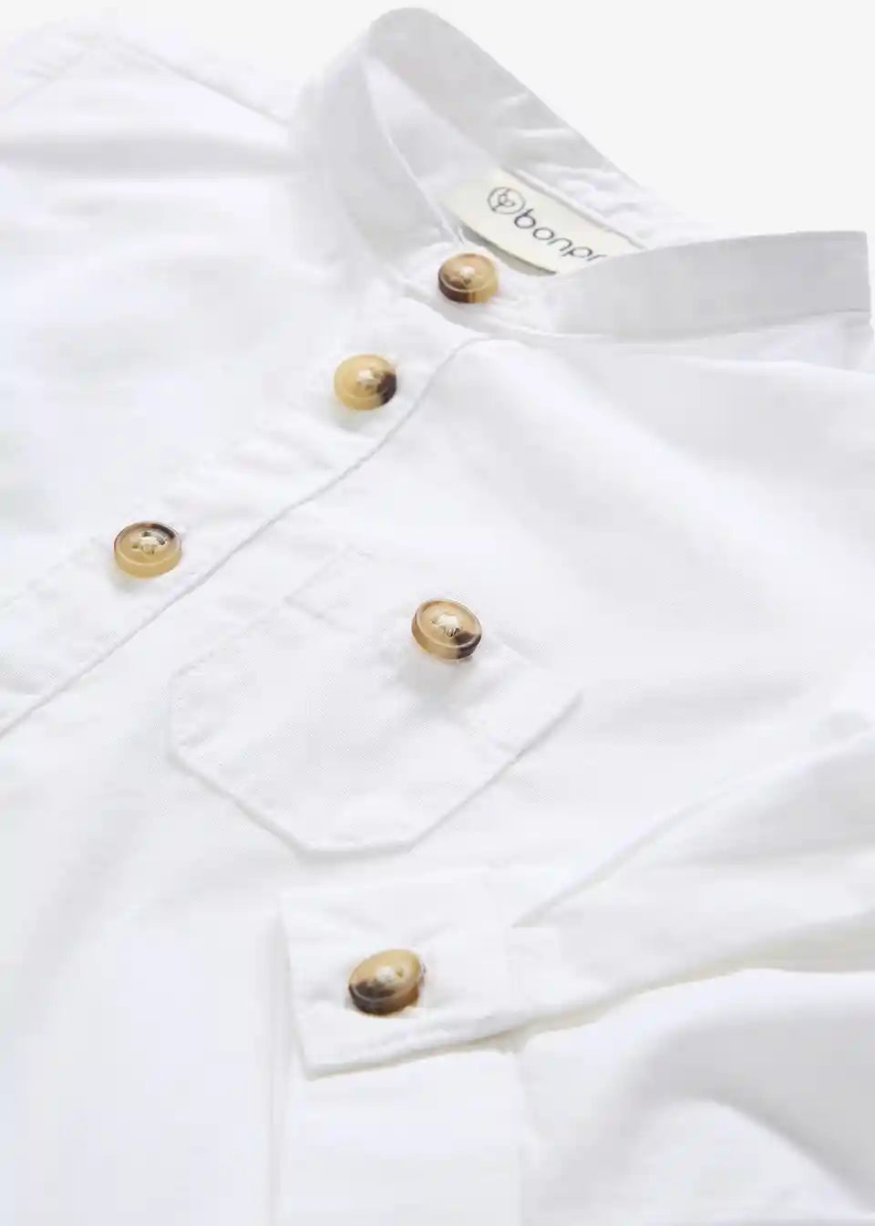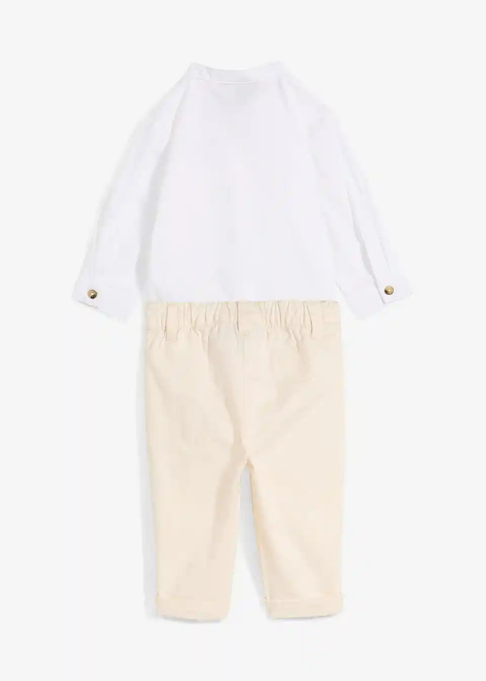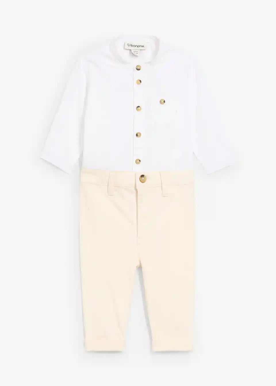 Komplet z bodysrajčko iz mehkega bombaža in hlačami iz bombažnega tvila. Dolg rokav na bodysrajčki s stoječim ovratnikom, zapenjanjem z gumbi po celotni dolžini in pritiskači v mednožju za enostavno oblačenje in slačenje. Na prsih je majhen žep z gumbom. Hlače z nastavljivim elastičnim pasom, lažnim razporkom z gumbom in stranskimi žepi. Idealen za praznične priložnosti.