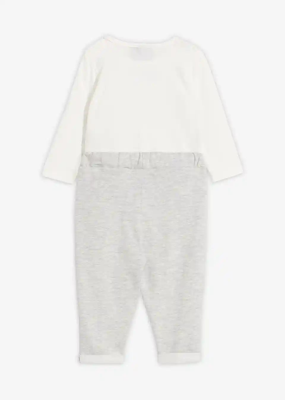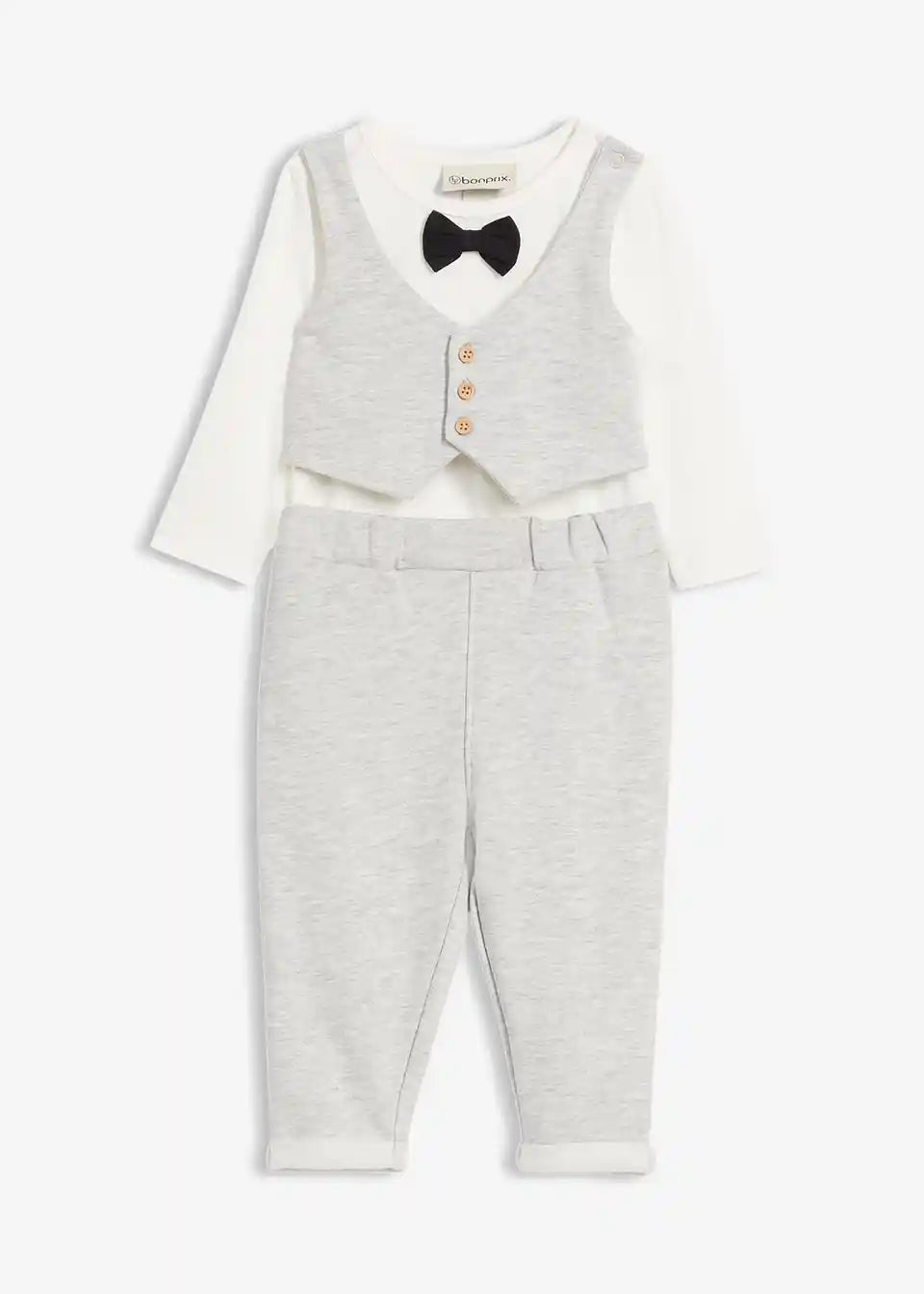 Ta prikupen komplet za praznovanja za dojenčke je sestavljen iz bodija in hlač – oba izdelana iz organskega bombaža. Bodi ima trdno prišit telovnik in majhen metuljček, kar združuje udobje s prazničnim videzom. Zahvaljujoč pritiskačem v predelu mednožja ga je enostavno oblačiti in slačiti. Hlače z elastičnim pasom zagotavljajo udobno prileganje in veliko svobode gibanja. Slogovno dovršen in obenem koži prijazen komplet – idealen za poroke, krste, rojstne dneve ali božič.