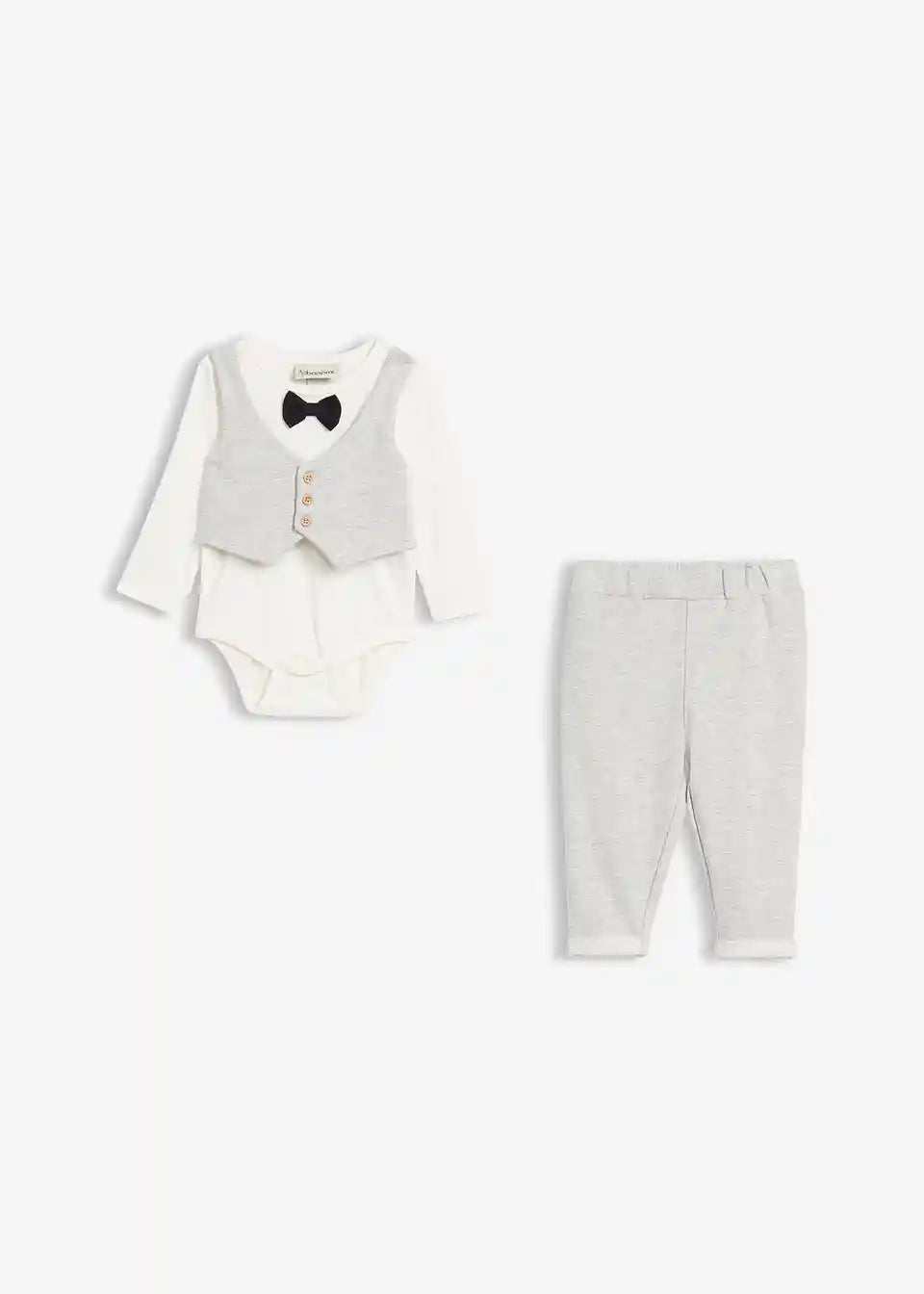 Eleganten otroški komplet iz čistega ekološkega bombaža z našitim telovnikom, metuljčkom in hlačami.