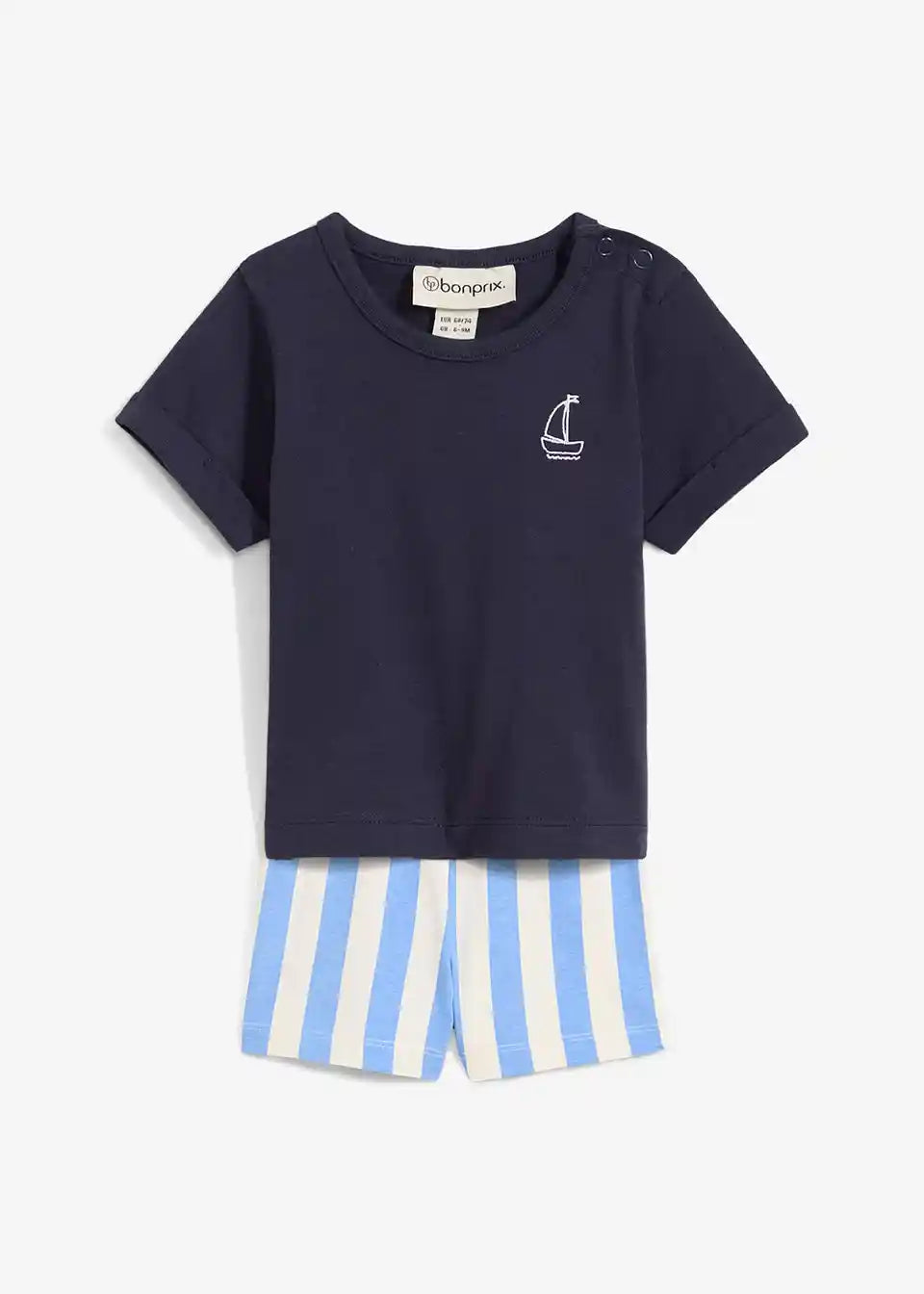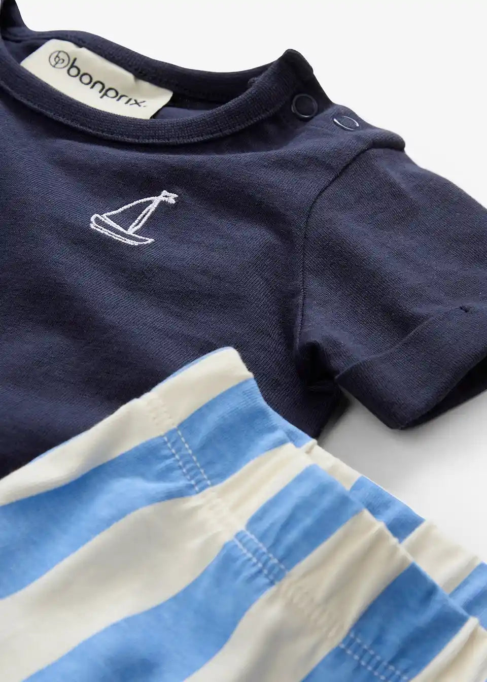 Lahka majica in udobne kratke hlače iz čistega bio bombaža – idealno za poletje. Majica je okrašena z ljubko vezeno ladjico, hlače pa s črtastim vzorcem in elastiko, ki jo je mogoče prilagoditi za popolno prileganje. Popolno za sončne dneve in nepozabne pustolovščine!