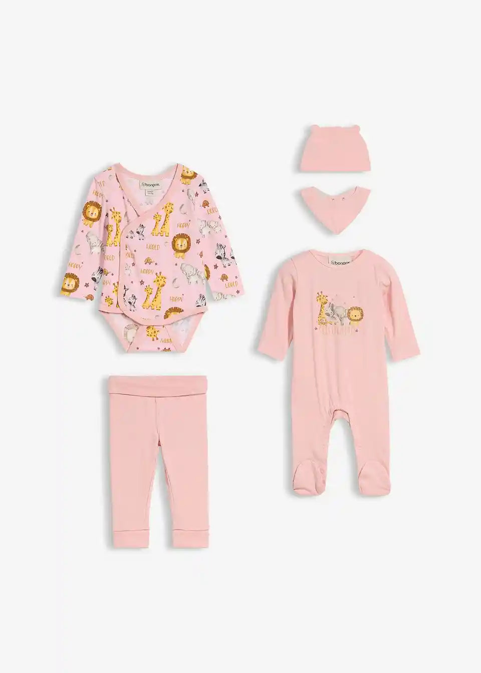 Ta 5-delni začetni komplet za dojenčka v nežni bonbon rozasti barvi vključuje bodi, hlače, kapico, pižamo in slinček, ki so popolno usklajeni. Bodi z ovitjem omogoča enostavno oblačenje in slačenje, hlače so udobne in zagotavljajo veliko svobode gibanja. Pižama s stopali ohranja dojenčka toplega, preprečuje mrzle noge in je opremljena s praktičnimi pritiskači ter prikupnim celopovršinskim živalskim potiskom. Elastična kapica se popolnoma prilega glavici in je srčkano oblikovana z majhnimi ušeski. Slinček je široko krojen, zanesljivo ščiti oblačila in je idealna dopolnitev kompleta za vsakdan.