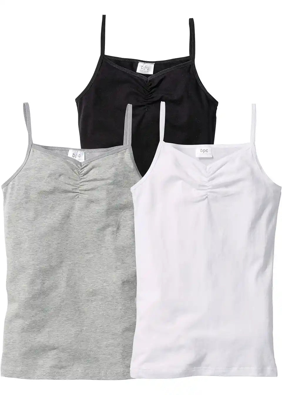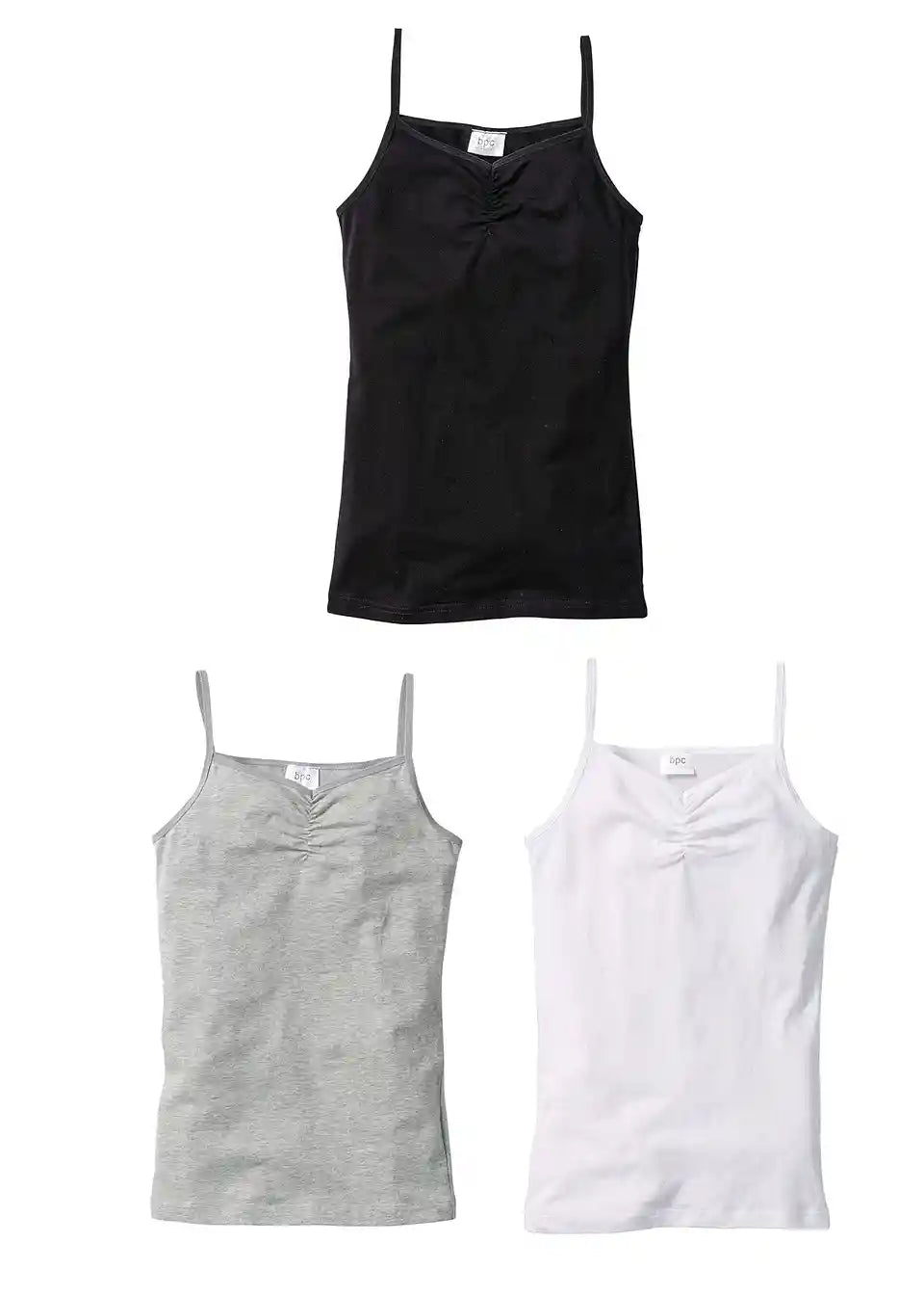 S tem ugodnim večpakiranjem dobijo deklice lepe osnovne kose spodnjega perila v obliki treh topov znamke bpc. Ozke in elastične naramnice ter raztegljivi izrezi za roke zagotavljajo udobno oporo, mehki material pa omogoča prijeten občutek nošenja. Topi so na sprednjem sredinskem delu izreza rahlo nabrani. Topi v trojnem pakiranju so na voljo v različnih barvnih kombinacijah.
