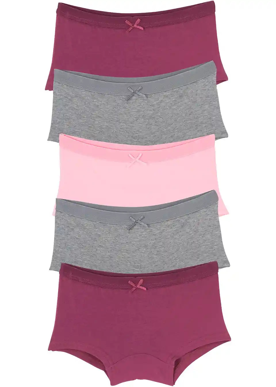 Hlačke v praktičnem pakiranju 3 kosov. V treh različnih barvah z elastičnim okrasnim pasom in majhno dekorativno pentljico spredaj. Dobro se kombinirajo z nedrčkom ali majico.