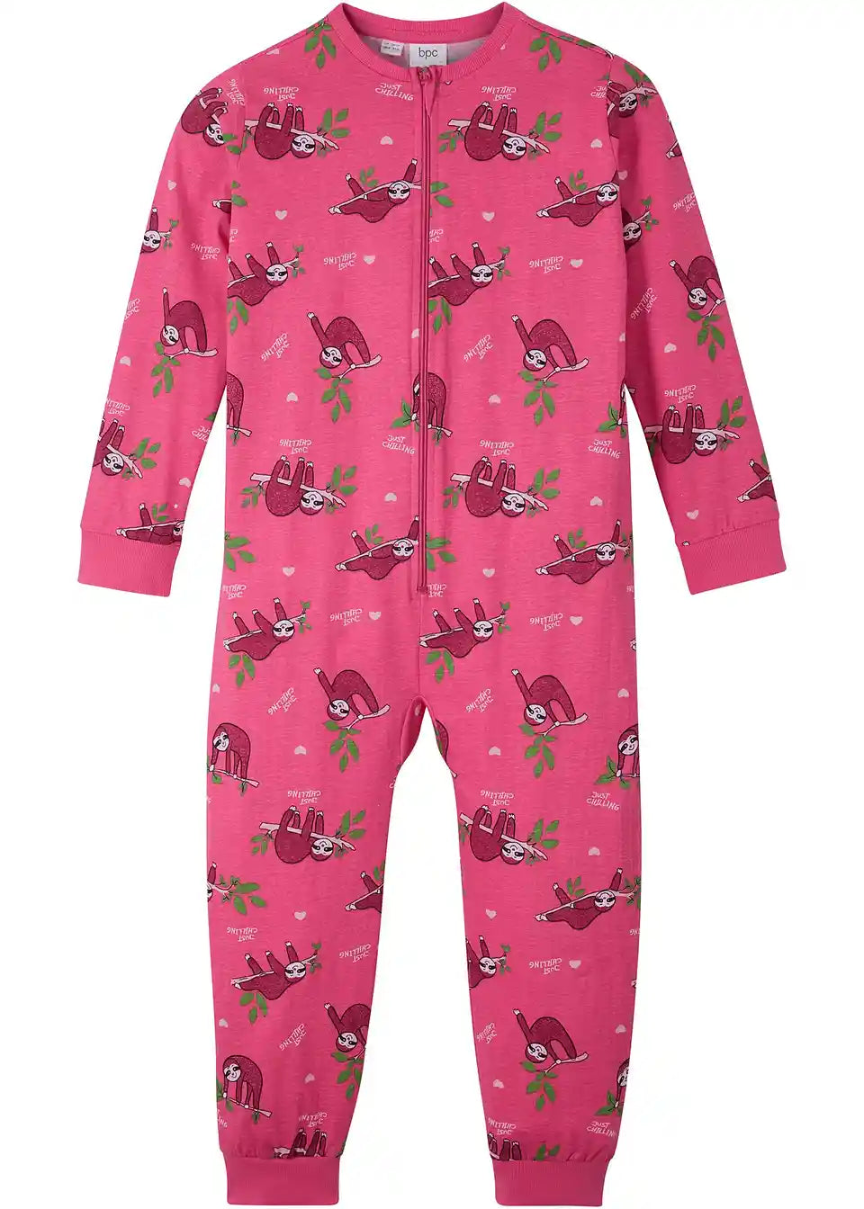 Barvit spalni kombinezon z zabavnim motivom lenivca. Izrez in robovi so za dodatno udobje opremljeni z mehkimi elastikami. Na sprednji strani je barvno usklajena zadrga z zaščito za brado za enostavno oblačenje.