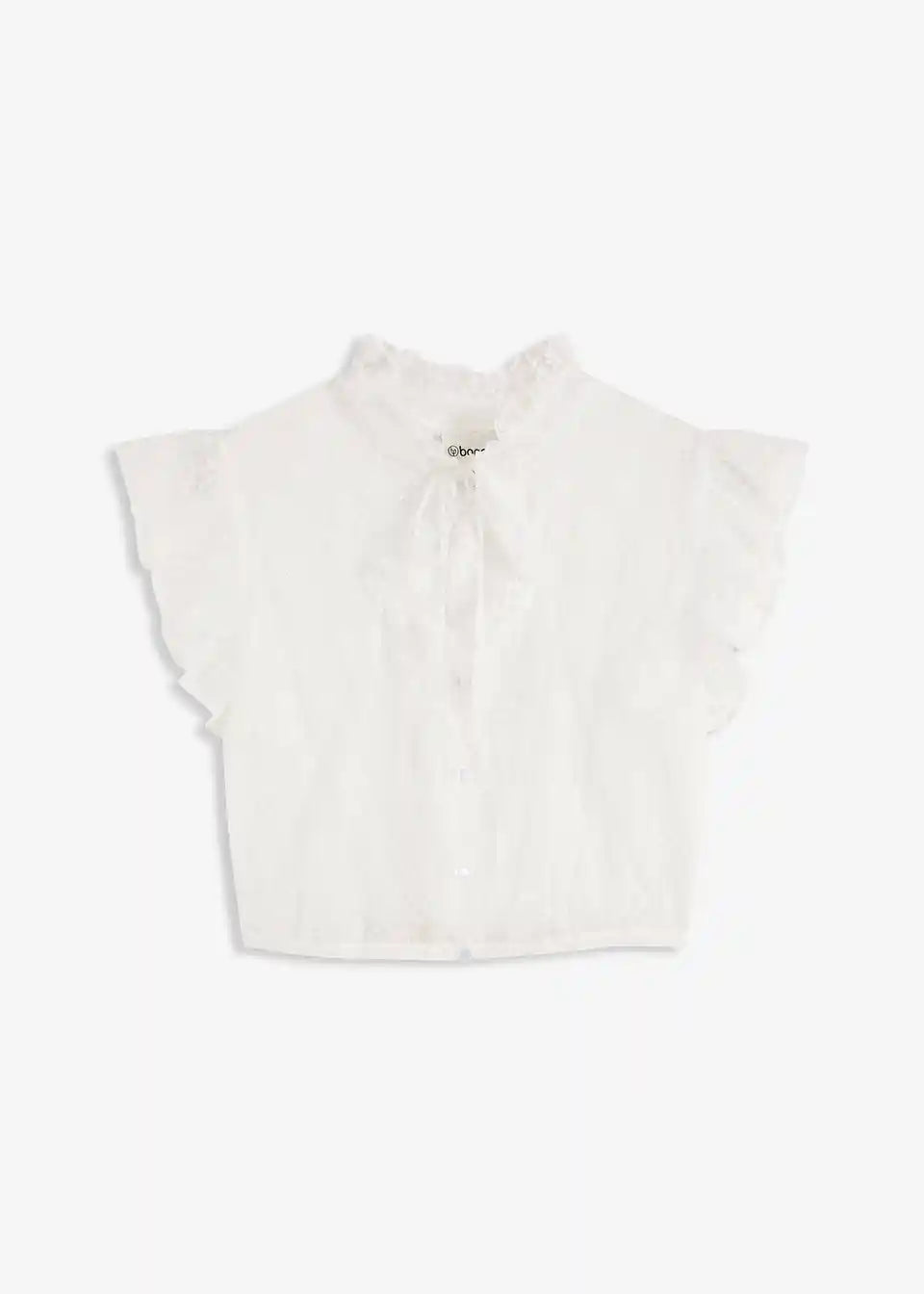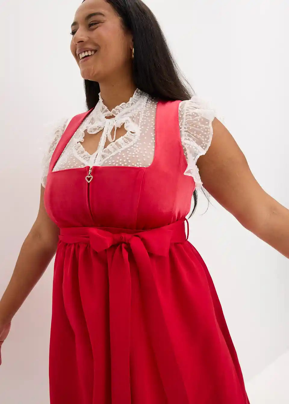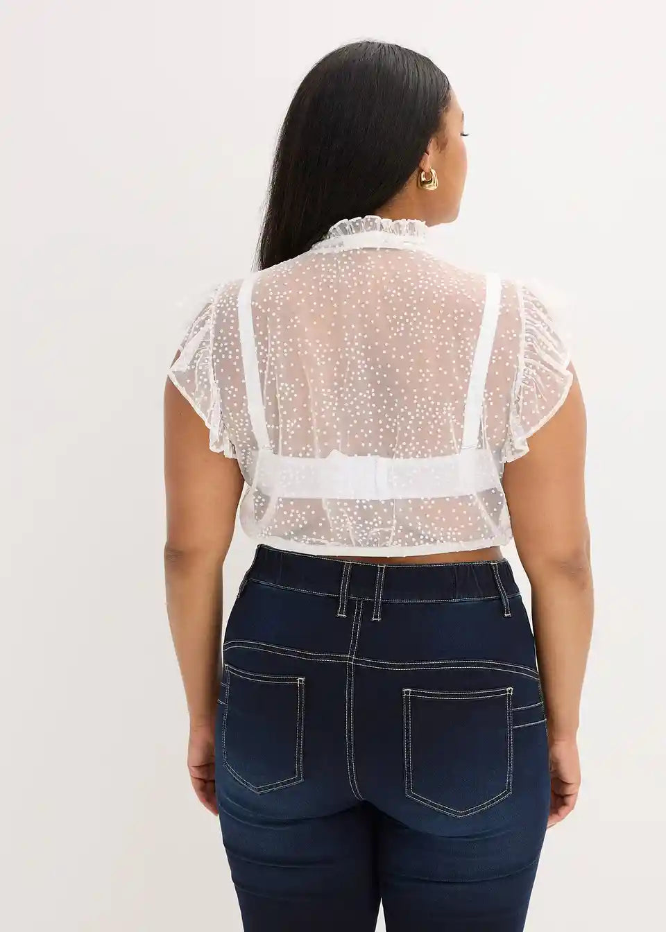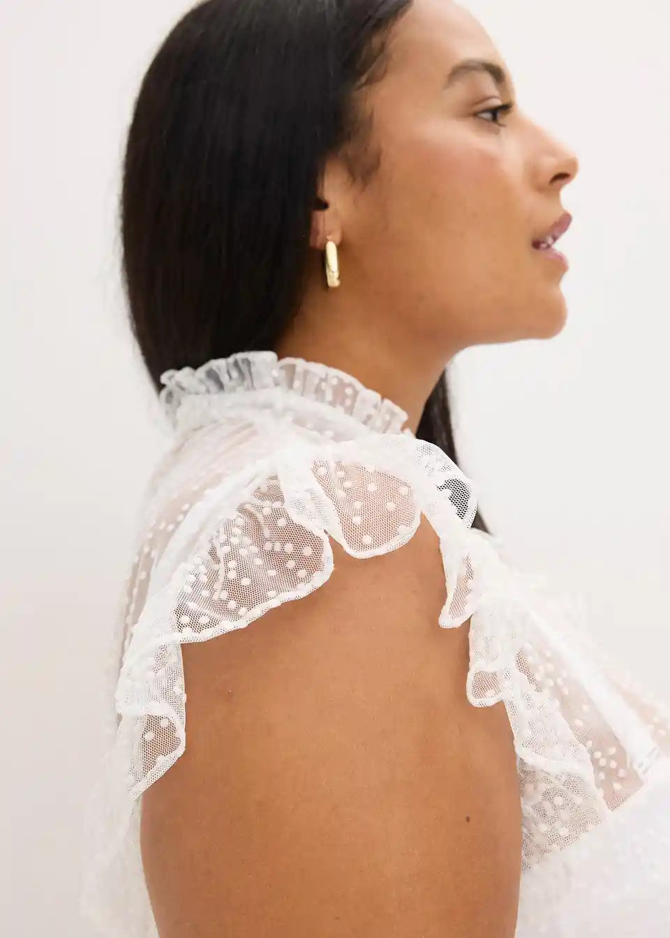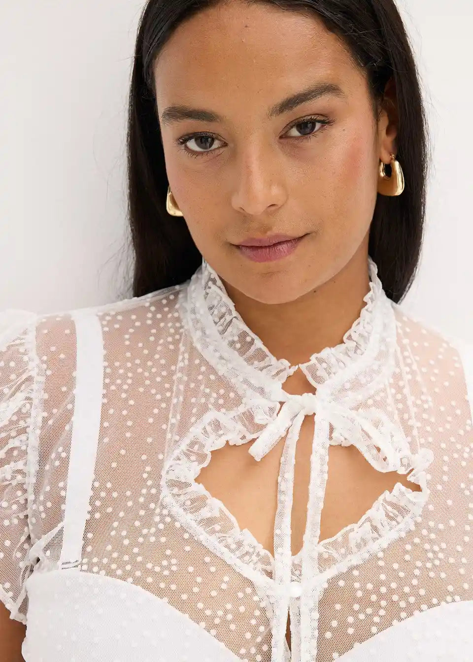 Romantična in ženstvena: prosojna dirndl bluza iz nežnega tila s pikčastim vzorcem in volančki