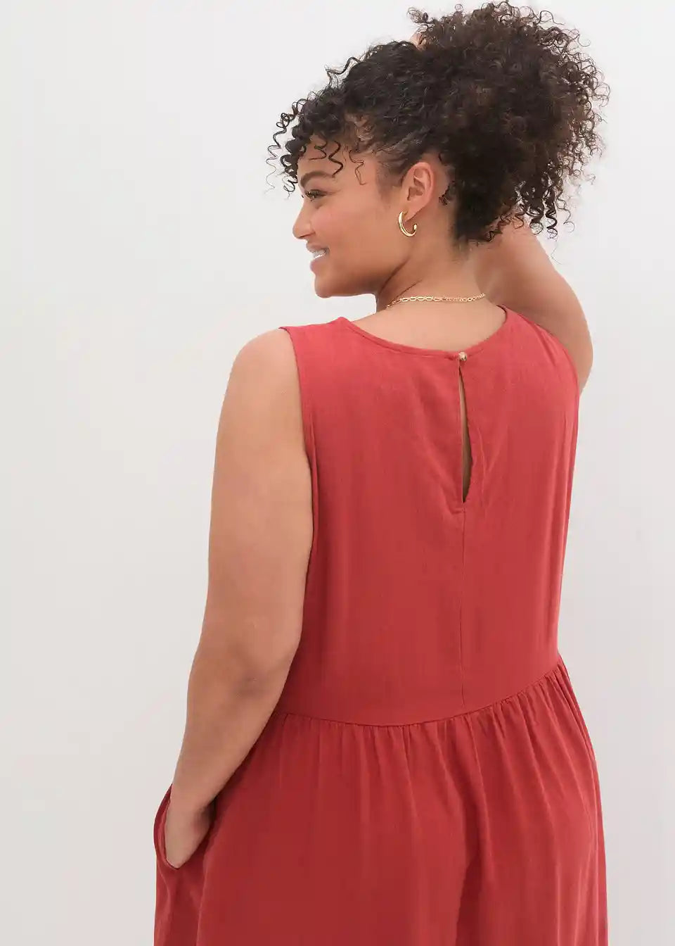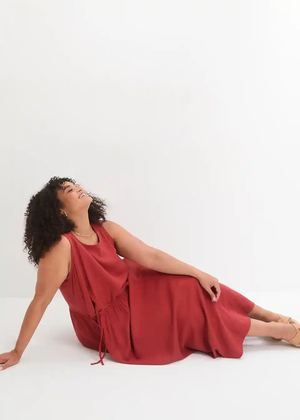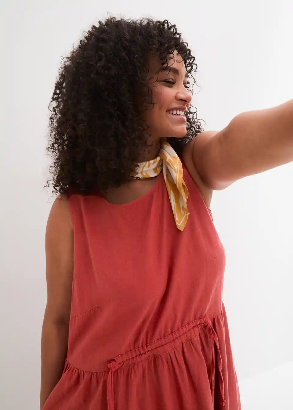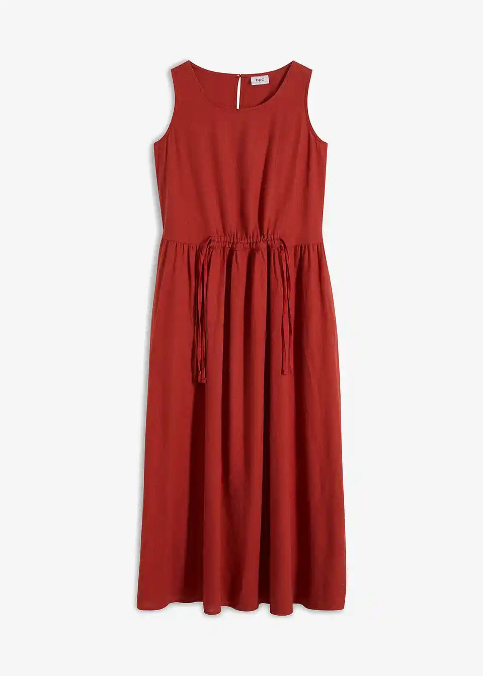 Ohlapna obleka iz lanu, ki poudari pas s pomočjo vrvice
