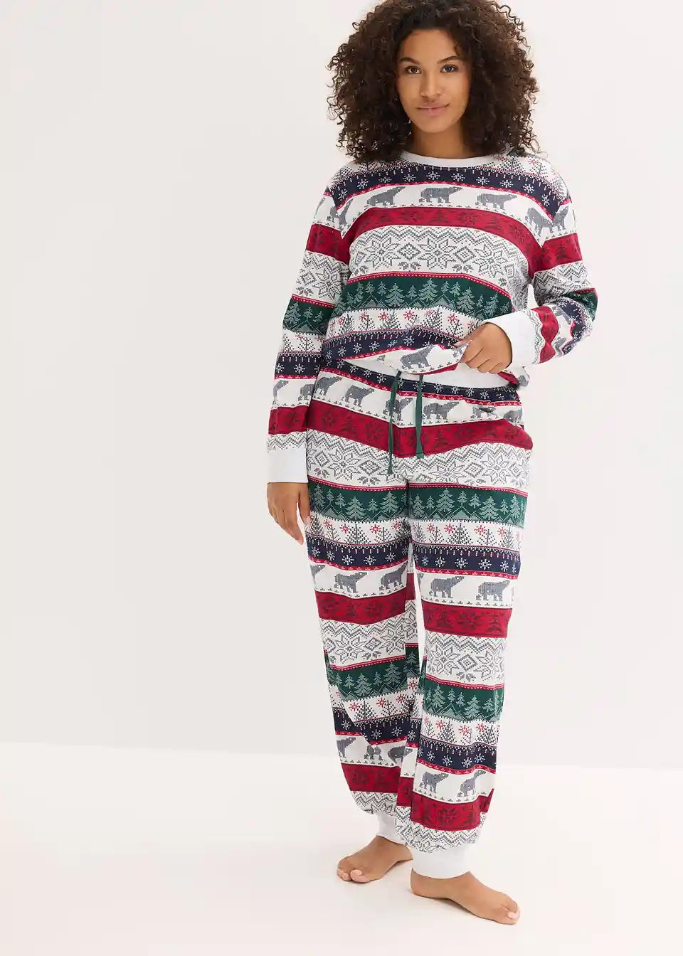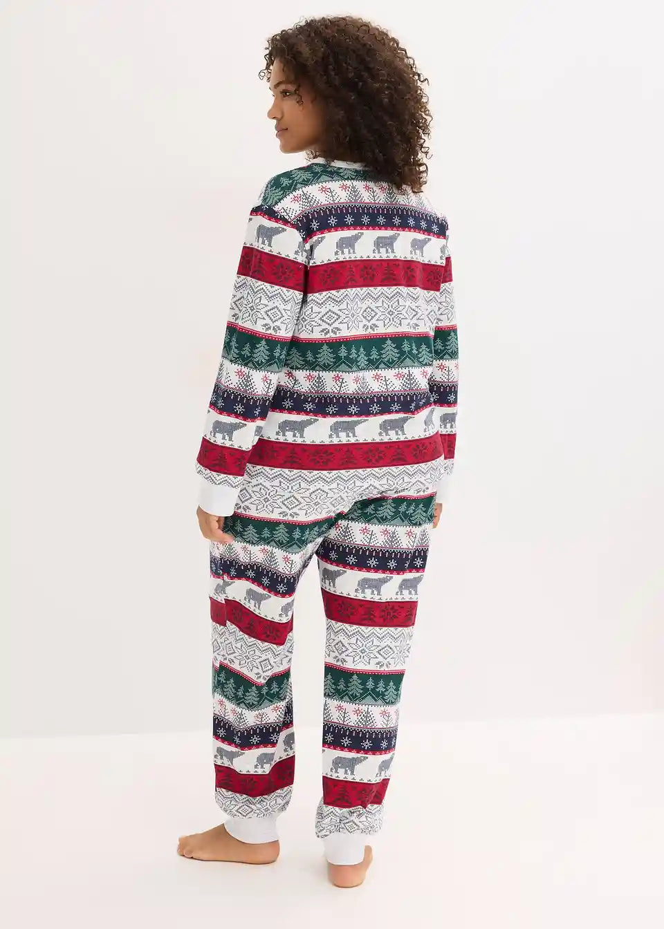 Udobna pižama z norveškim potiskom z majico z dolgimi rokavi, bolj zaprtim ovratnim izrezom in ohlapno krojenimi hlačami z všitimi žepi