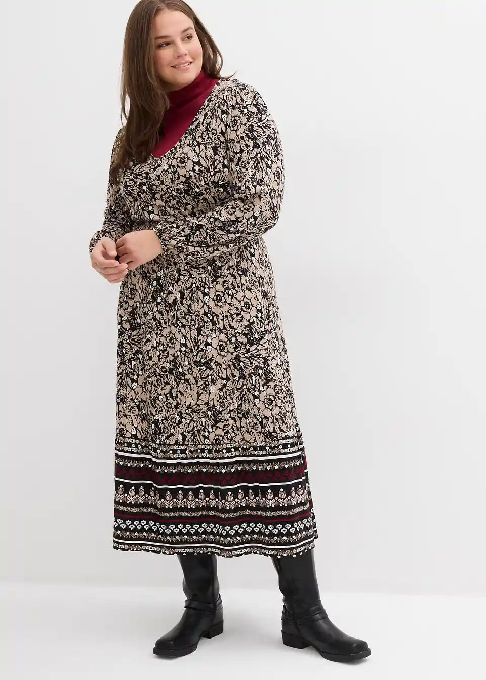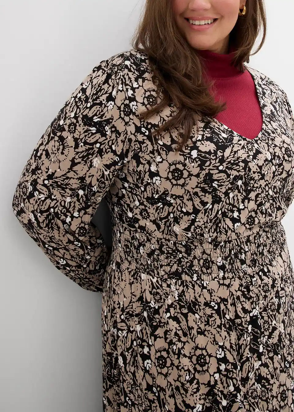 Dolga obleka z globokim V-izrezom in dolgimi balonastimi rokavi