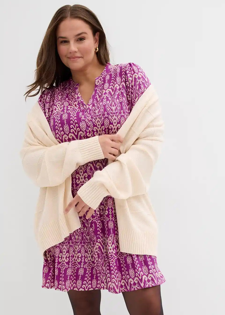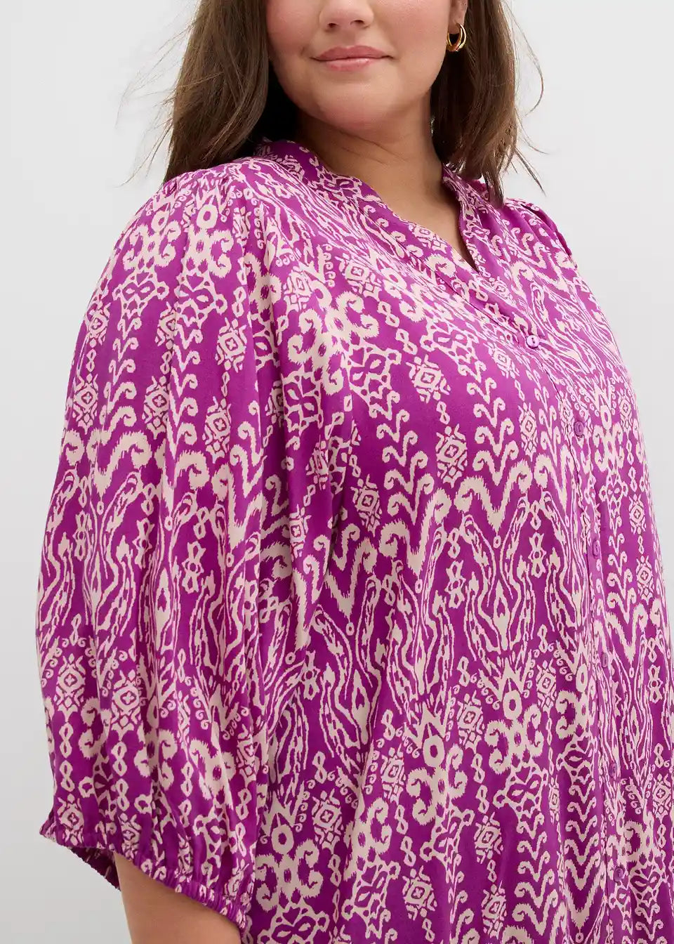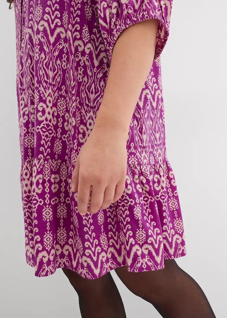 Razširjena kratka obleka s hanley okroglim ovratnim izrezom z gumbki in balonastimi rokavi