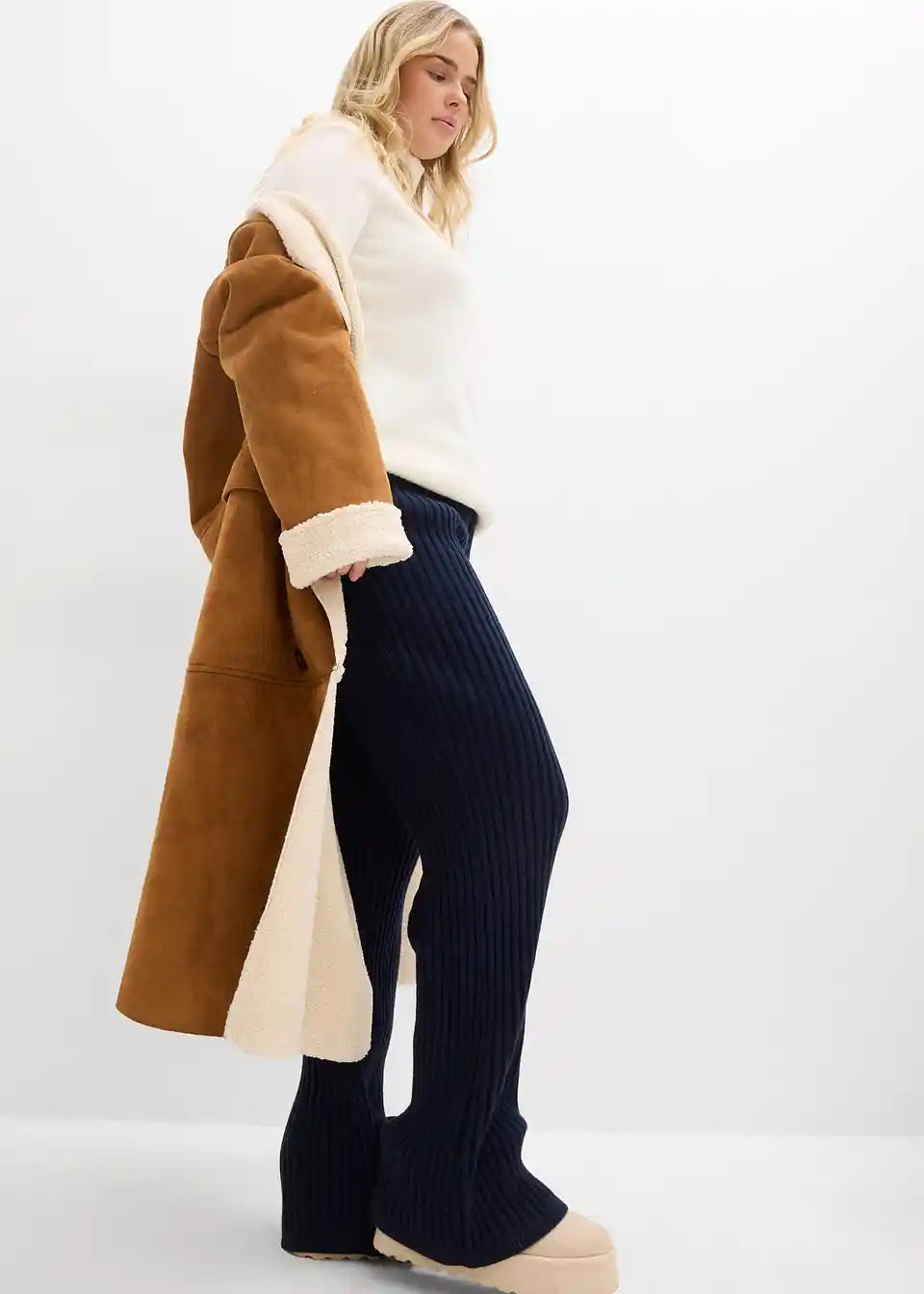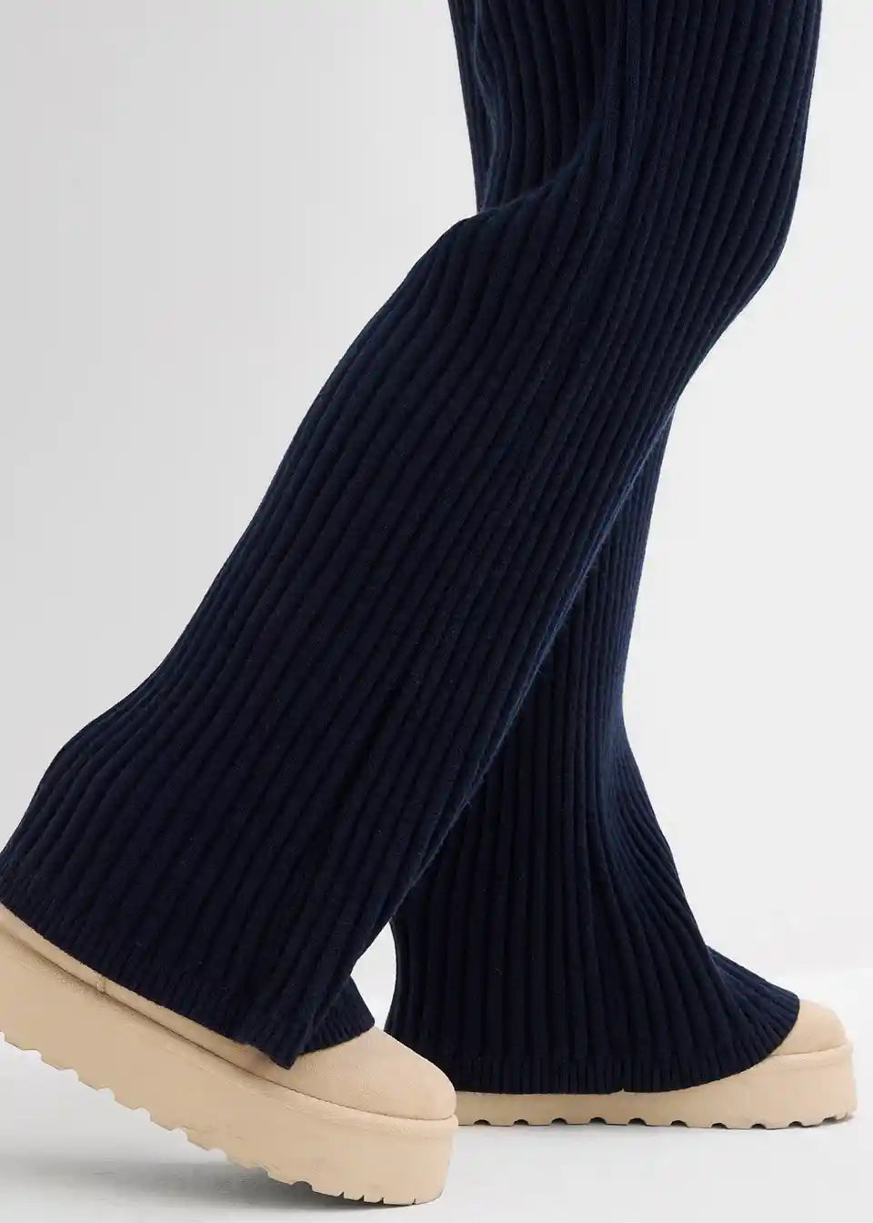 Visok model hlač z ozkimi rebrastim pasom in zakrito vpeljano elastiko.