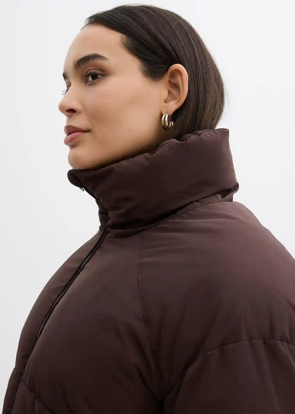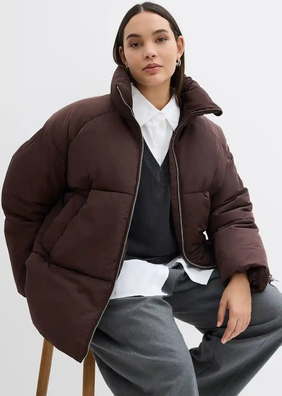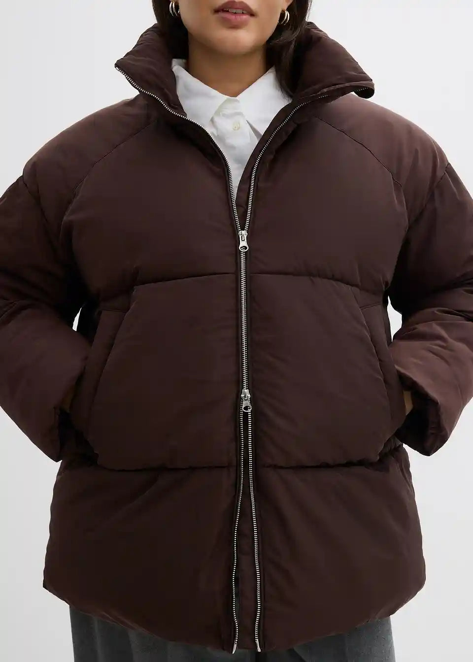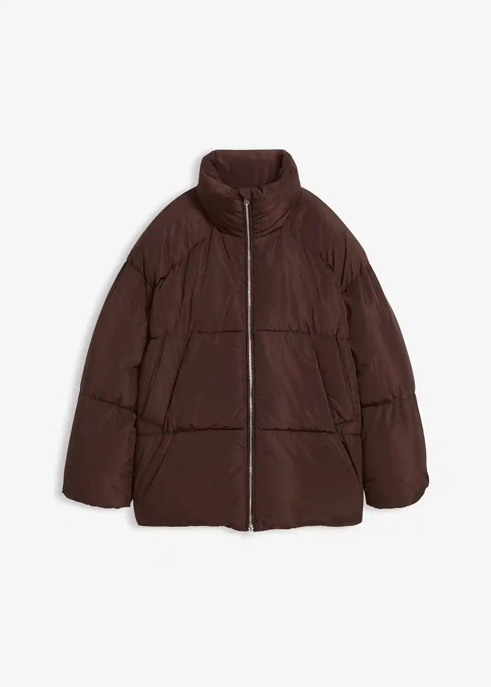 Široko krojena prešita jakna s poševnimi žepi z letvico spredaj in v rokave podaljšanimi ramami
